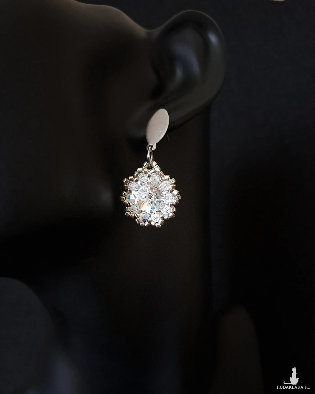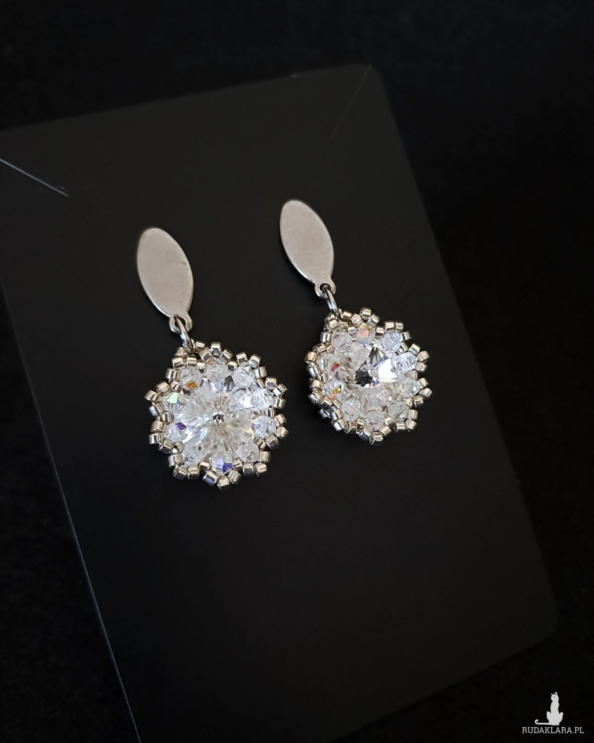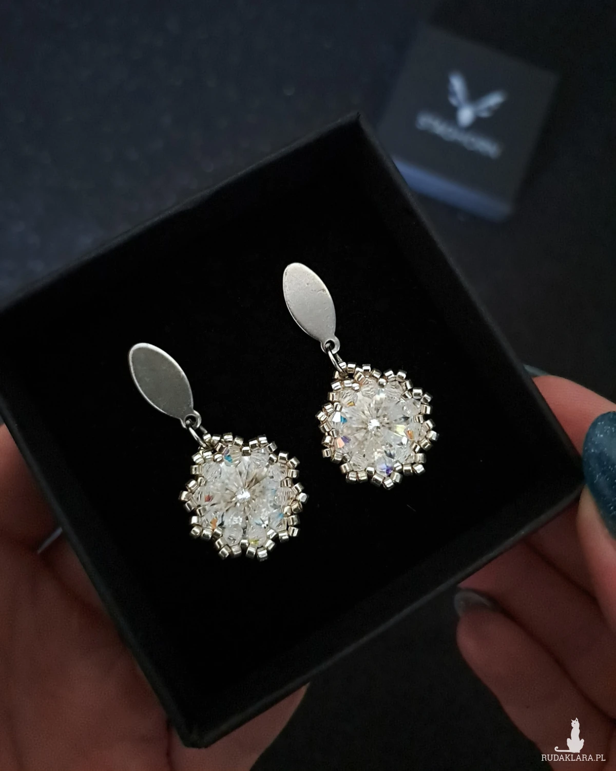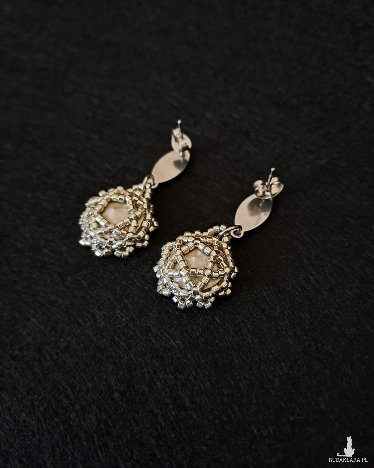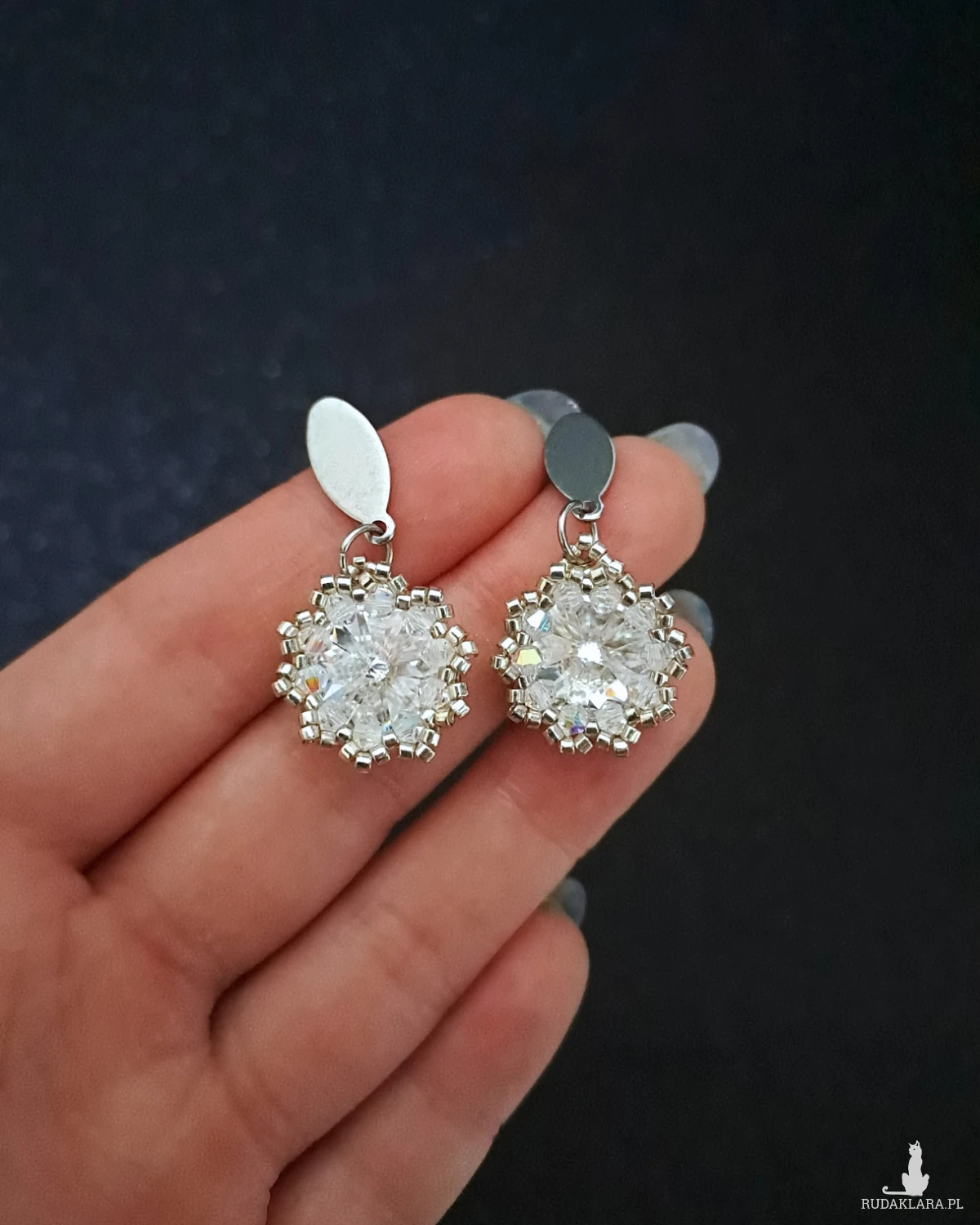 - Dookoła – ręcznie osadzane fasetowane kryształki Preciosa Bicone 3 mm oraz srebrne koraliki Miyuki Delica, tworzące ażurowy, elegancki szkielet.