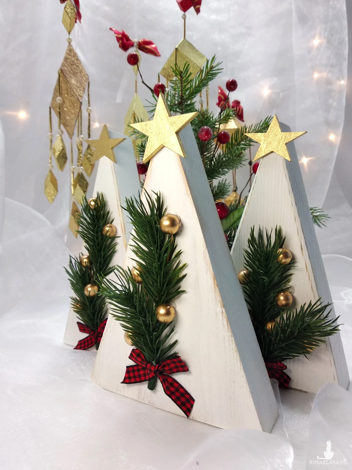 Ręcznie wykonane miniaturowe choinki to wyjątkowa ozdoba, która wprowadzi do Twojego domu świąteczną atmosferę. Każda choinka została starannie wykonana z drewna i ozdobiona sztucznymi gałązkami świerku, złotymi kuleczkami oraz elegancką, czerwoną kokardką. Idealne jako dekoracja stołu, komody czy półki. Pięknie prezentują się na parapecie okna ozdobione małymi światełkami. Mogą być częścią większej kompozycji np. postawione wśród domków śnieżnych z moich innych aukcji.