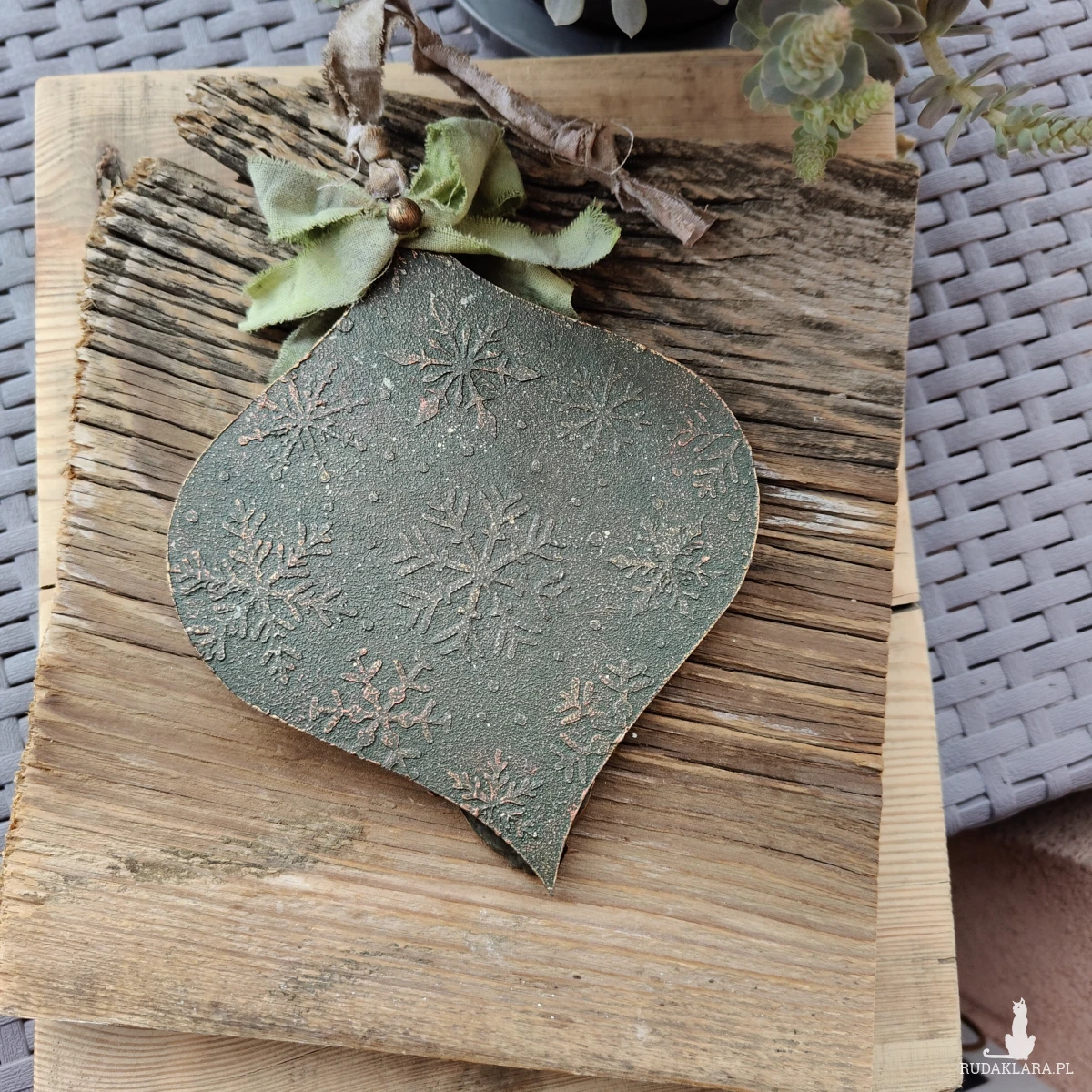 - Ozdobiona zieloną kokardą i materiałową tasiemką do zawieszenia