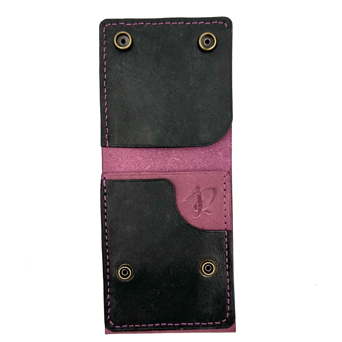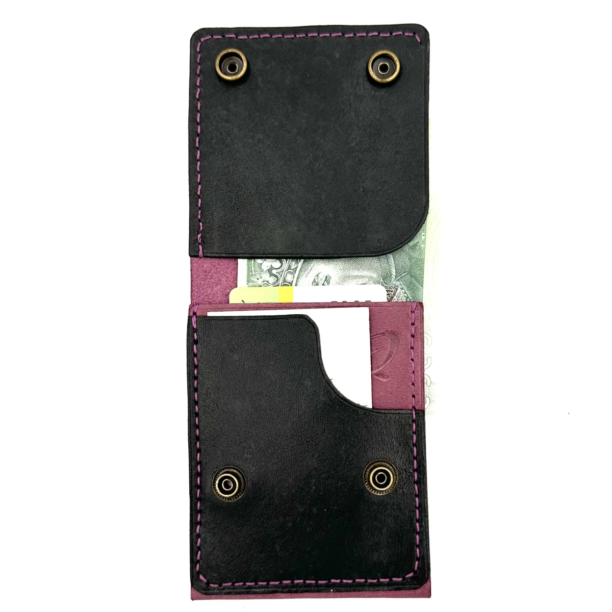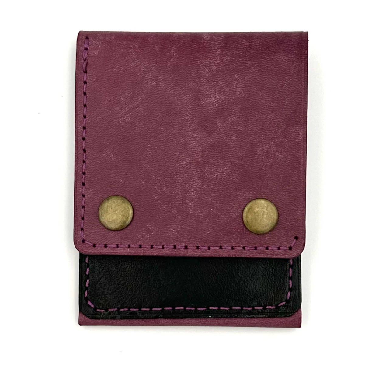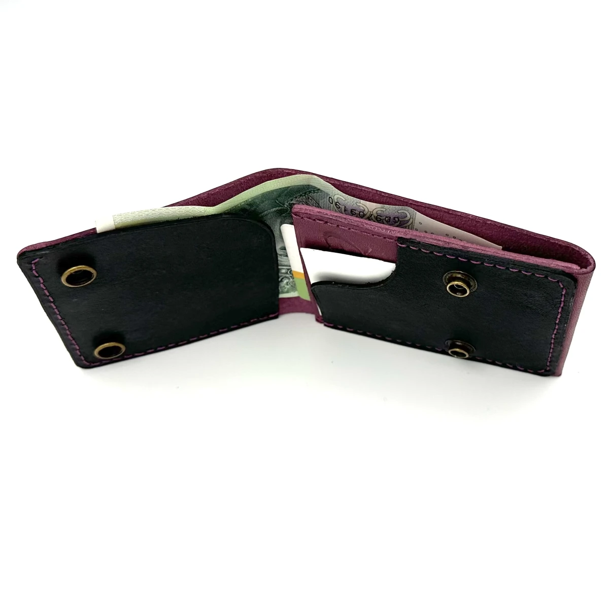 Portfel w kolorze na zewnątrz fioletowym w środku czarnym. Nici kolor czarny.