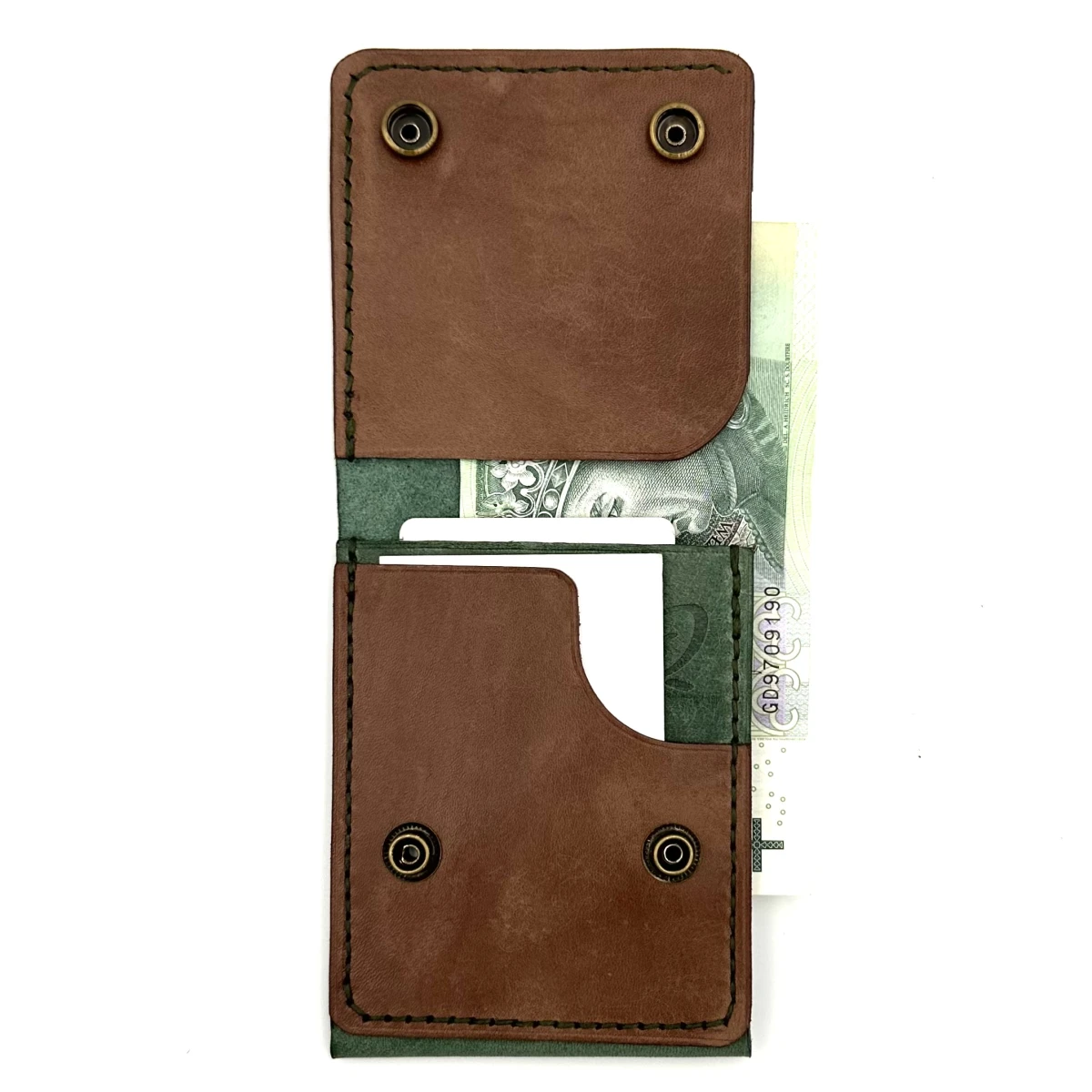 Portfel w kolorze na zewnątrz zielonym w środku brązowy. Nici koloru zielonego.