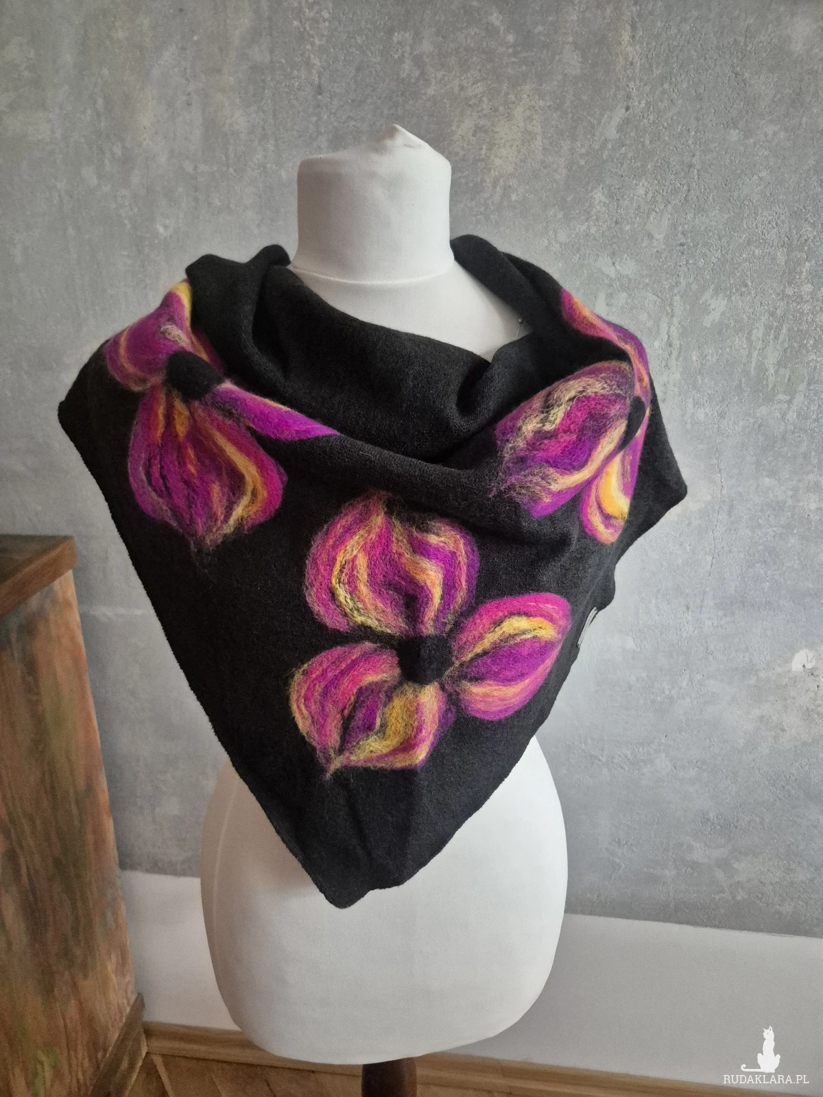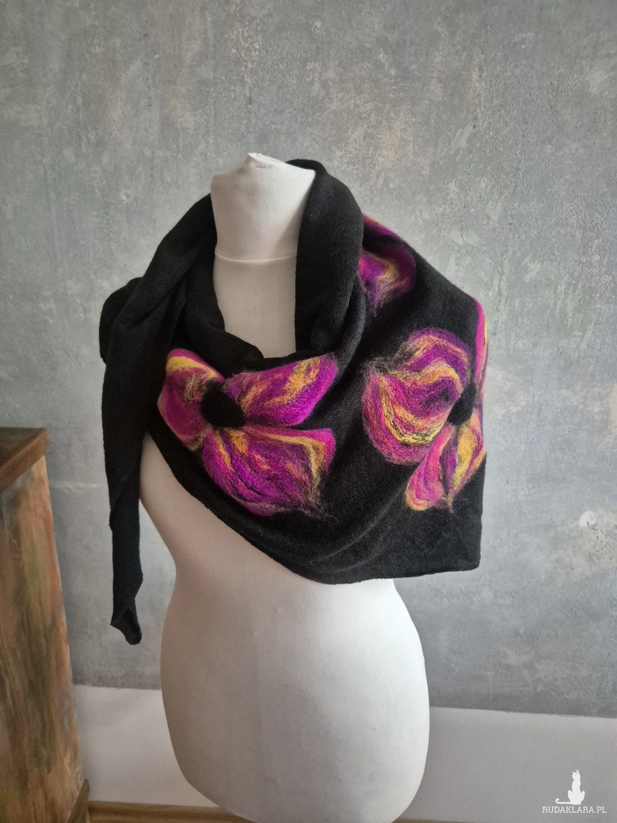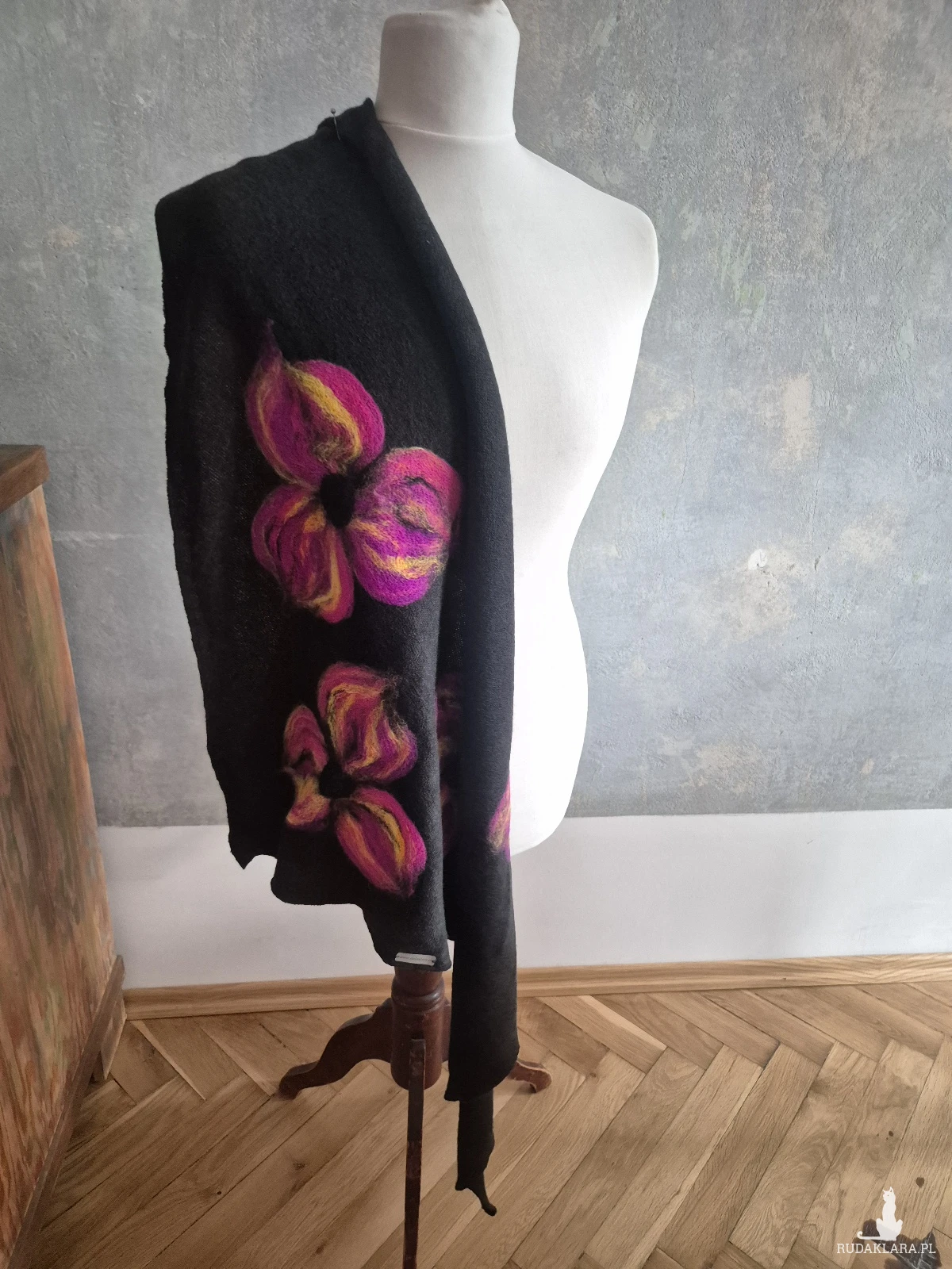 Czarna chusta handmade wełniana, elementy filcowane to wełna merynosów, produkt wysokiej jakości, chusta miła i ciepła, doskonała na chłodne dni, idealna na prezent, wspaniała na codzienne noszenie, zwraca uwagę swą oryginalnością, miękko układa się wokół szyi, absolutny bestseller polecam czas oczekiwania tydzien box a1