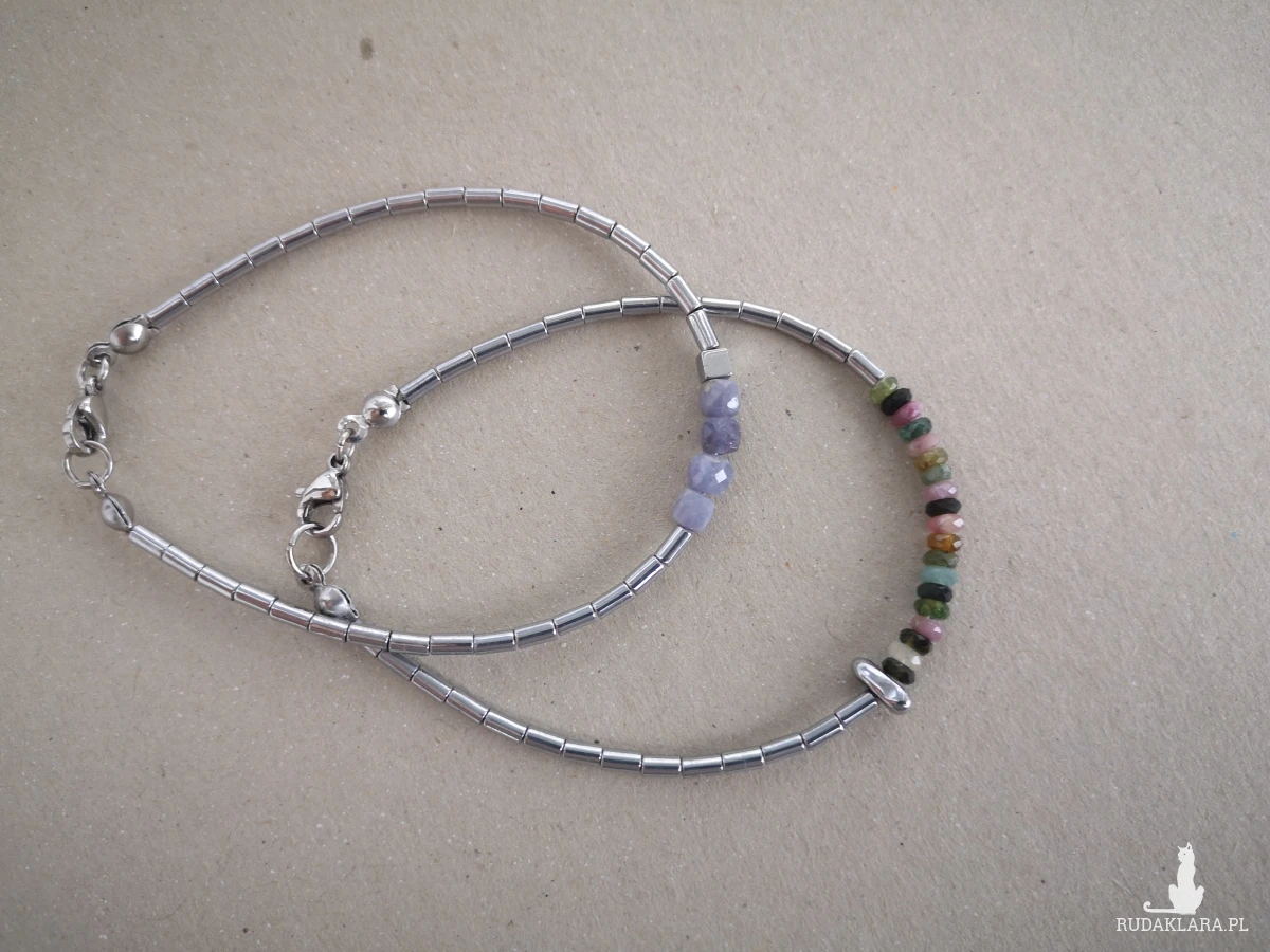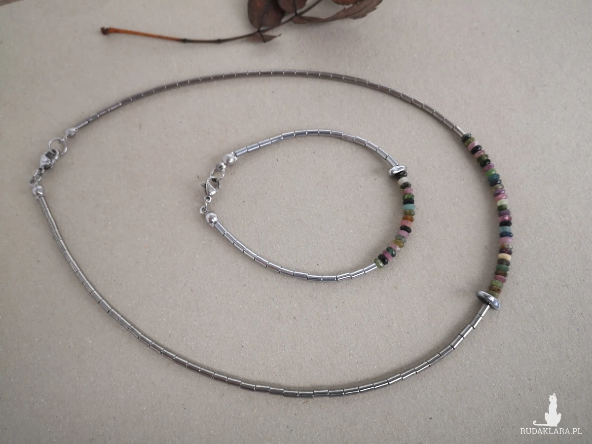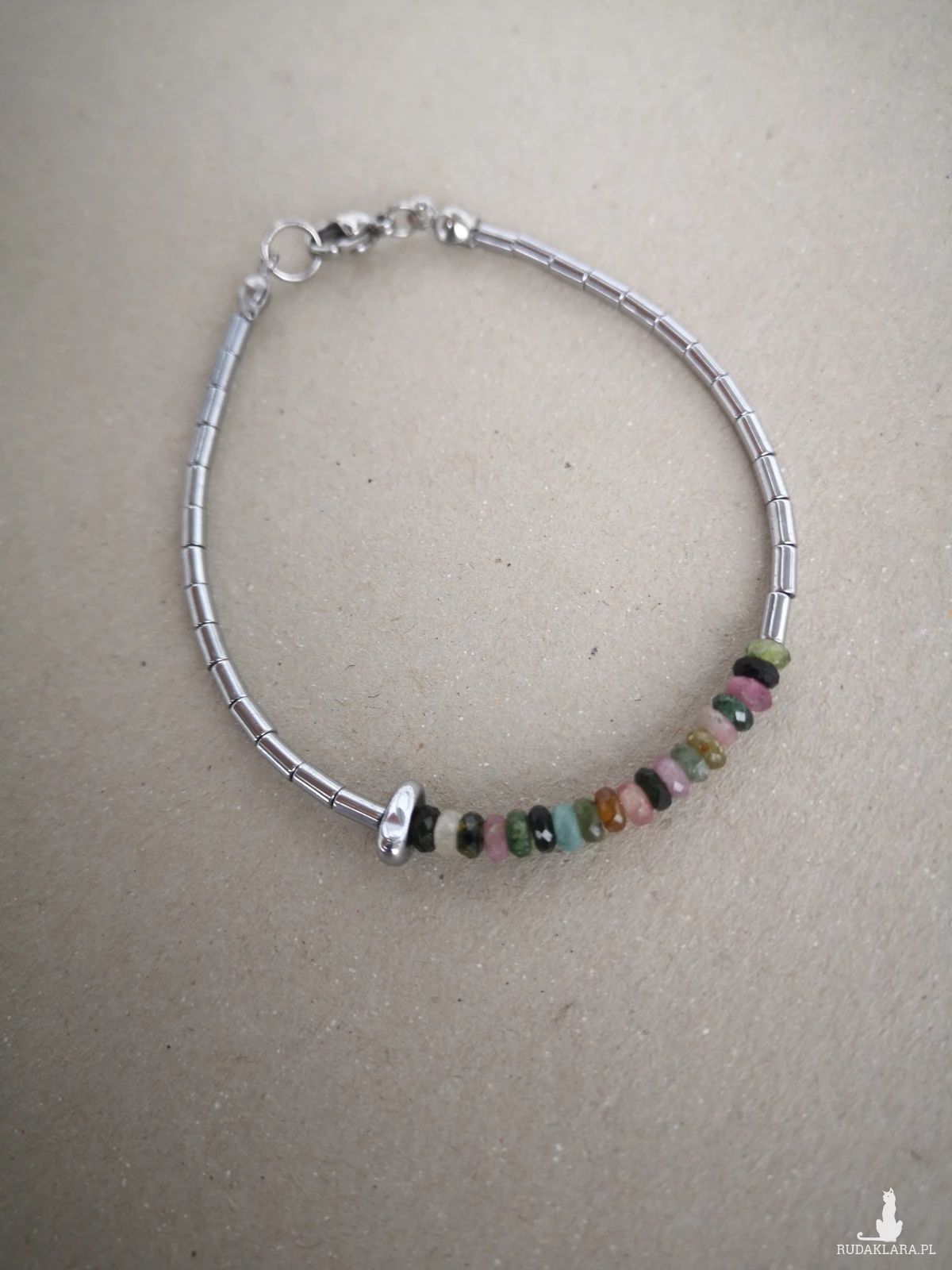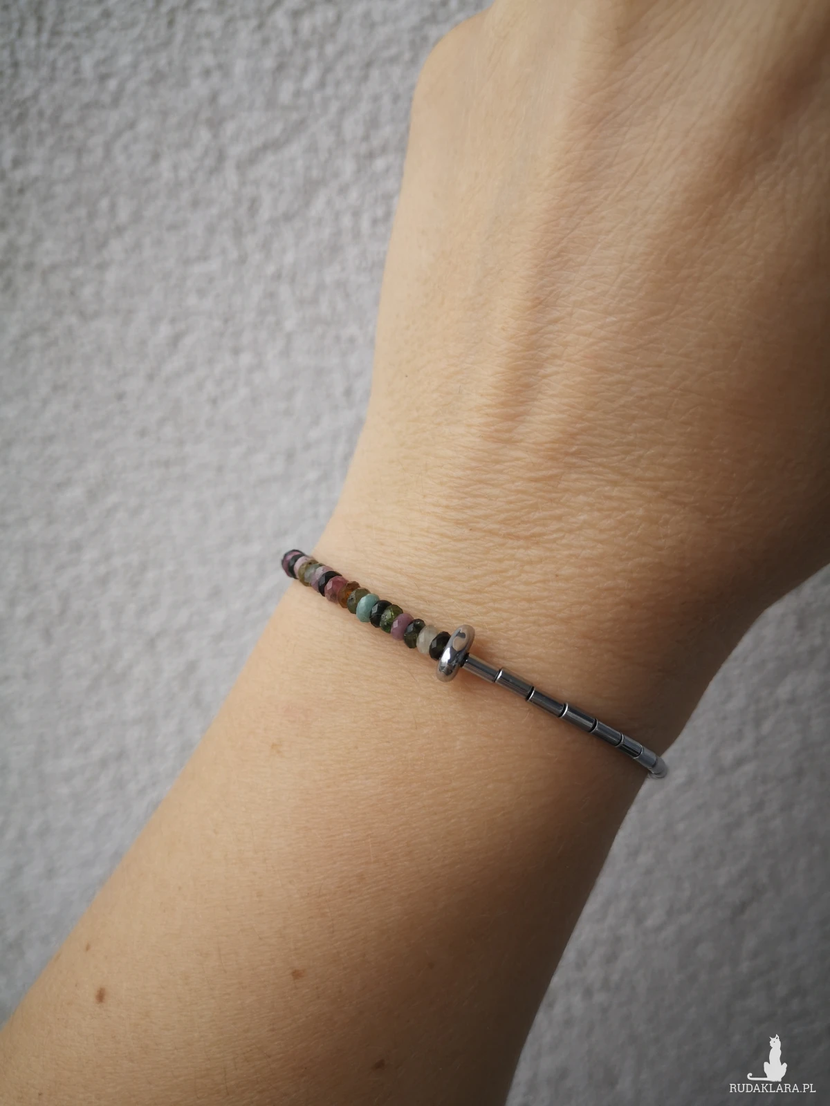 Bransoletka z hematytem i kolorowym turmalinem, zakończenia stal, na nadgarstek 17 cm.