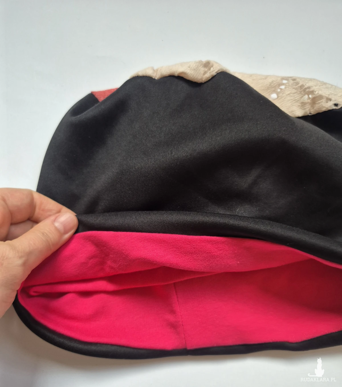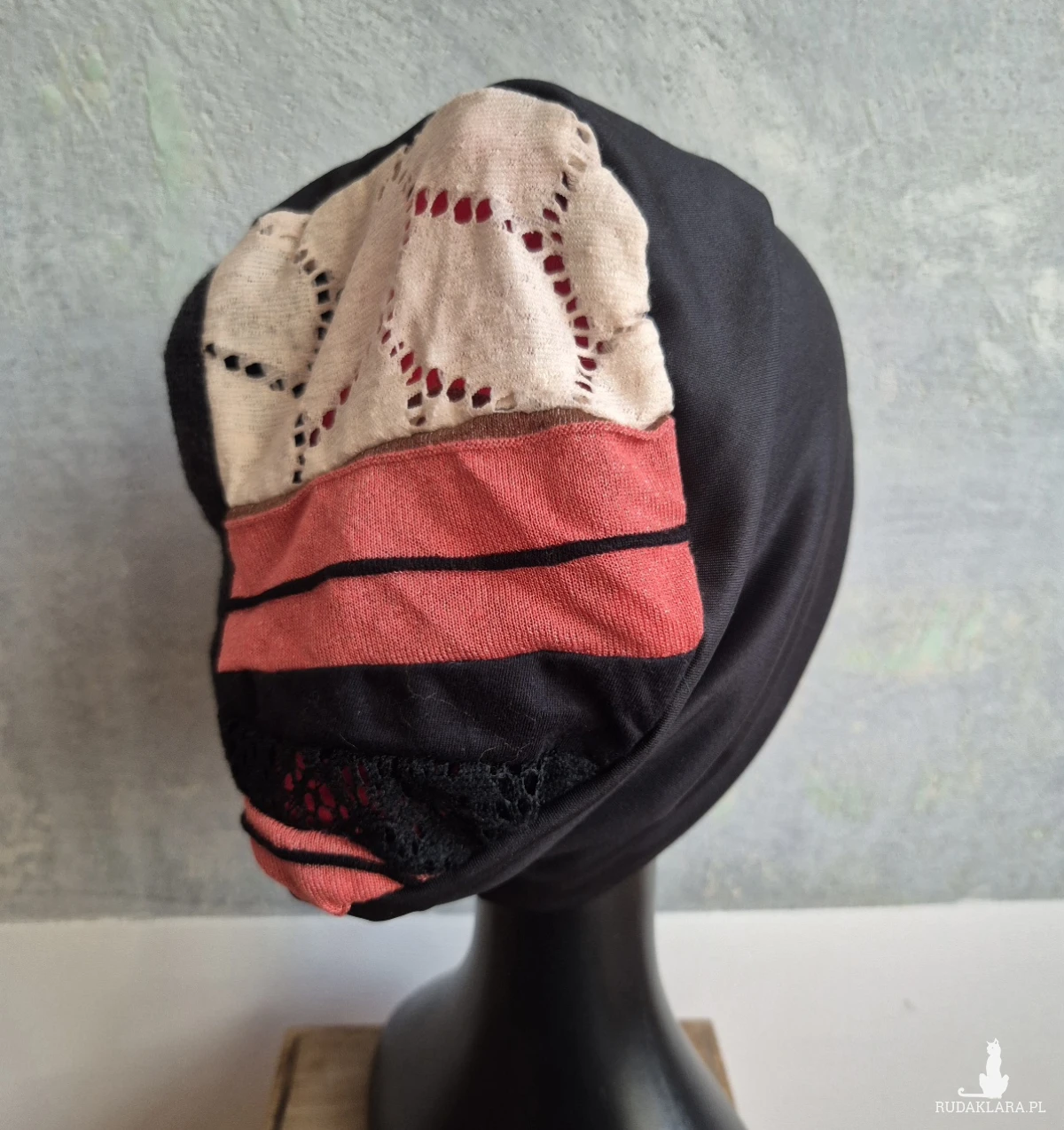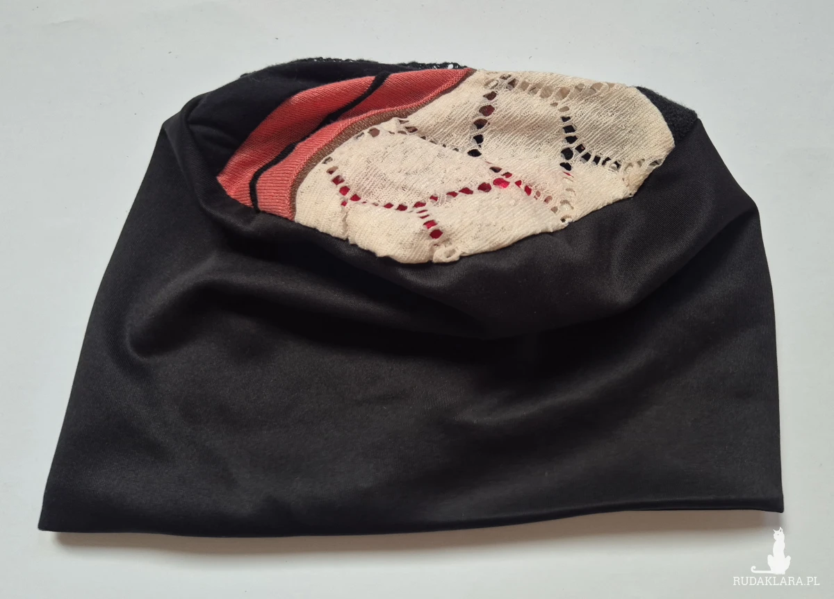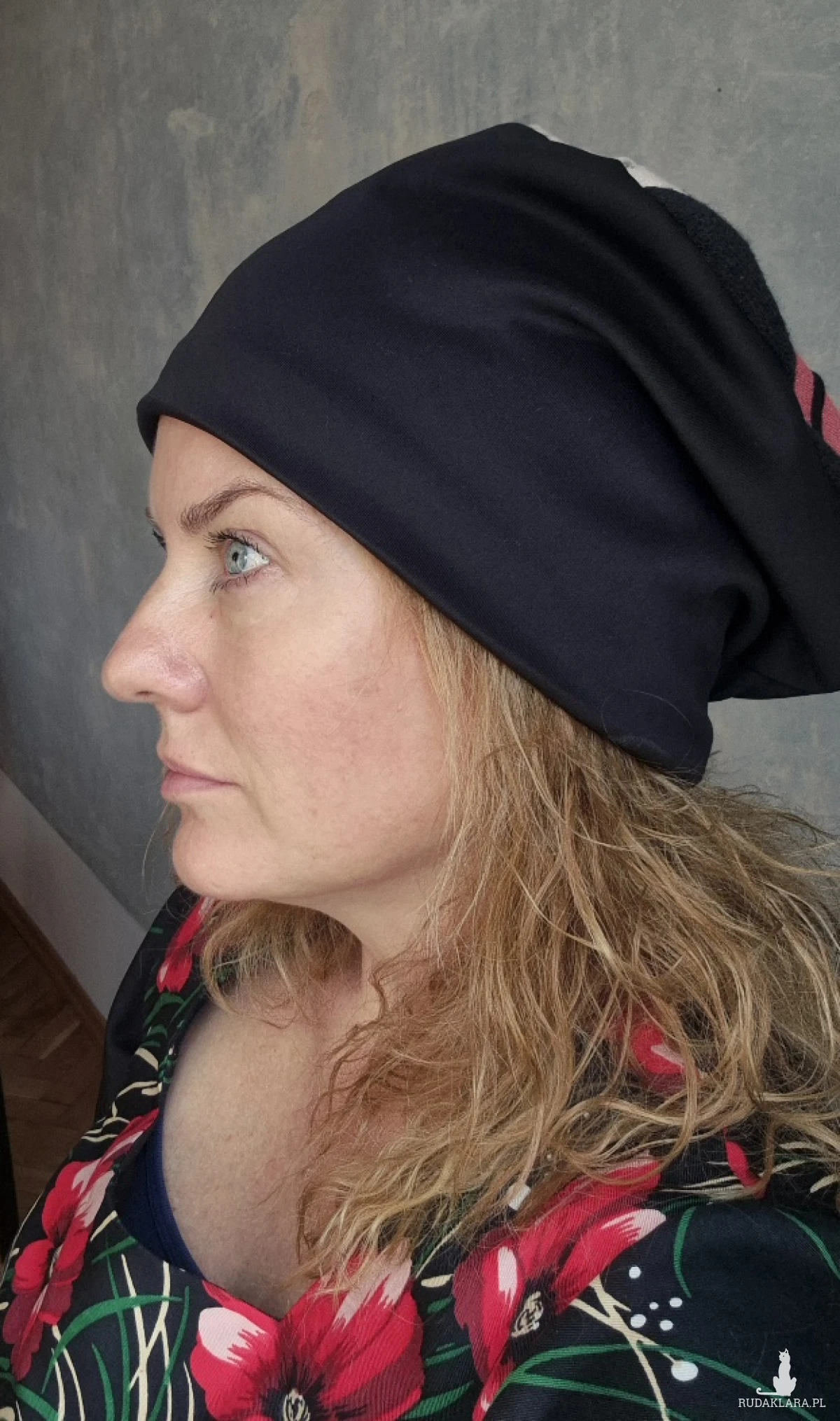 Czapka czarna gora kolorowa na podszewce rozmiar uniwersalny ciepła i miła wykonana w pojedynczym egzemplarzu rękodzieło polecam boks A1