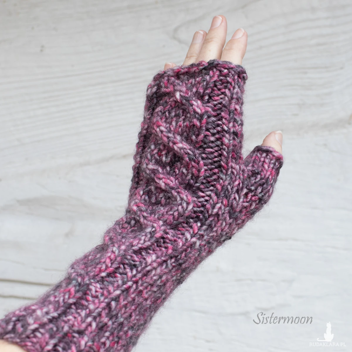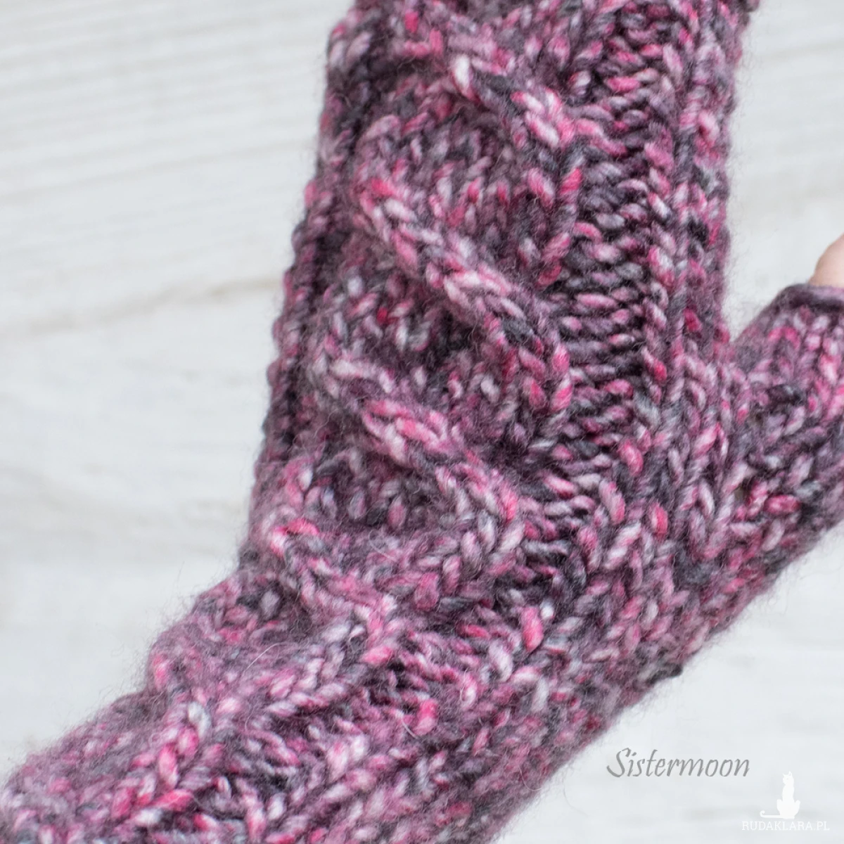 Długie mitenki z warkoczem w pięknych kolorach: melanżowy przecierany róż i czerwień. Gruba włóczka: 20% wełna, 80% akryl. Mitenki są miękkie, bardzo miłe w dotyku, nie powinny gryźć. Dopasowują się do dłoni.