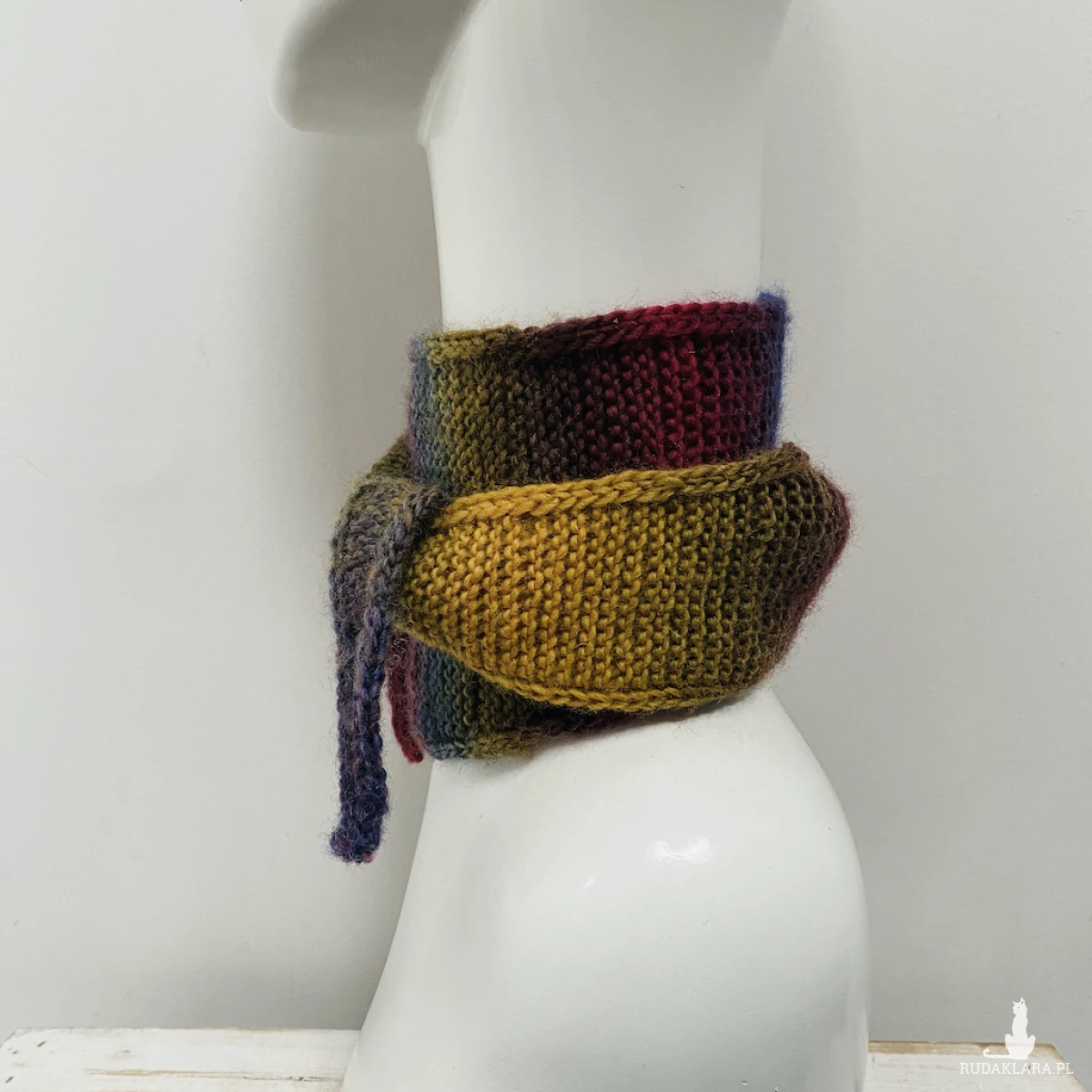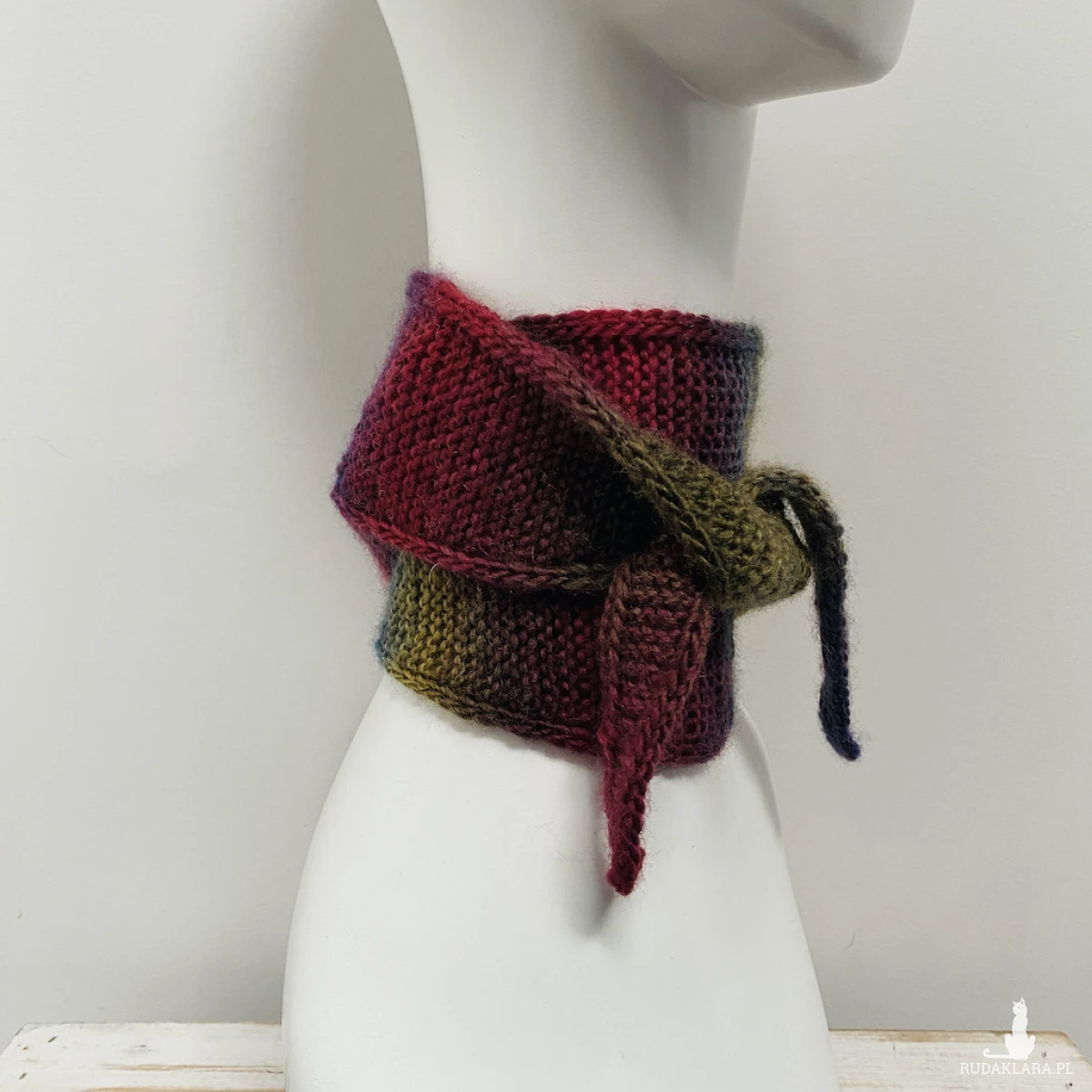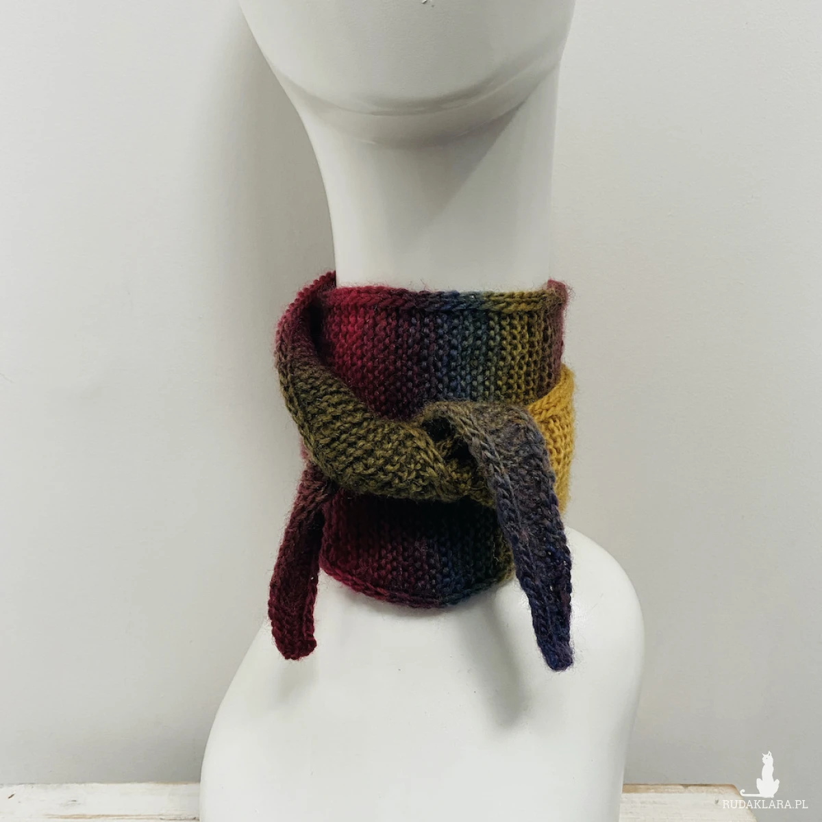 Mini szalik - apaszka wykonany w całości ręcznie na drutach z miękkiej, kolorowej, naturalnej wełny 100%, otula szyję delikatnie i komfortowo, nie gryząc i nie drażniąc skóry.