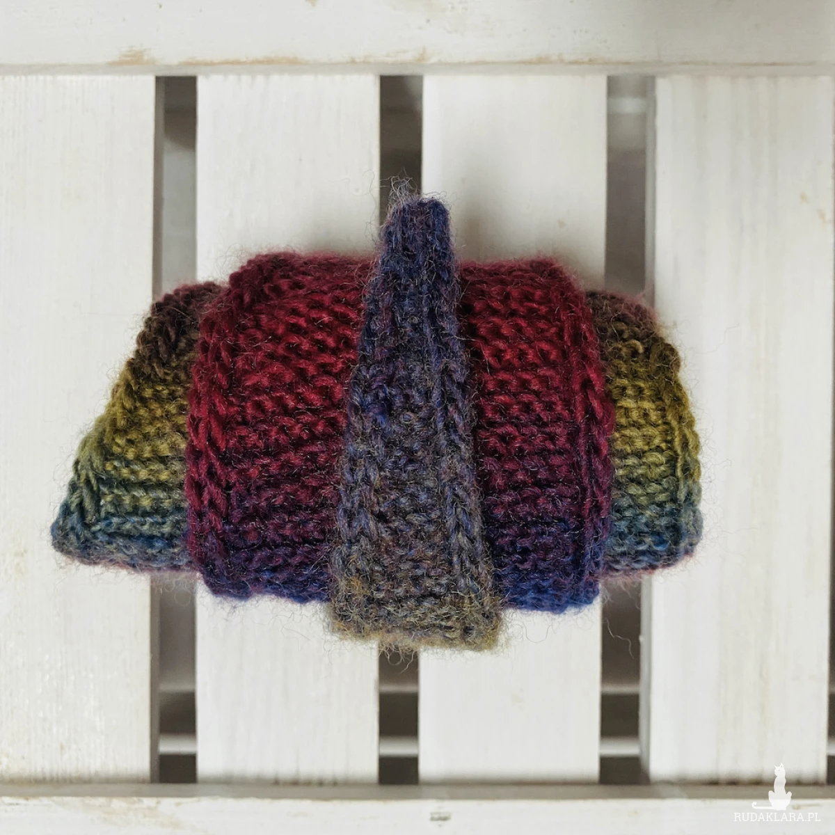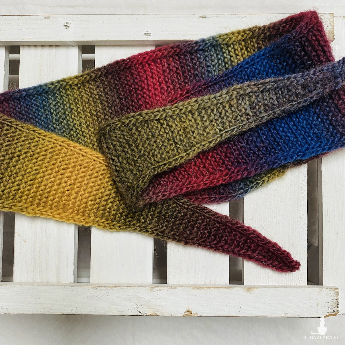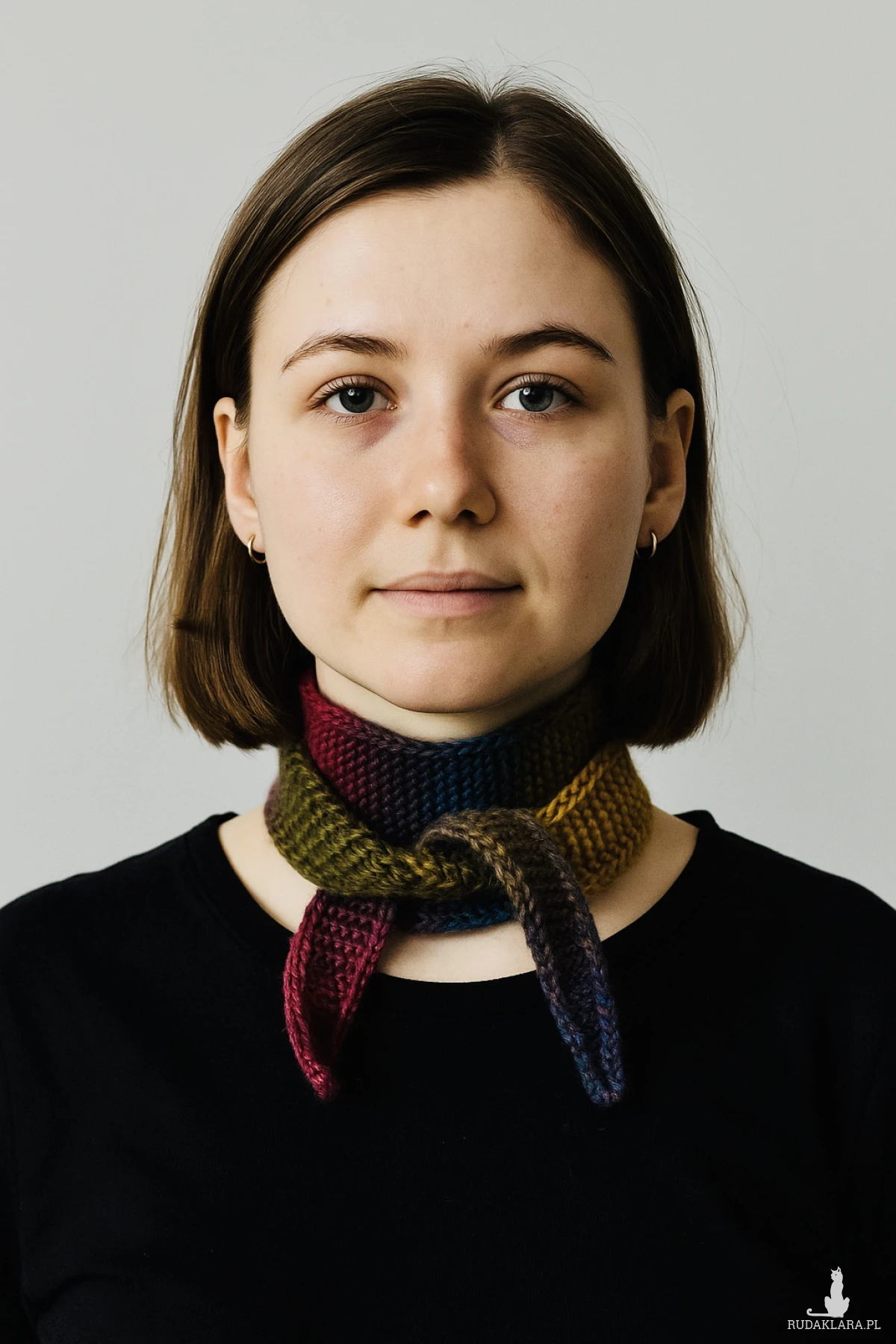 Mini szalik - apaszka wykonany w całości ręcznie na drutach z miękkiej, kolorowej, naturalnej wełny 100%, otula szyję delikatnie i komfortowo, nie gryząc i nie drażniąc skóry.