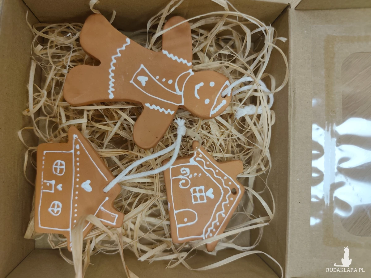 Pierniczki ceramiczne dwustronne w świątecznym opakowaniu do zawieszenia na choince. Ludzik ciacho 10 cm, domek 5x7 cm, serduszko 4,5x4,5cm. Polecam.