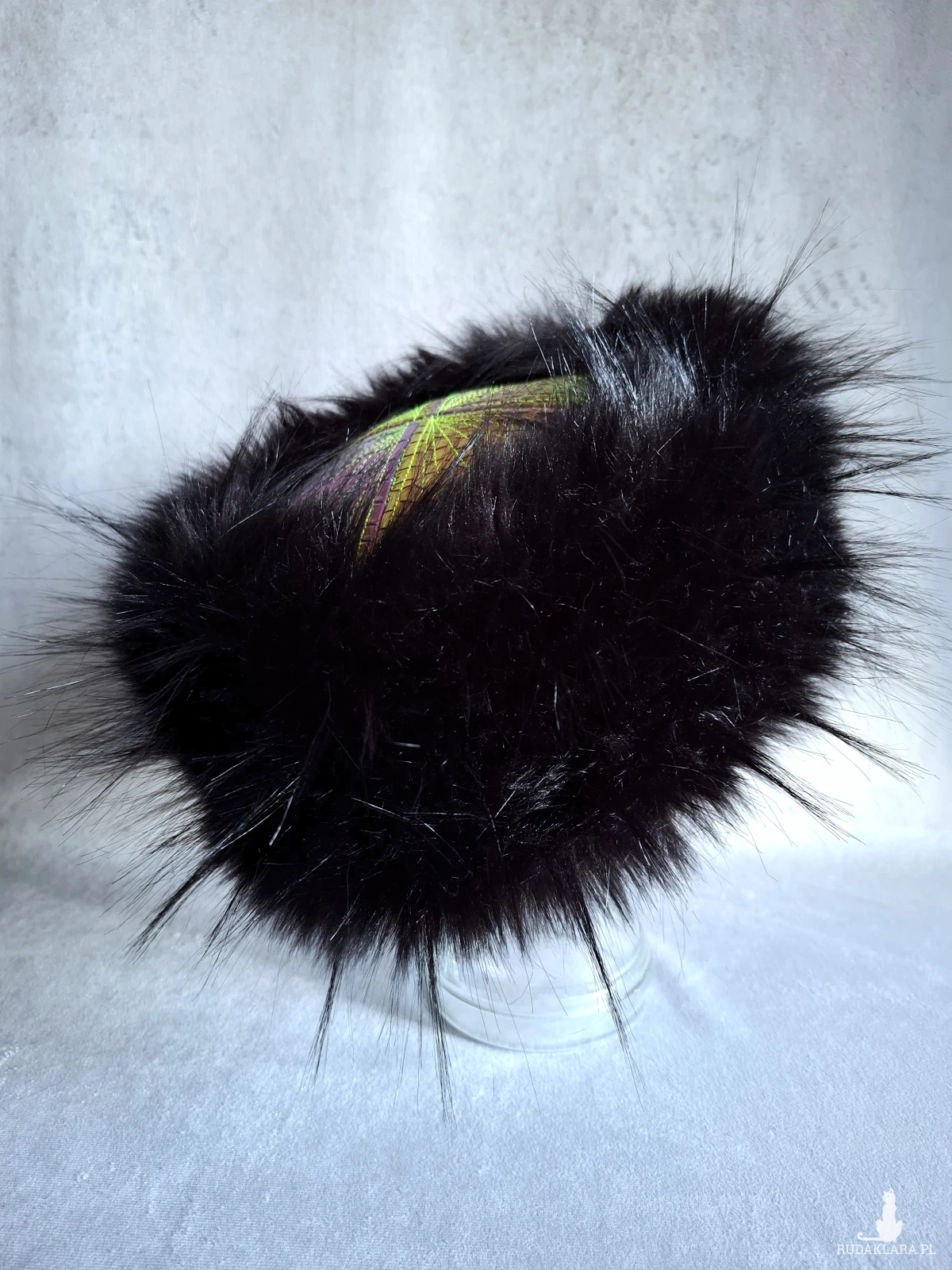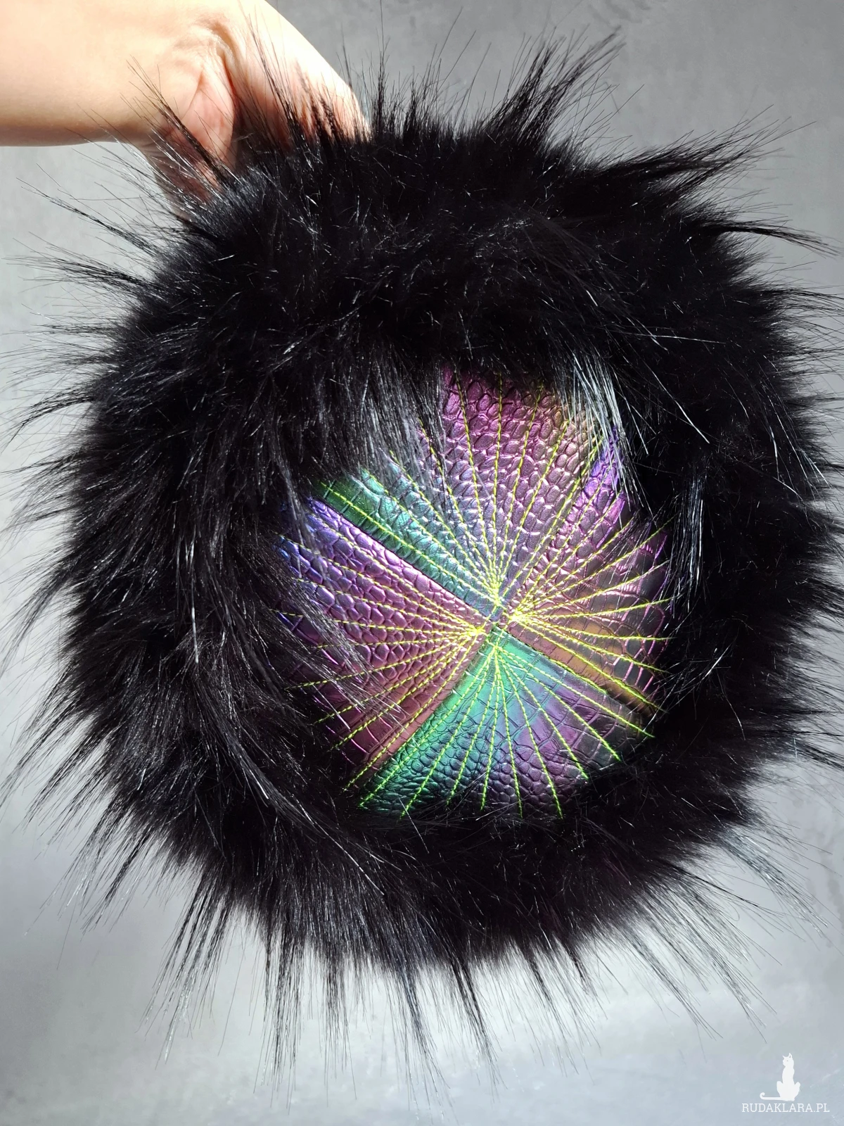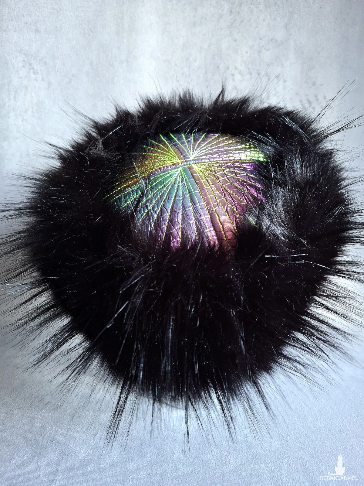 Futrzany toczek z tęczowymi elementami i zieloną satynową podszewką 🌿