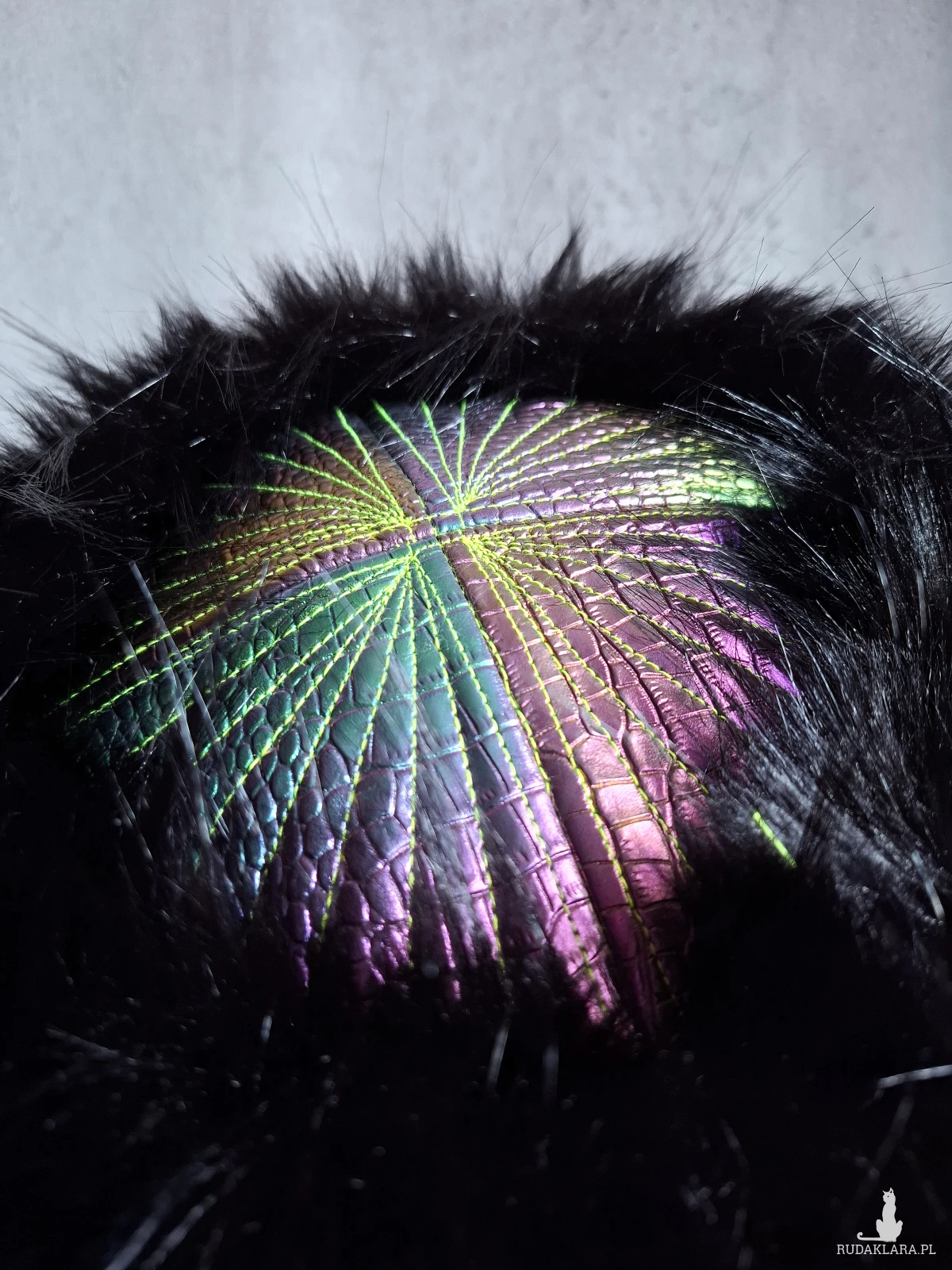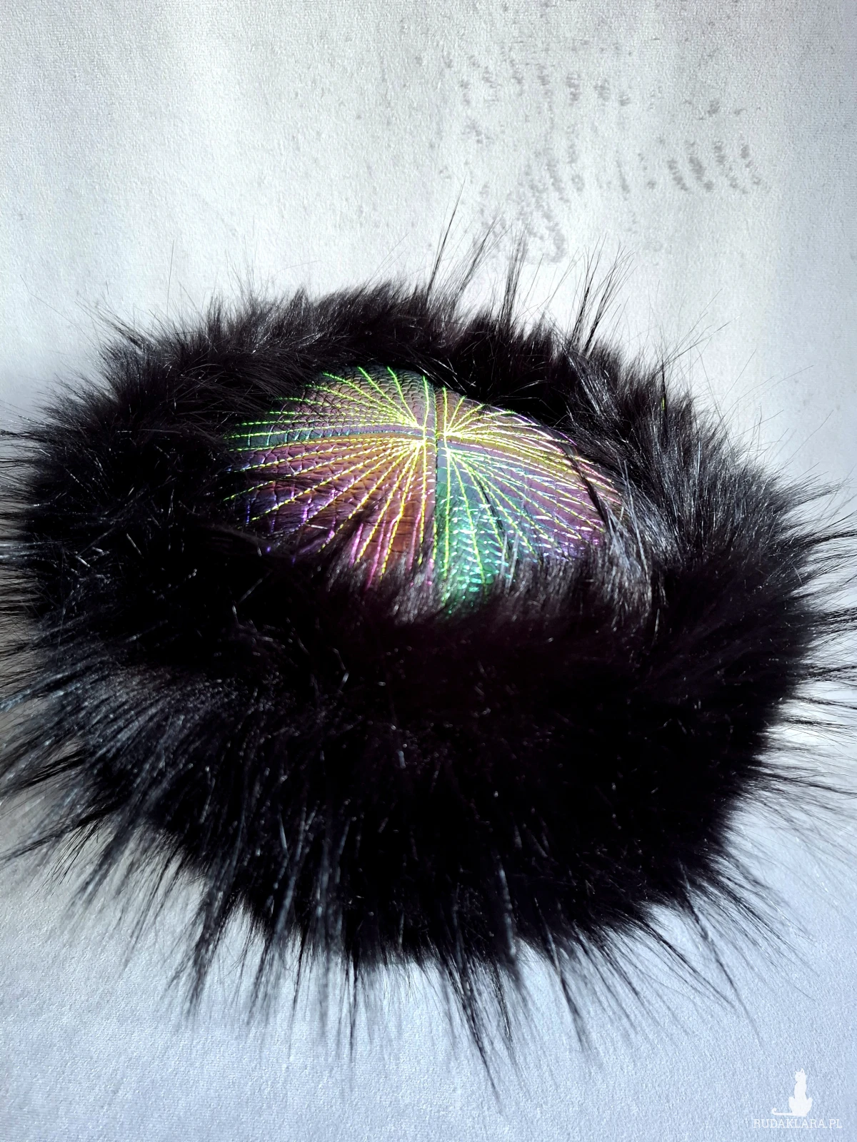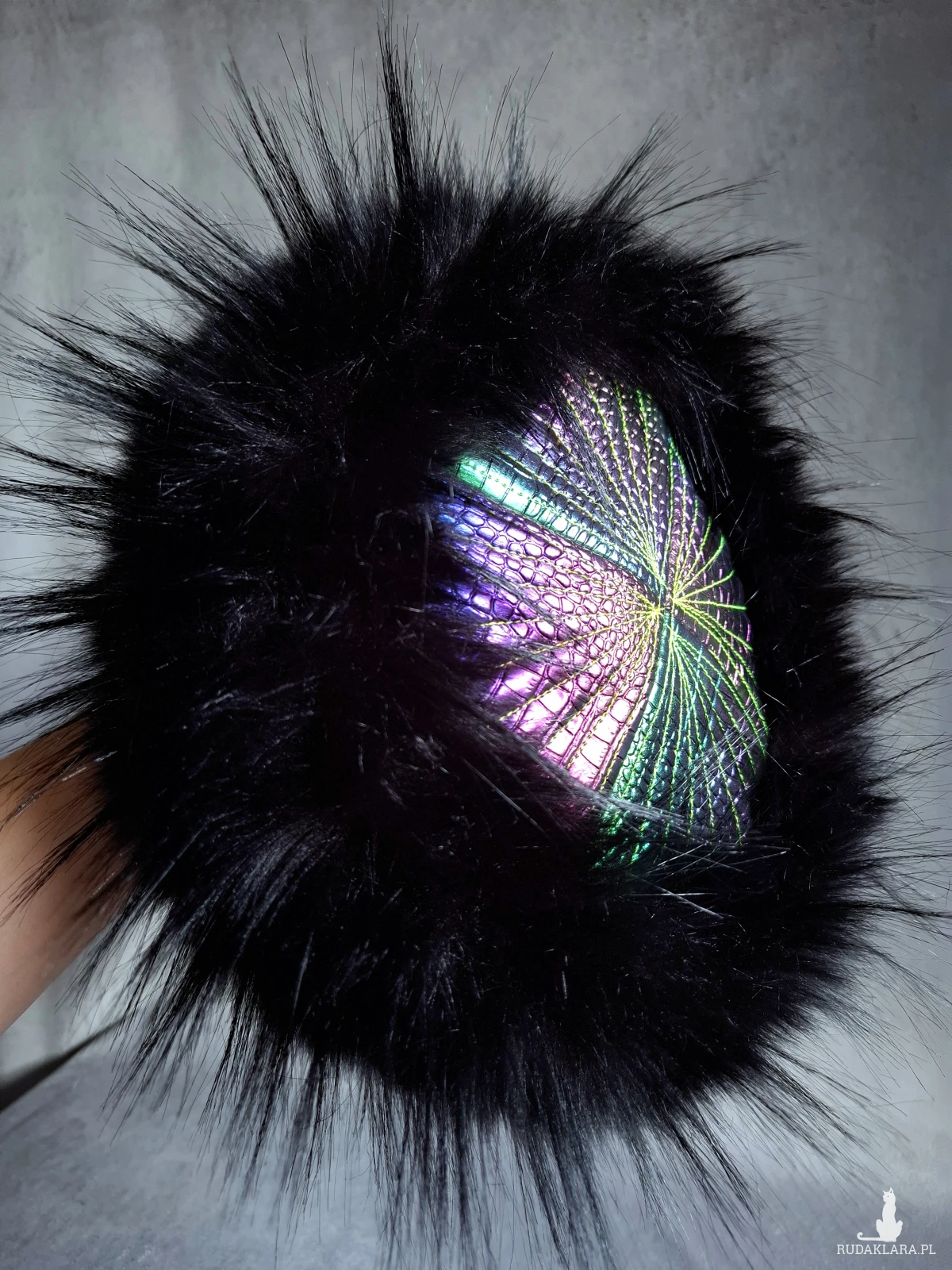 Futrzany toczek z tęczowymi elementami i zieloną satynową podszewką 🌿