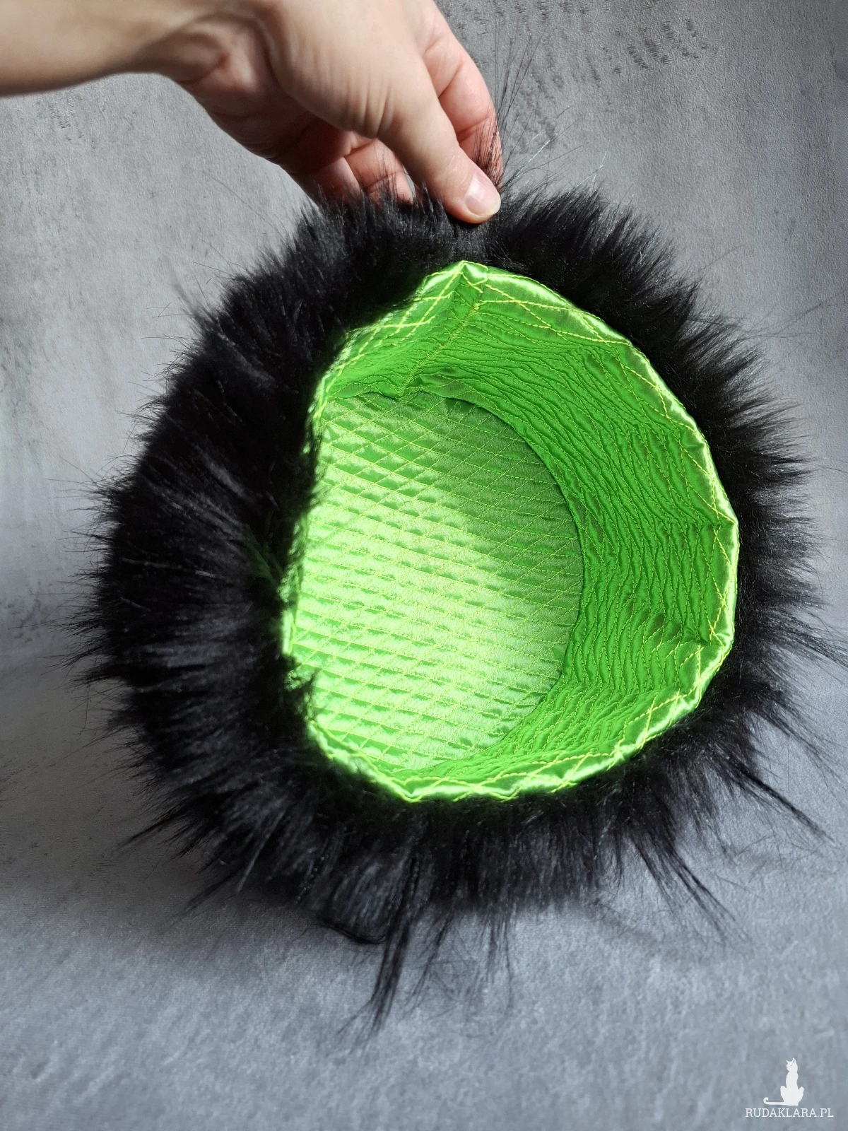 🖤 Materiał zewnętrzny: miękkie, czarne syntetyczne futerko, które wygląda luksusowo, a jednocześnie jest w pełni przyjazne zwierzętom.