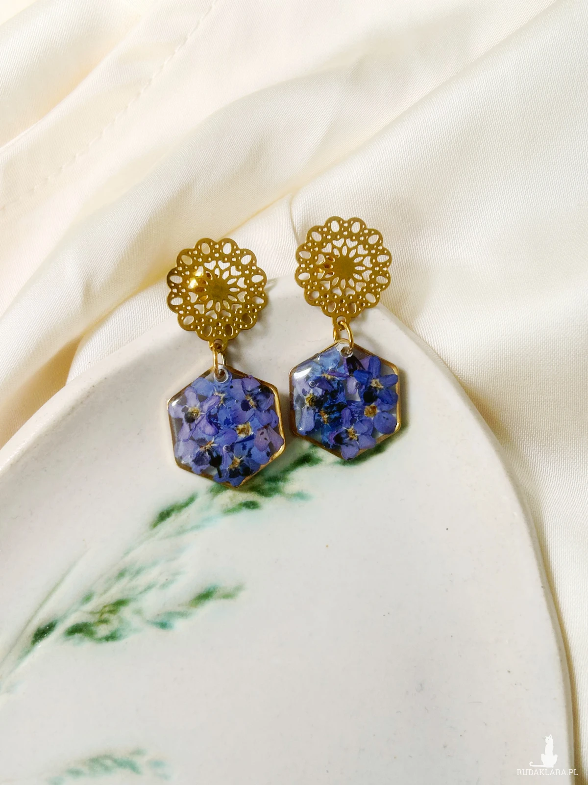 Piękne kolczyki z niezapominajkami zamkniętymi w żywicy.