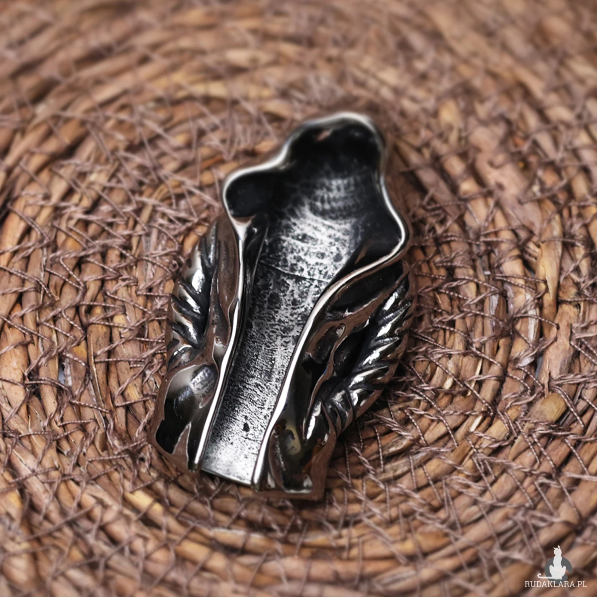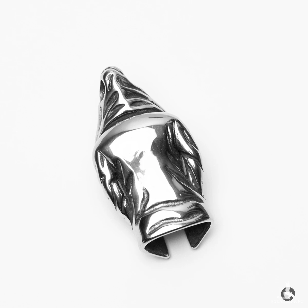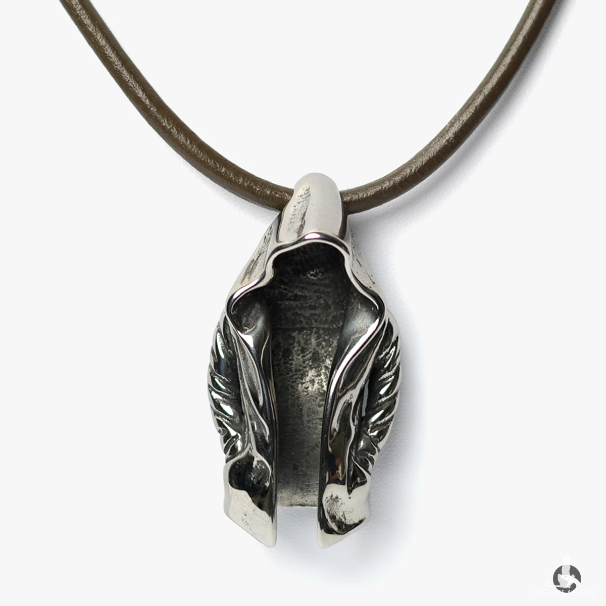Naszyjnik z zawieszką w kształcie peleryny z kapturem, symbolizującą postać zamaskowanego wojownika lub zabójcy. Wykonany z trwałej i odpornej na korozję stali szlachetnej 316L. Detale skrzydeł na ramionach dodają zawieszce charakteru i głębi, a subtelne przyciemnienie wewnątrz kaptura podkreśla jej tajemniczy wygląd. Całość zawieszona na brązowym rzemieniu, który świetnie kontrastuje z chłodnym odcieniem metalu i nadaje naszyjnikowi surowy, vintage'owy charakter.