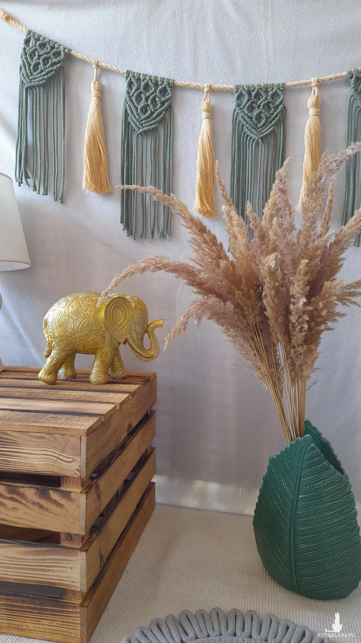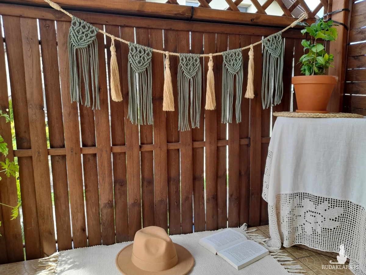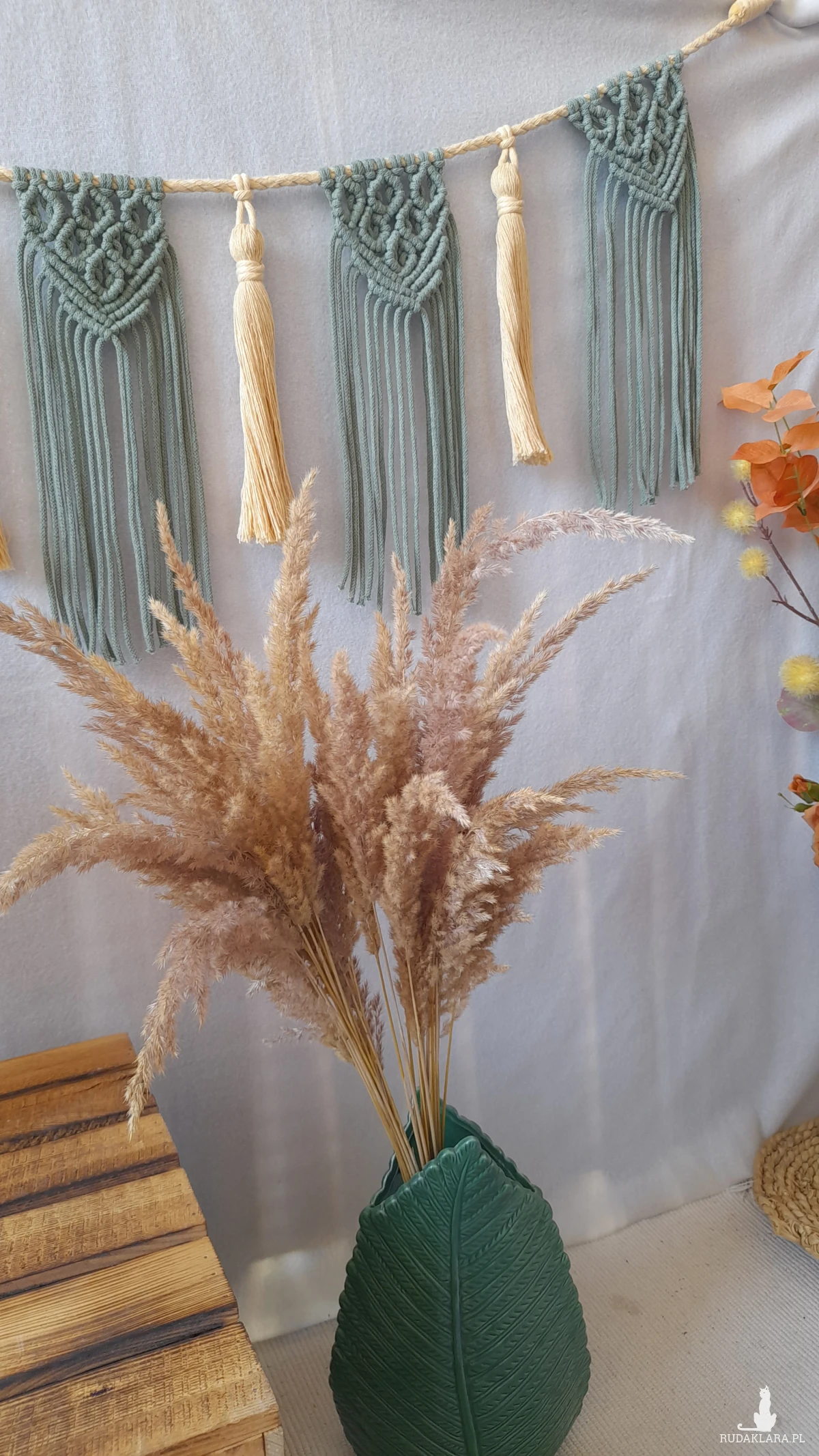 Wprowadź do swojego wnętrza ciepły, ziemisty klimat dzięki ręcznie wykonanej, boho makramowej girlandzie. 🌾✨ Połączenie szałwiowej zieleni i waniliowych frędzli tworzy harmonijny, naturalny wygląd, który idealnie sprawdzi się w kącikach relaksu, przytulnych zakątkach i stylowych wnętrzach.