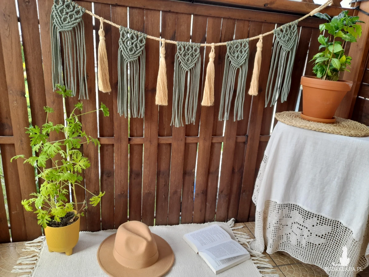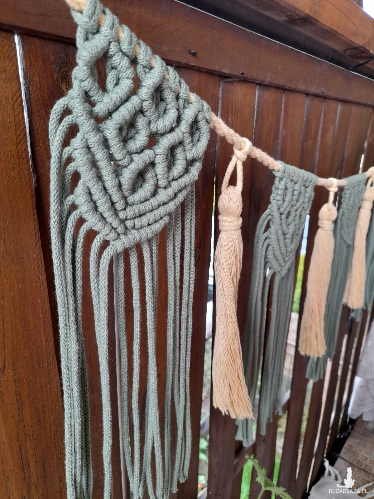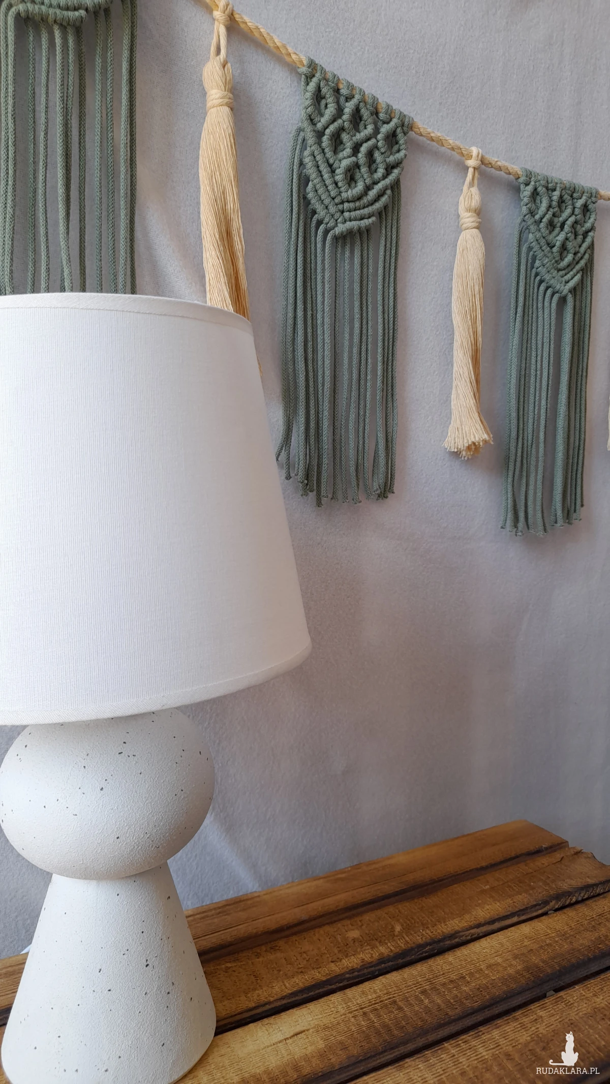 Wprowadź do swojego wnętrza ciepły, ziemisty klimat dzięki ręcznie wykonanej, boho makramowej girlandzie. 🌾✨ Połączenie szałwiowej zieleni i waniliowych frędzli tworzy harmonijny, naturalny wygląd, który idealnie sprawdzi się w kącikach relaksu, przytulnych zakątkach i stylowych wnętrzach.
