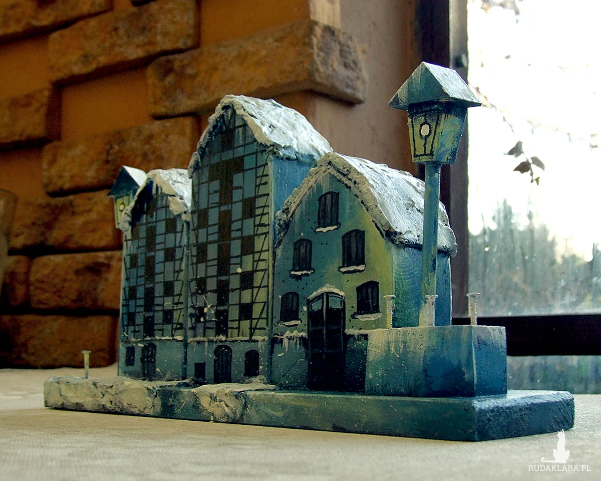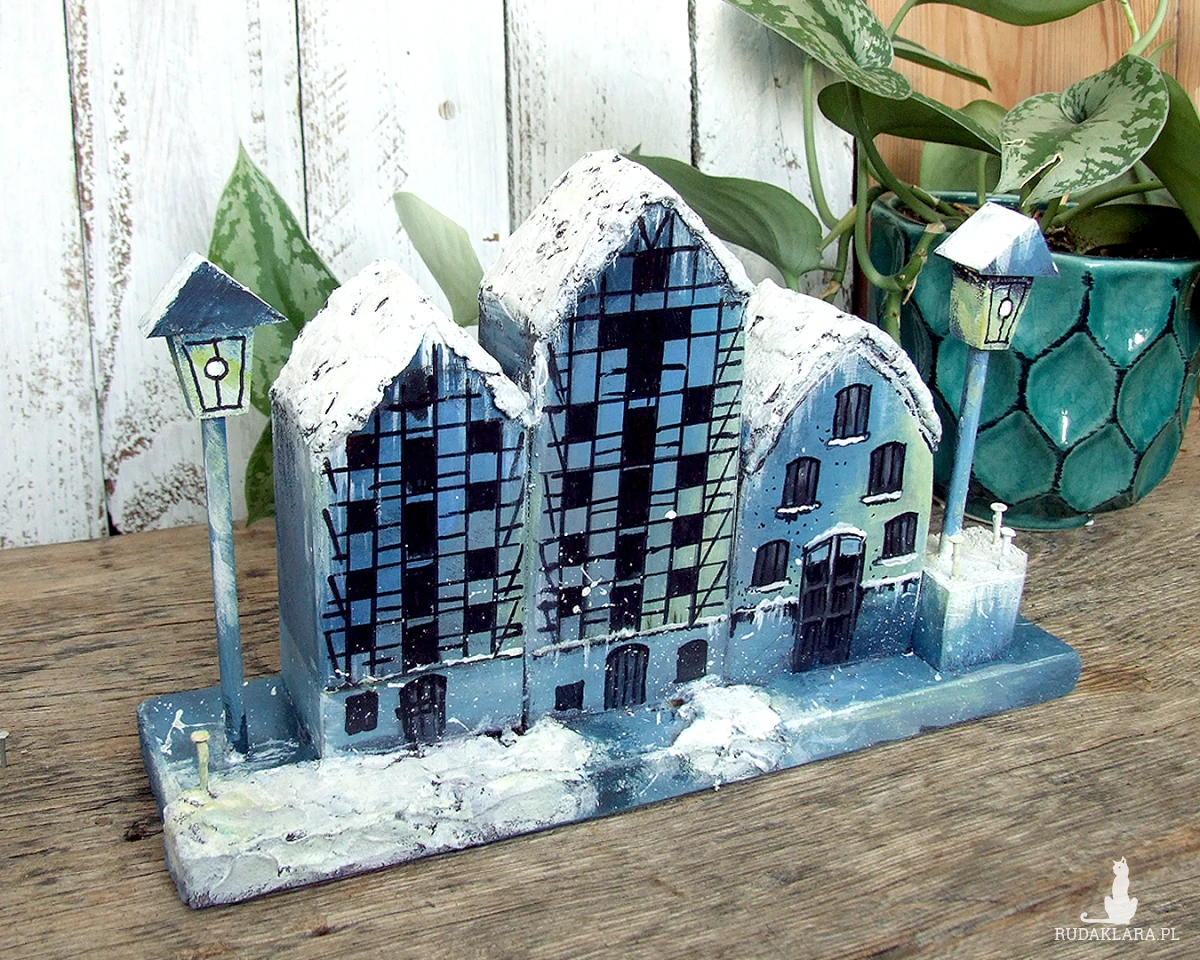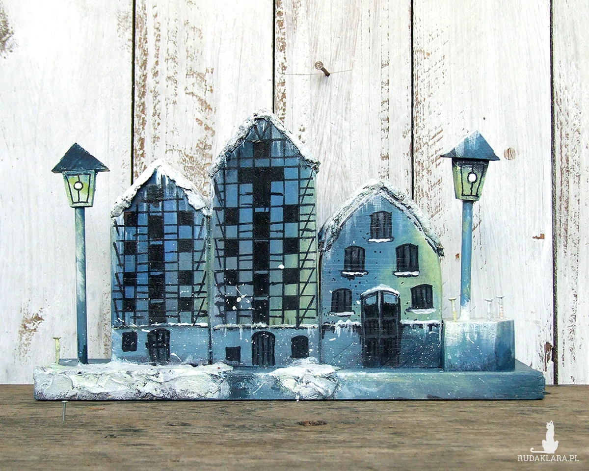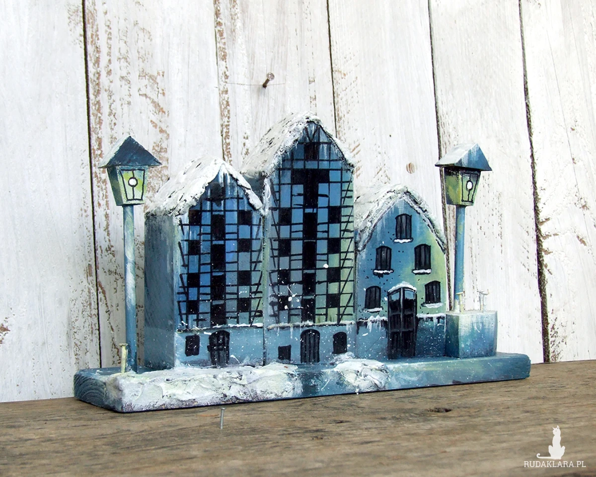 Zimowe Spichrze - dekoracja z drewna, ręcznie malowana, inspirowana trzema spichrzami w Bydgoszczy.