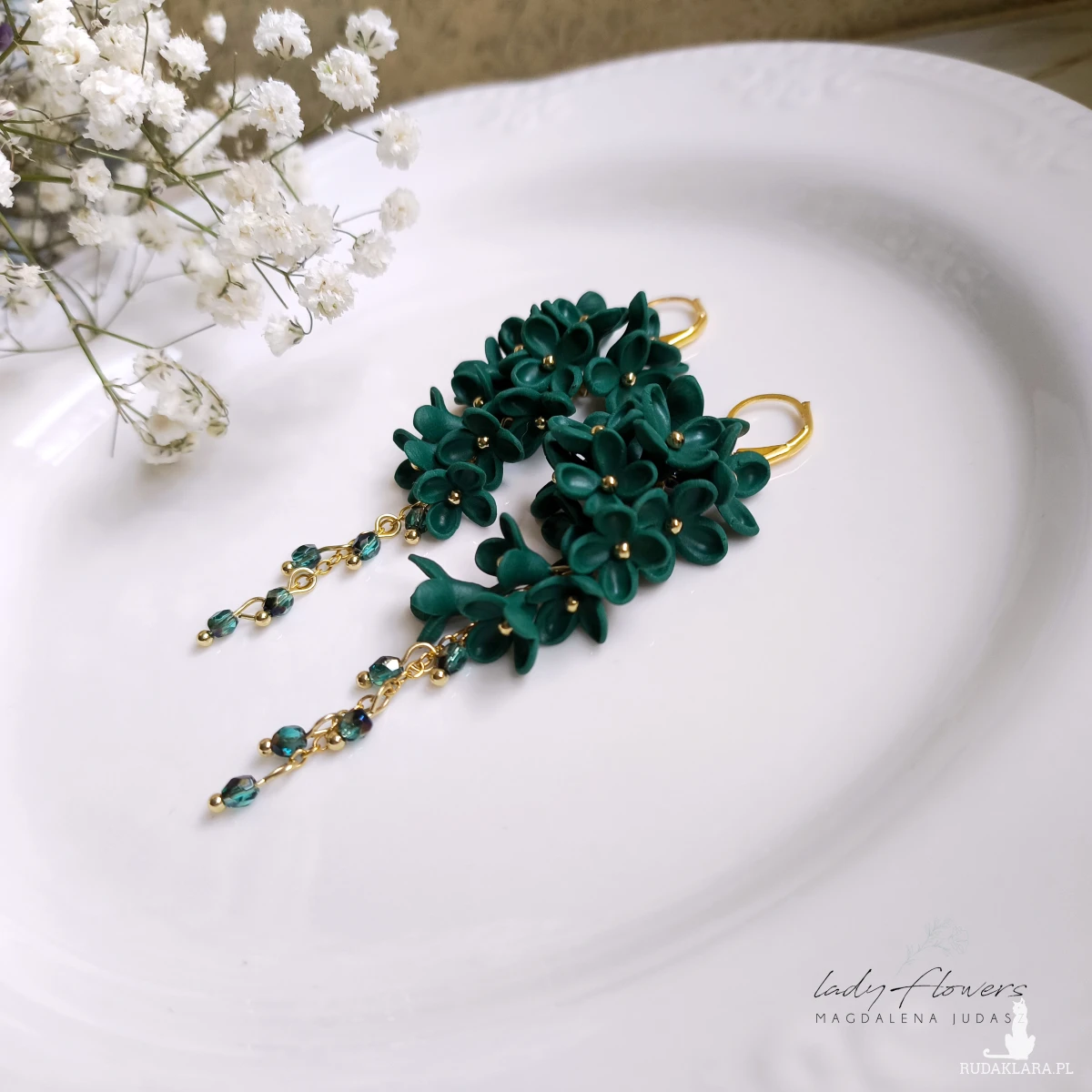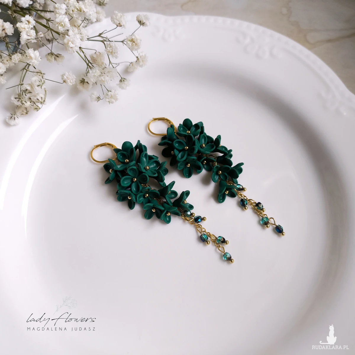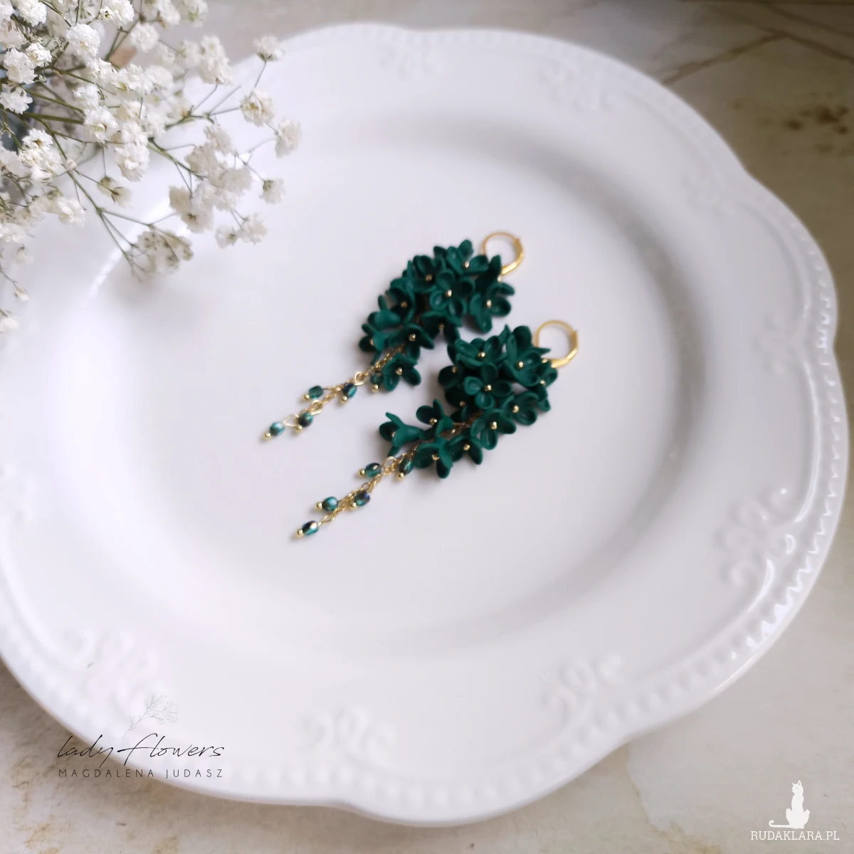Eleganckie kolczyki w kolorze butelkowej zieleni ze złotymi elementami ze stali chirurgicznej.