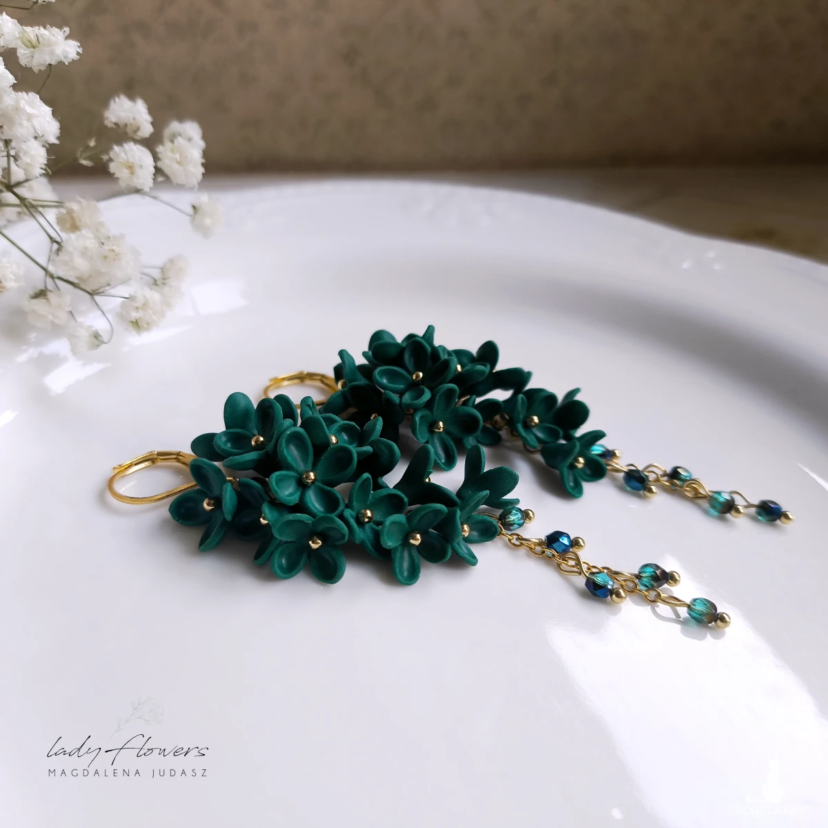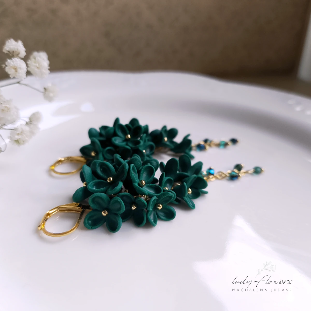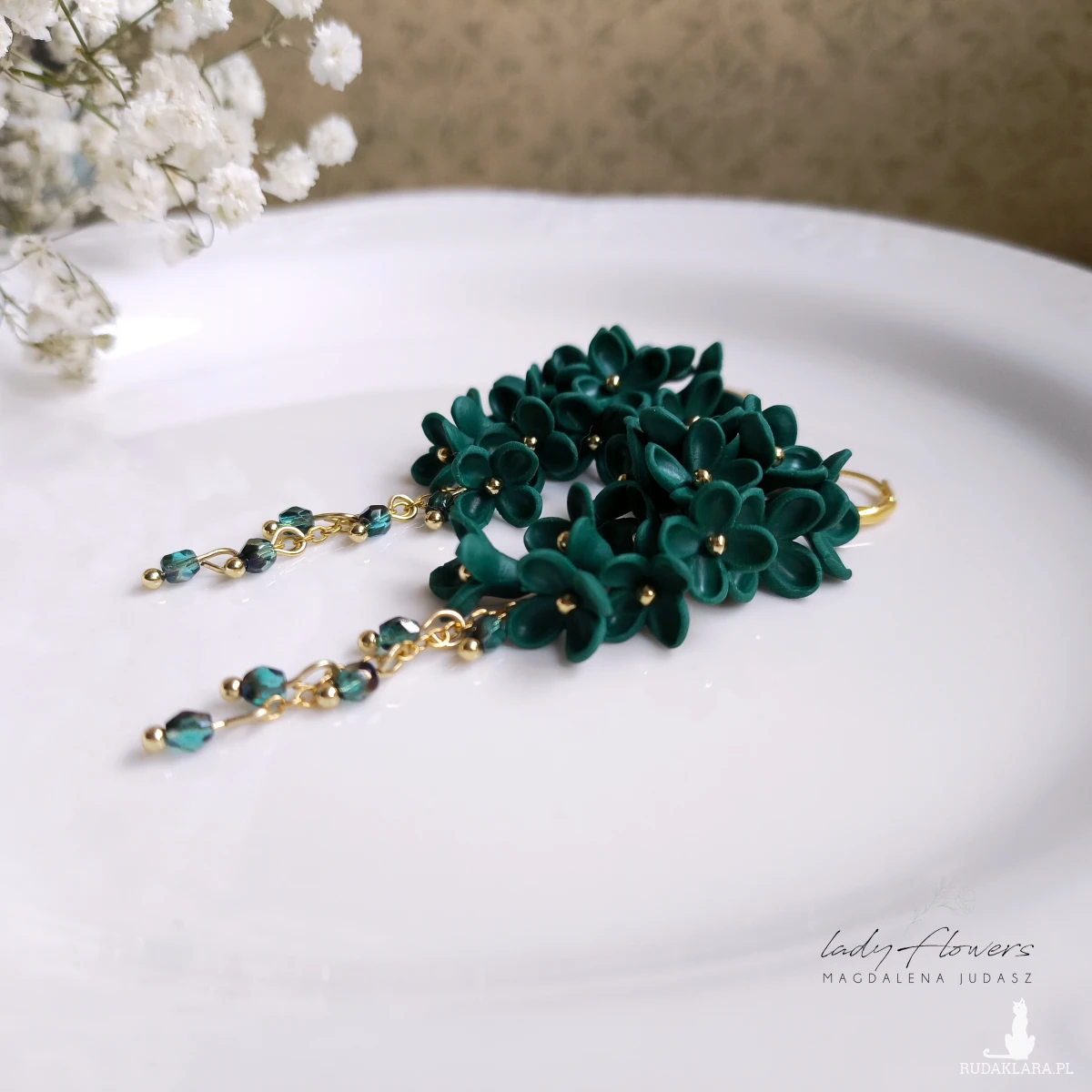 Eleganckie kolczyki w kolorze butelkowej zieleni ze złotymi elementami ze stali chirurgicznej.