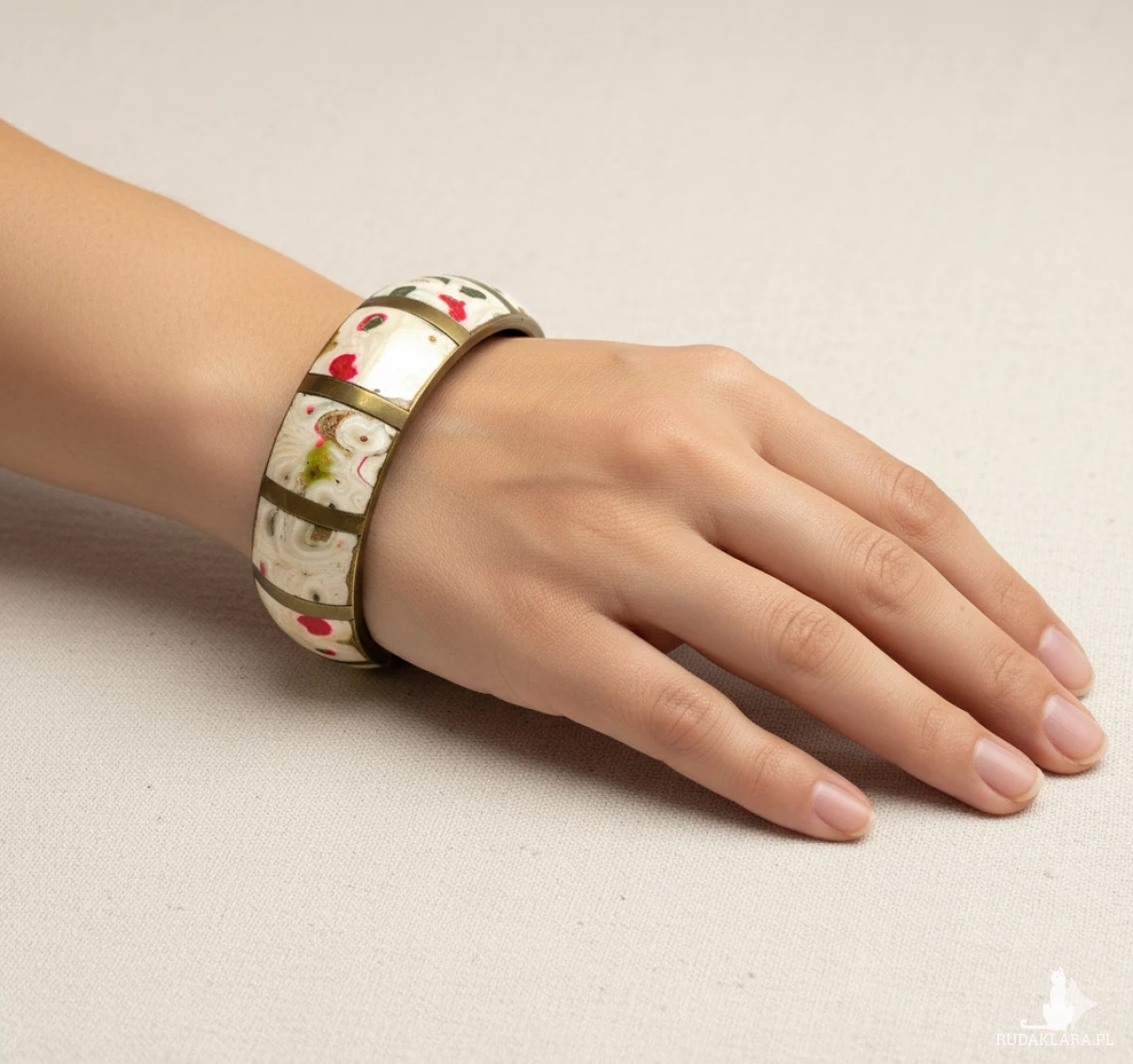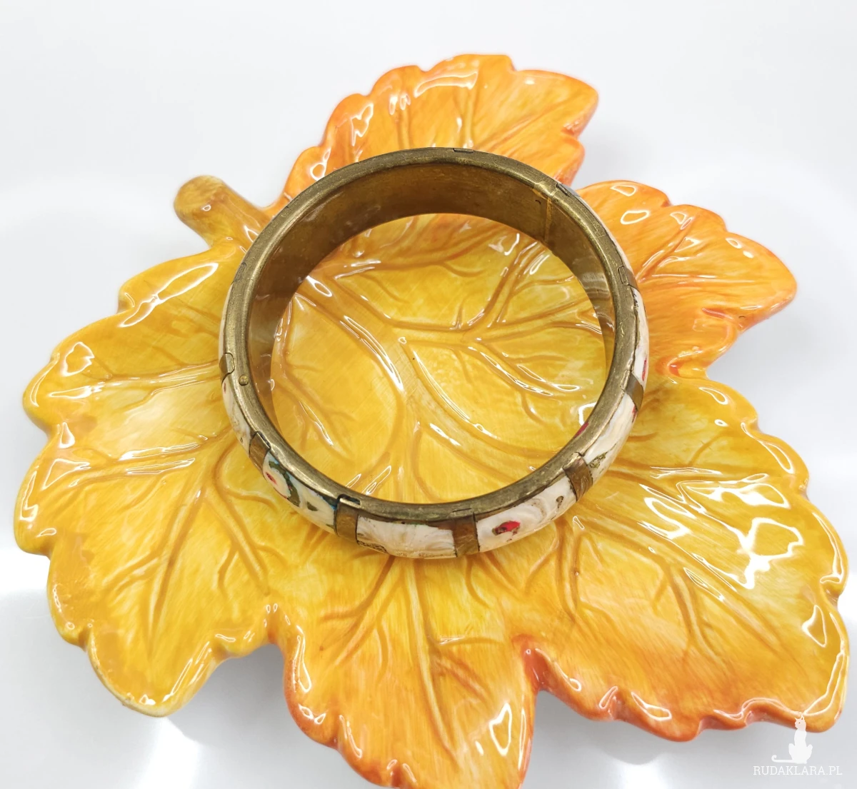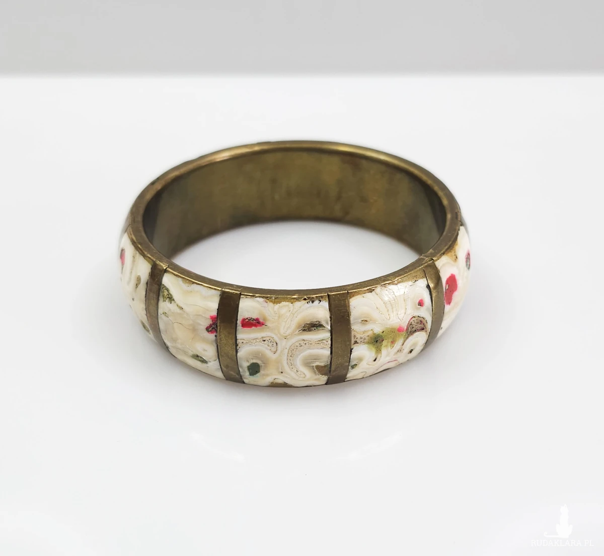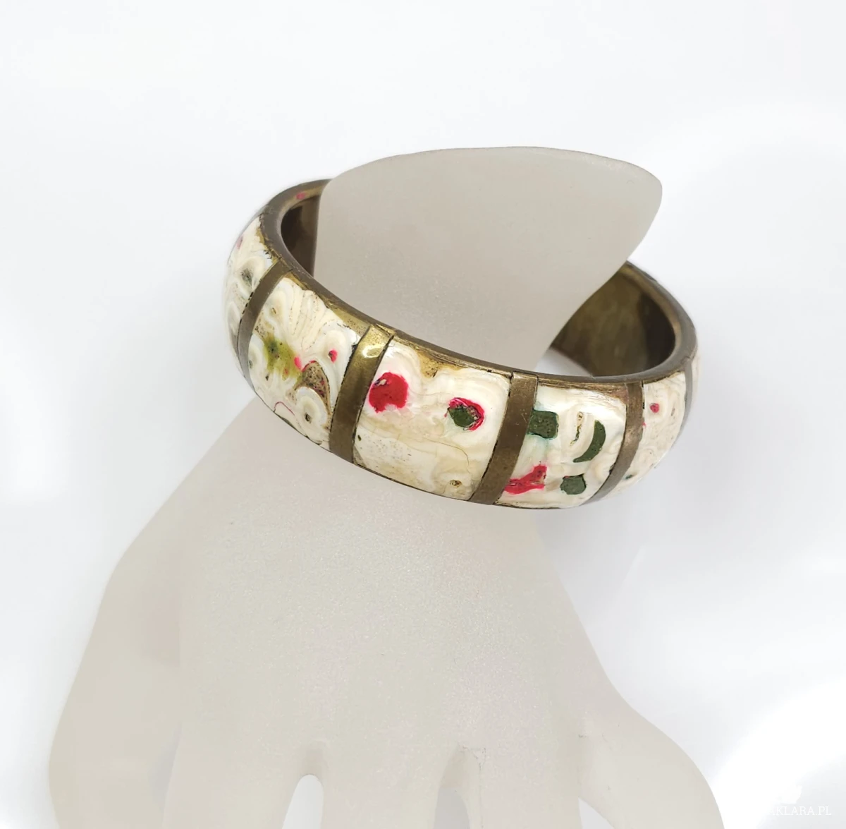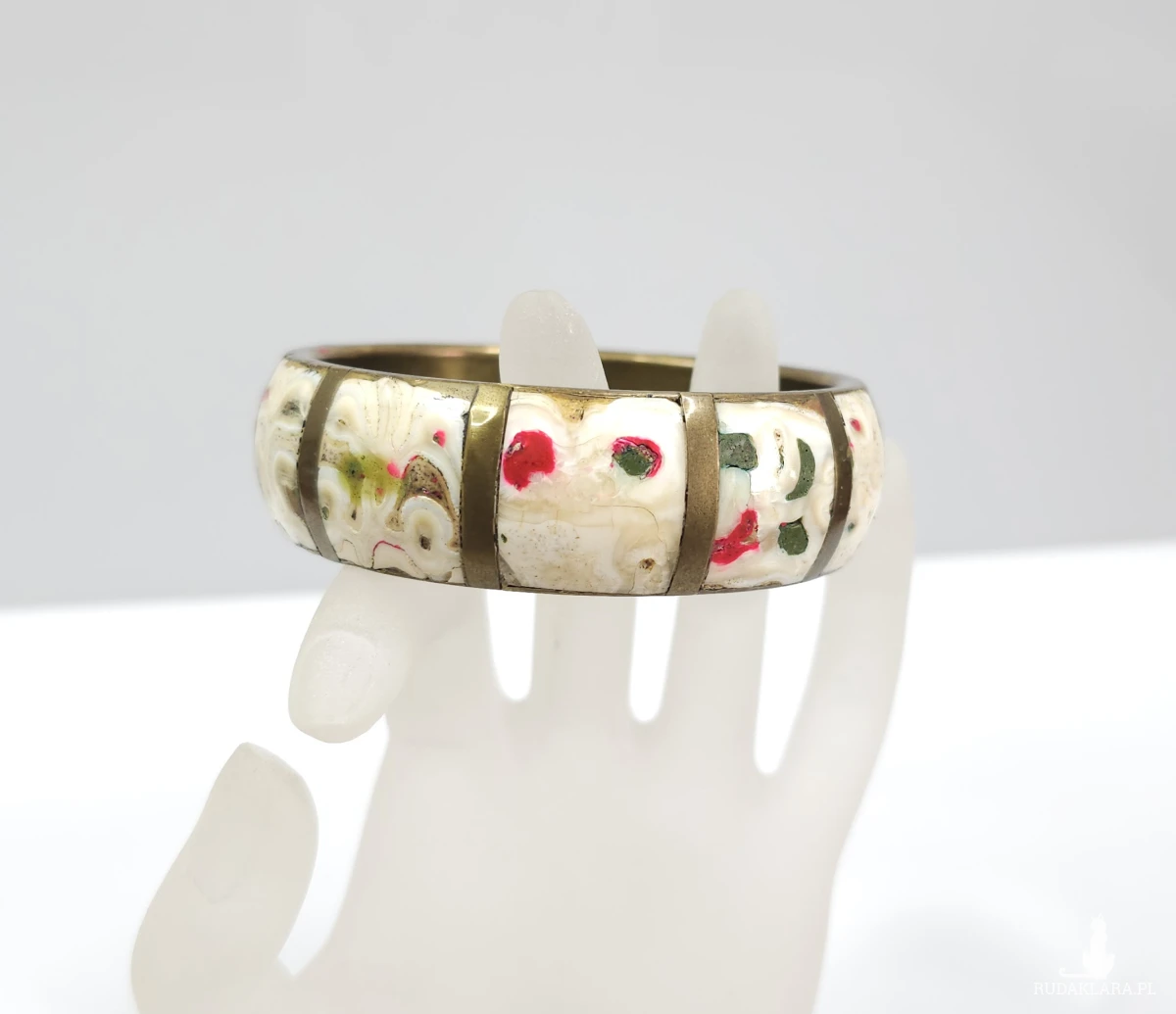 Odkryj niezwykły urok przeszłości z tą unikalną bransoletką vintage. Wykonana z patynowanego mosiądzu, ozdobiona jest intarsjami z naturalnej kości, na których widnieją subtelne, malownicze akcenty emaliowane w odcieniach czerwieni i zieleni. Każdy segment bransoletki opowiada swoją historię, tworząc wyjątkowy wzór i teksturę. Idealna dla miłośników biżuterii z duszą, poszukujących oryginalnych dodatków, które podkreślą indywidualny styl. Bransoletka doskonale sprawdzi się jako elegancki dodatek do codziennych stylizacji, jak i wyjątkowy akcent wieczorowego looku. To prawdziwa gratka dla kolekcjonerów biżuterii vintage.
