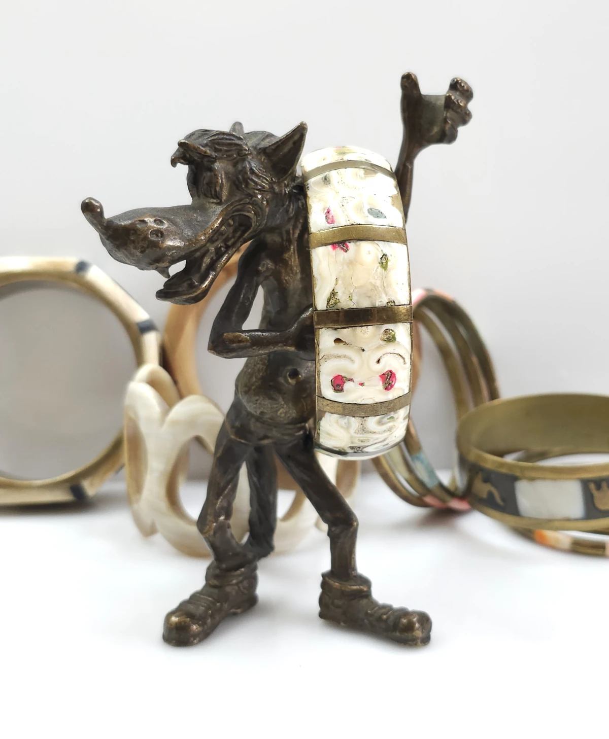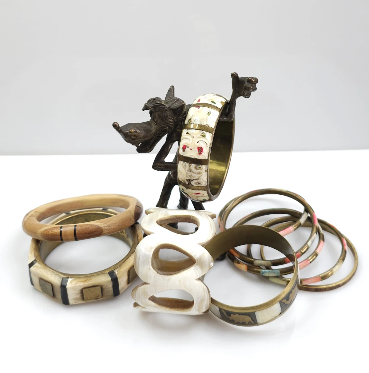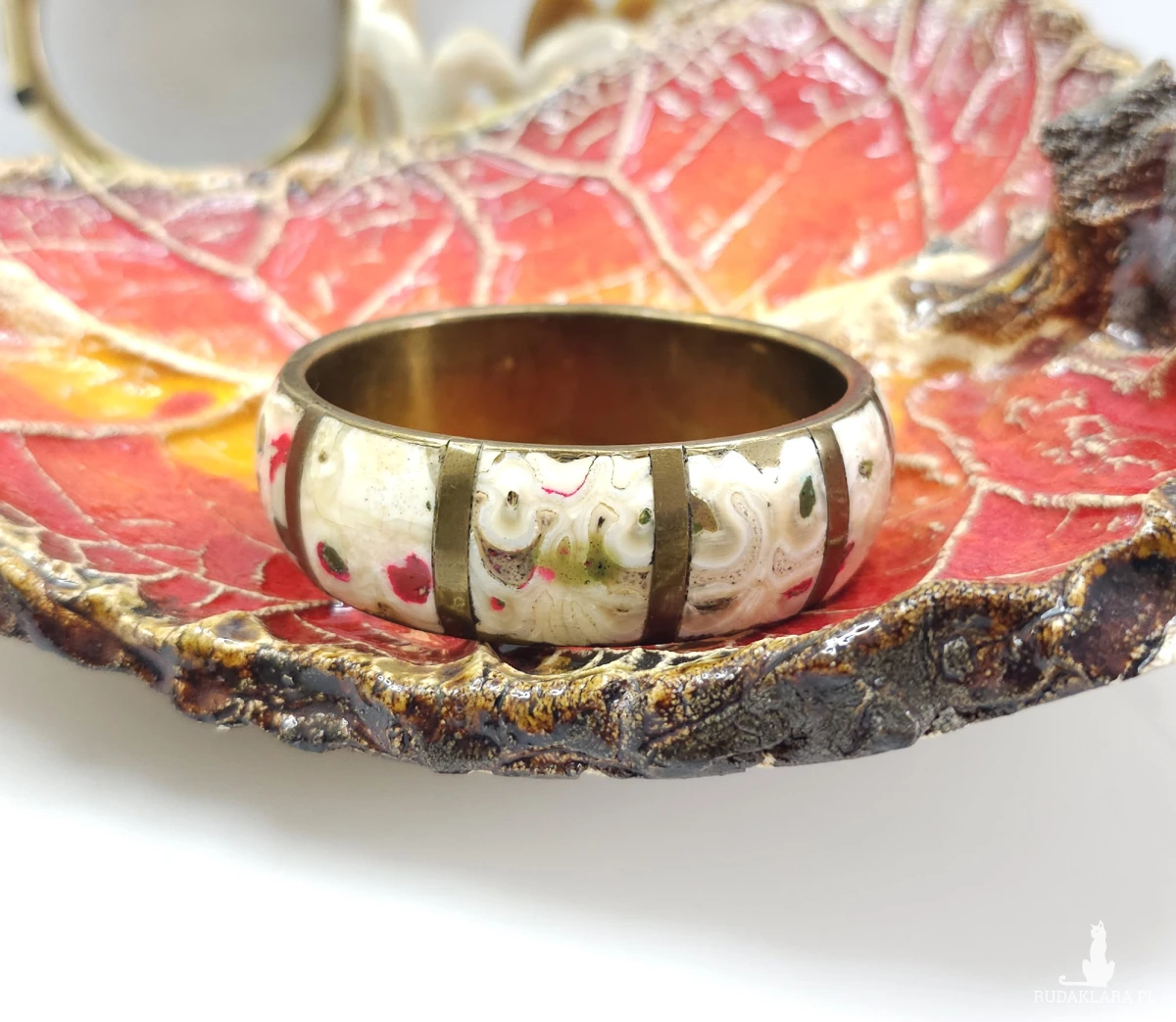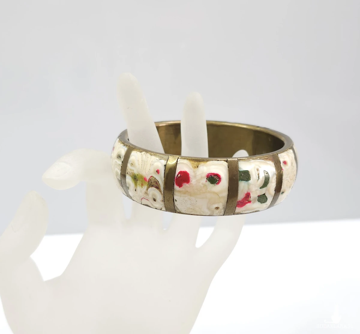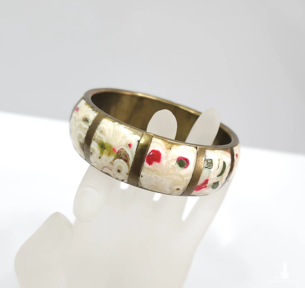 Odkryj niezwykły urok przeszłości z tą unikalną bransoletką vintage. Wykonana z patynowanego mosiądzu, ozdobiona jest intarsjami z naturalnej kości, na których widnieją subtelne, malownicze akcenty emaliowane w odcieniach czerwieni i zieleni. Każdy segment bransoletki opowiada swoją historię, tworząc wyjątkowy wzór i teksturę. Idealna dla miłośników biżuterii z duszą, poszukujących oryginalnych dodatków, które podkreślą indywidualny styl. Bransoletka doskonale sprawdzi się jako elegancki dodatek do codziennych stylizacji, jak i wyjątkowy akcent wieczorowego looku. To prawdziwa gratka dla kolekcjonerów biżuterii vintage.