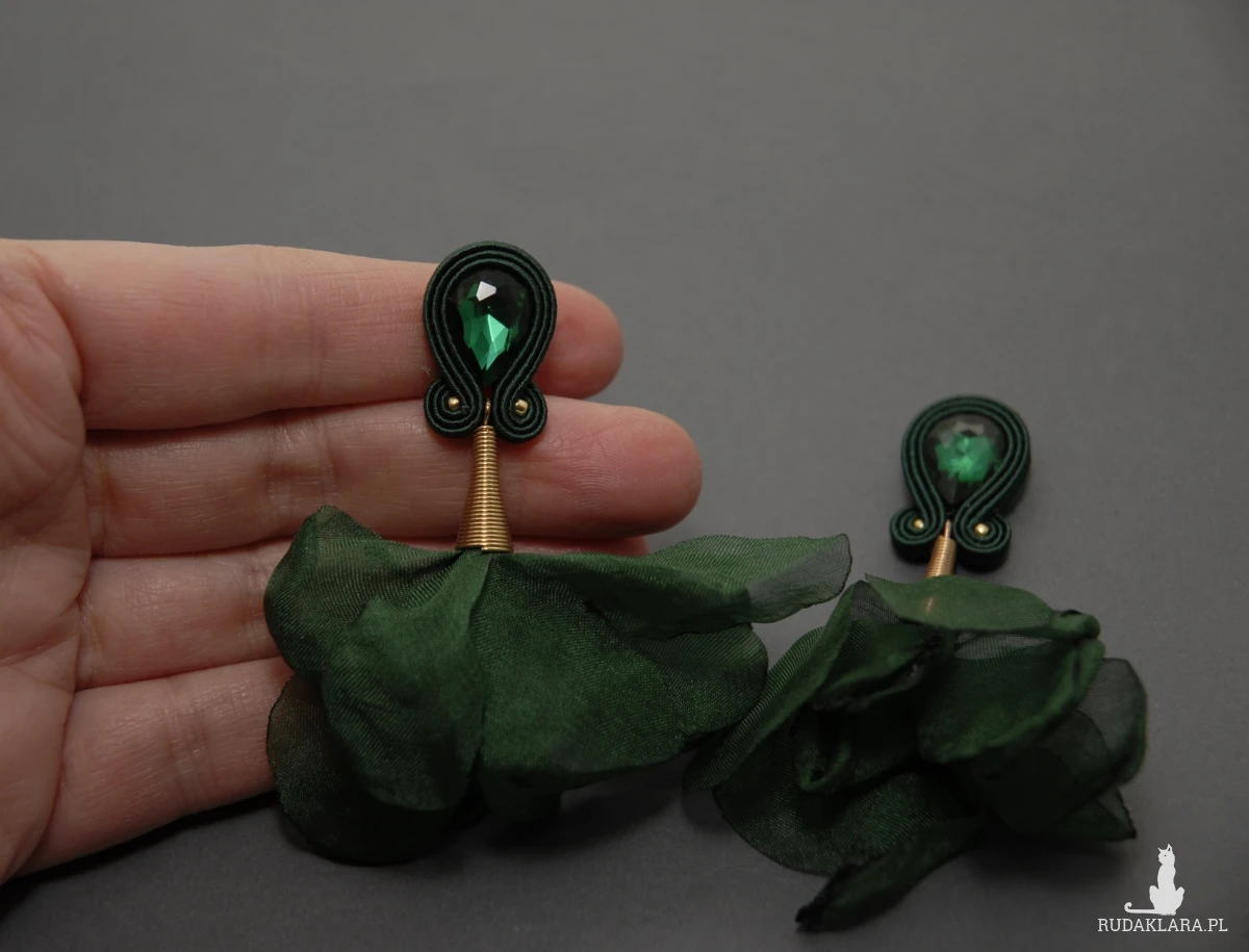 oferuję kolczyki (sztyfty) lub klipsy zrobione techniką sutasz, ozdobione fasetowanymi szklanymi kaboszonami i kwiatkami z materiału