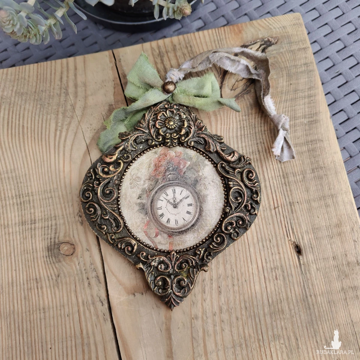 Ta elegancka zawieszka łączy w sobie klasyczny urok i nowoczesny styl. Antyczna rama w odcieniach brązu i złota, zdobiona misternymi wzorami kwiatowymi, otacza zegar o wyrafinowanym designie. Na górze ramy znajduje się zielona kokarda, która dodaje całości świeżości i uroku. Zawieszka doskonale wkomponuje się w różnorodne wnętrza, dodając im wyjątkowego charakteru.