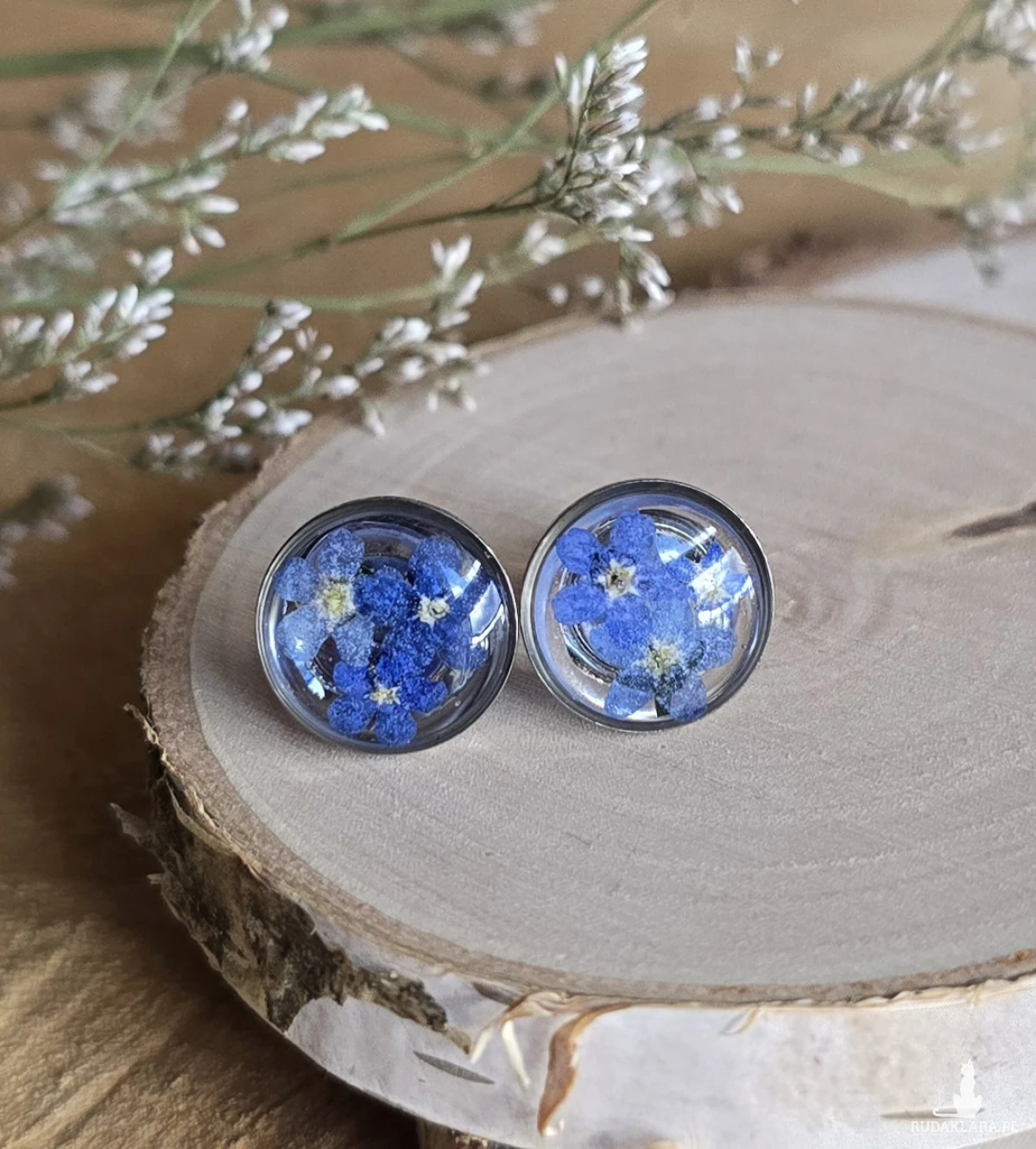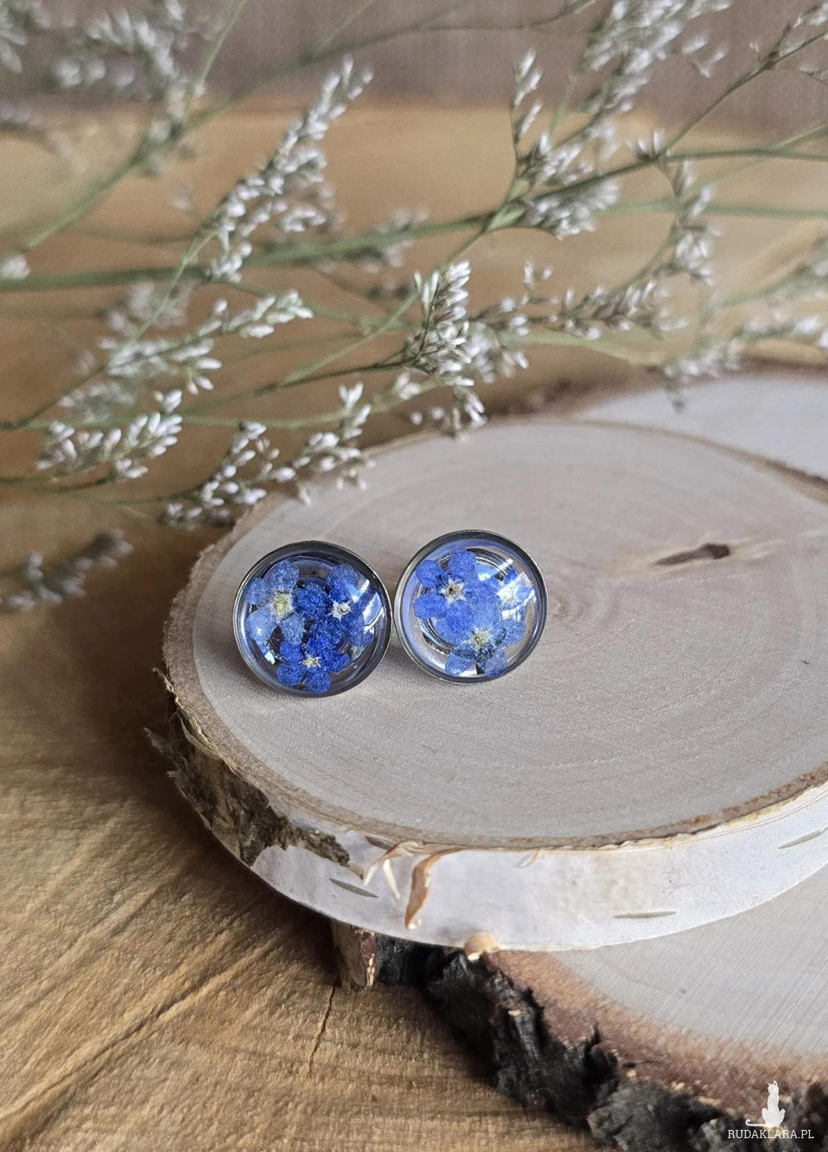Srebrne kolczyki z kwiatami wkręty sztyfty z żywicy żywica epoksydowa z suszonymi prawdziwymi kwiatami niezapominajki