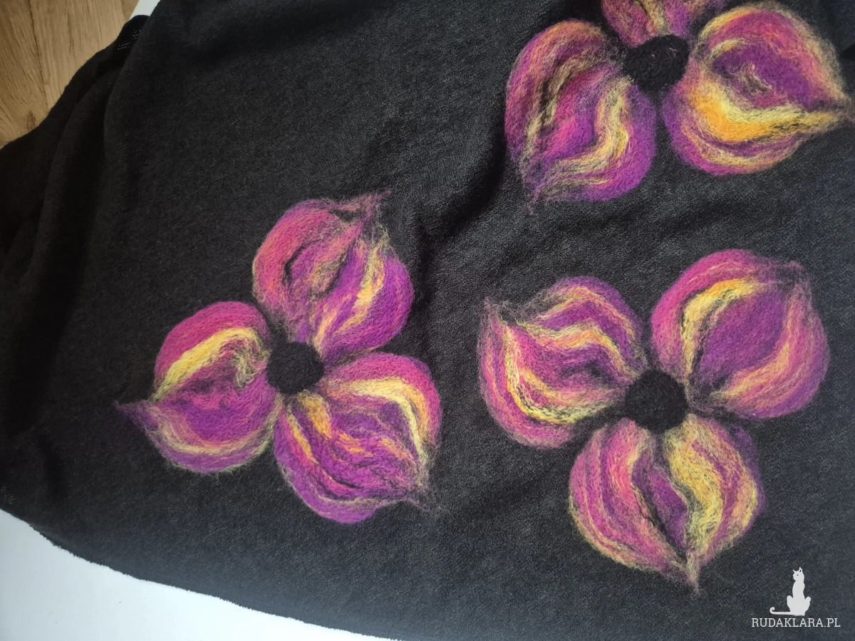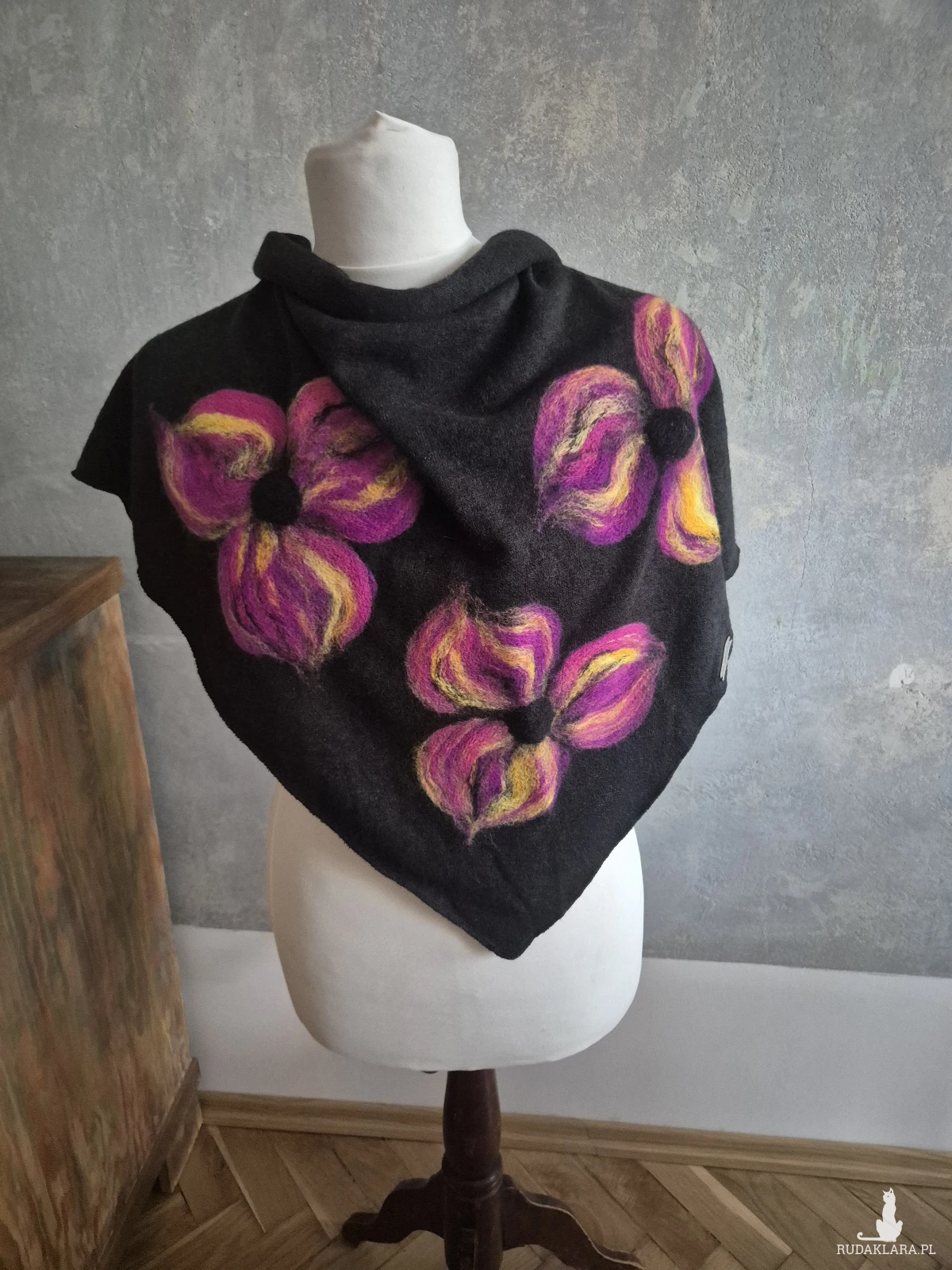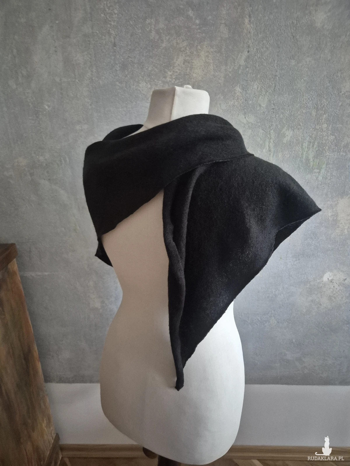 Czarna chusta handmade wełniana, elementy filcowane to wełna merynosów, produkt wysokiej jakości, chusta miła i ciepła, doskonała na chłodne dni, idealna na prezent, wspaniała na codzienne noszenie, zwraca uwagę swą oryginalnością, miękko układa się wokół szyi, absolutny bestseller polecam czas oczekiwania tydzien box p1