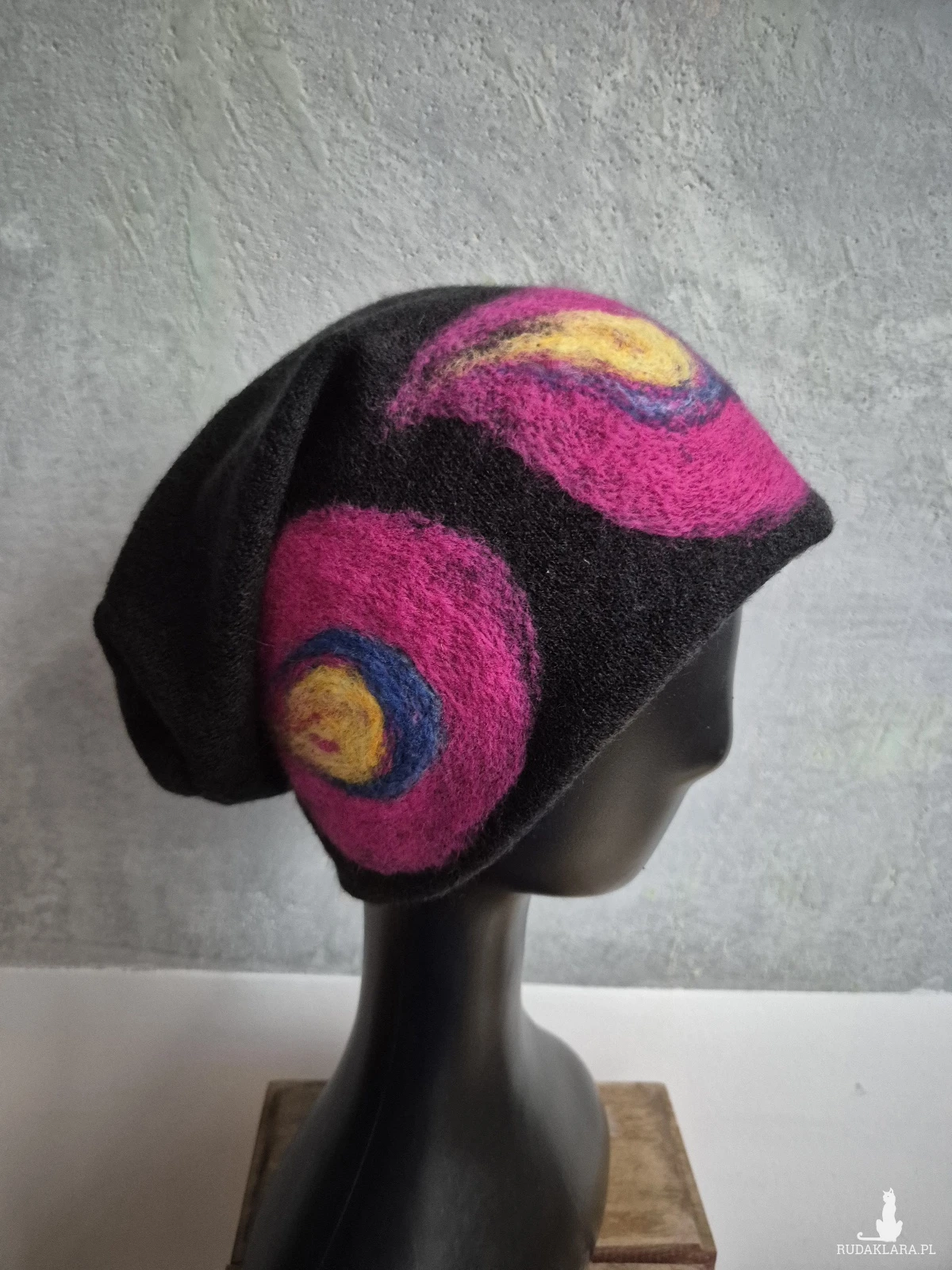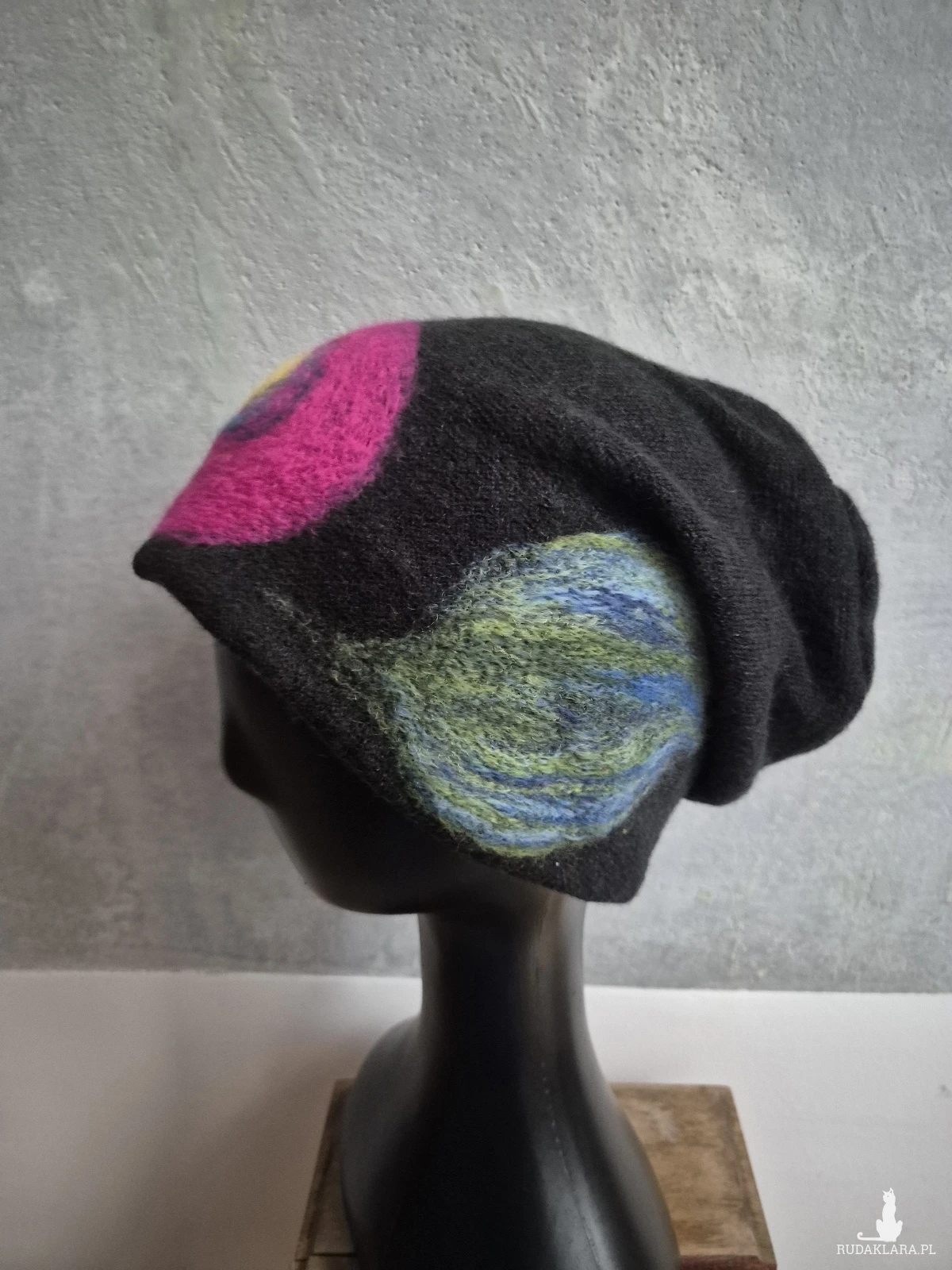 czapka  wełniana filcowana zimowa czarna   handmade w kwiaty na podszewce-- rozmiar uniwersalny, wełniana, filcowana wełną merynosów, bardzo ciepła, fantastyczna, miła, miękko układa się na głowie, niesamowicie zwraca uwagę, doskonałą na codzienne noszenie jak i na prezent, zawsze możesz ją założyć po basenie i przeżyjesz,box a1