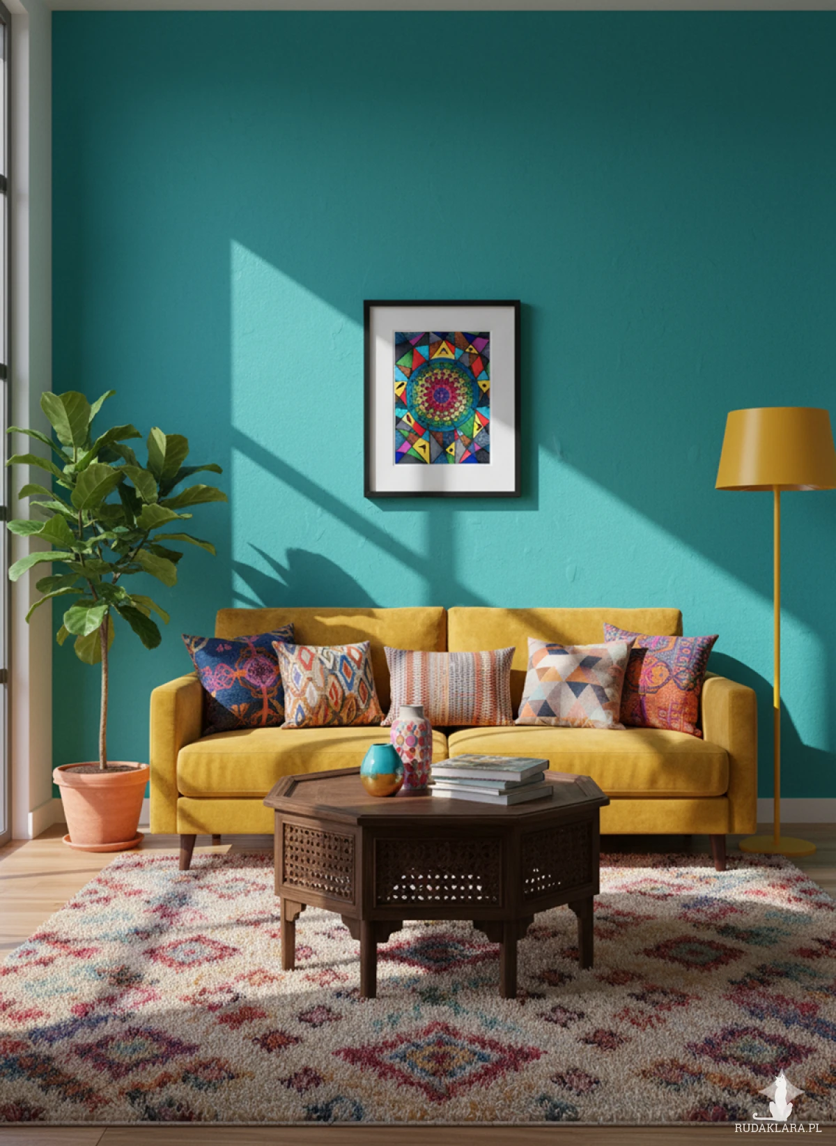 Kompozycja bazuje na kontrastowych, mocnych kolorach (intensywna czerwień, żółć, turkus i czerń),