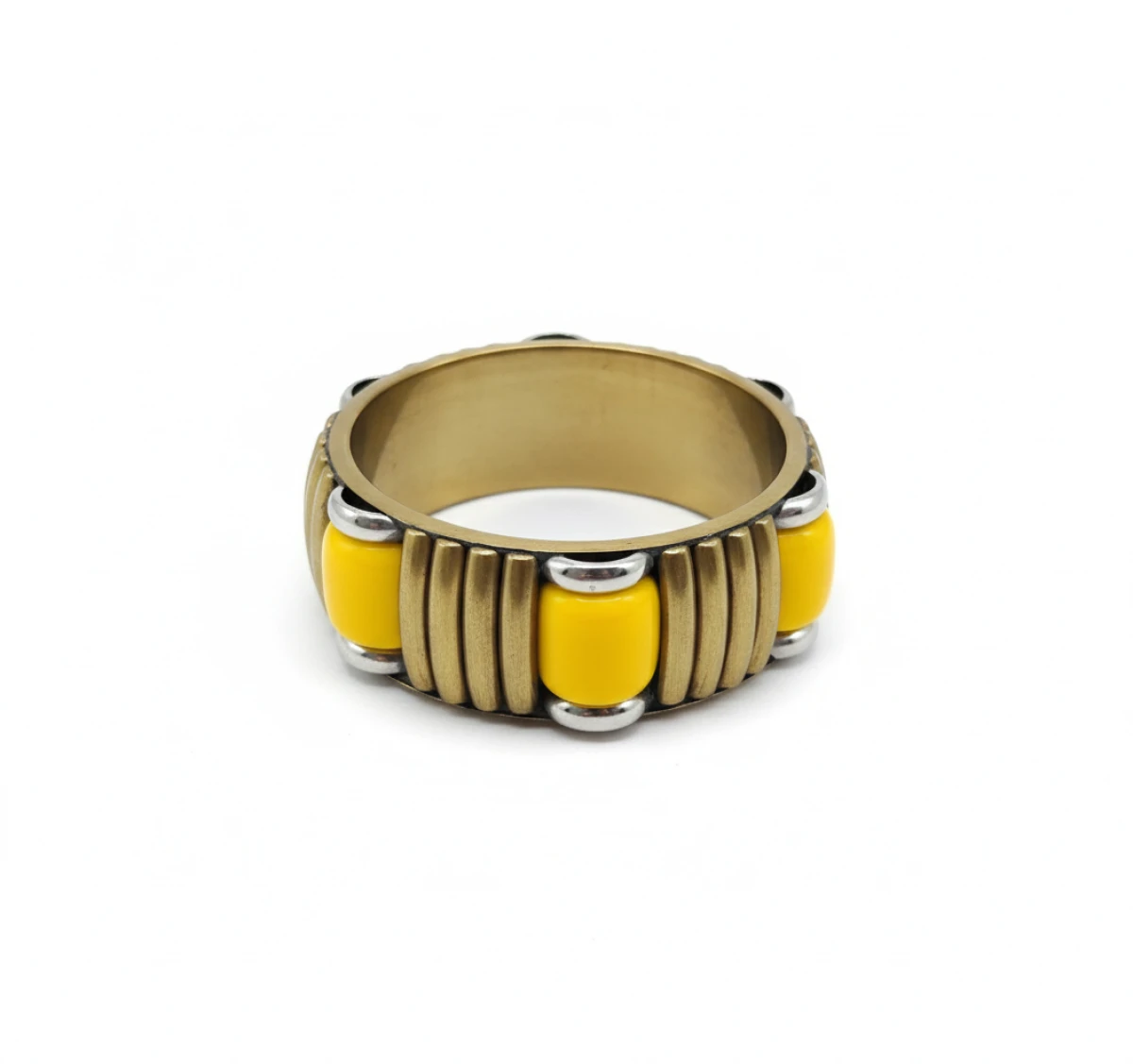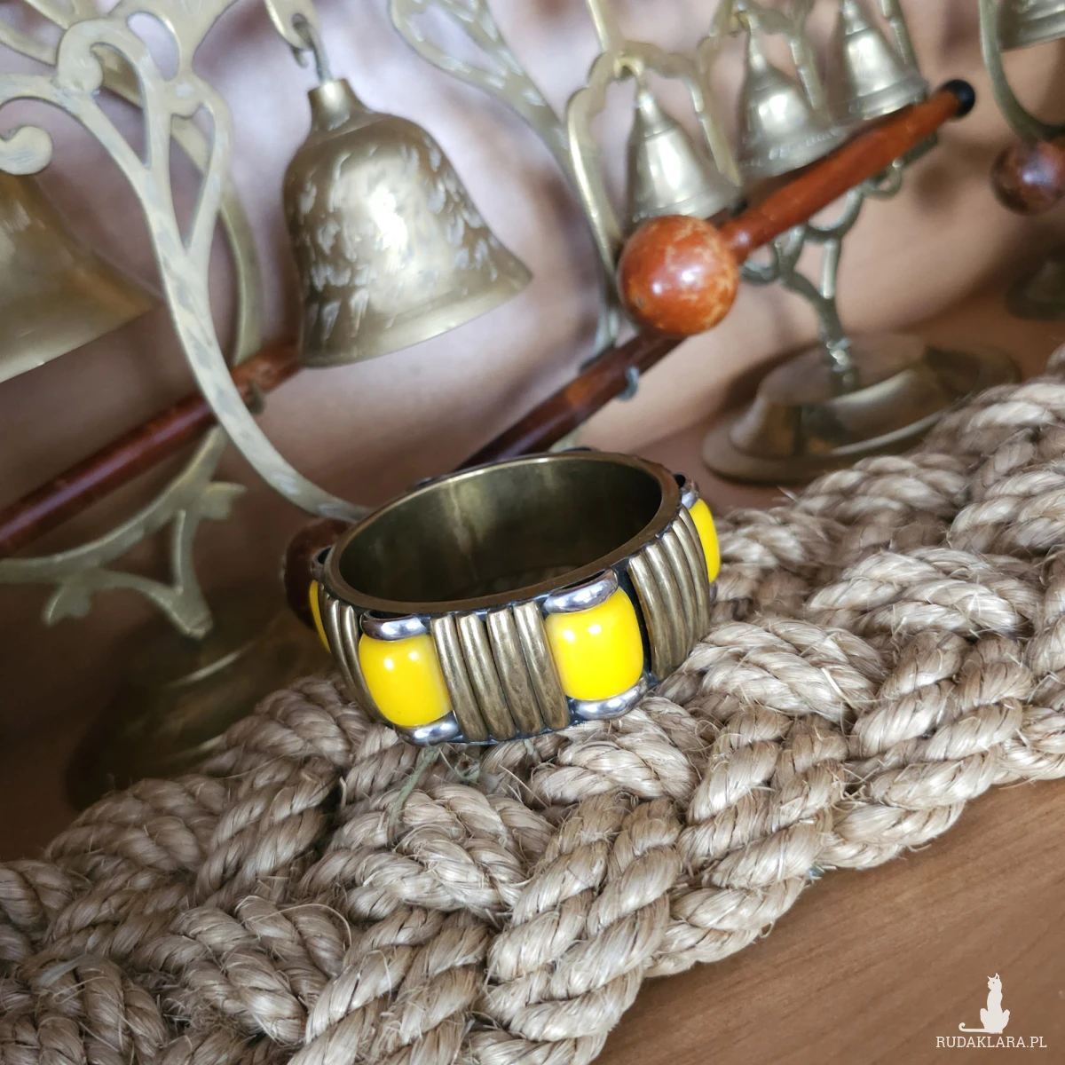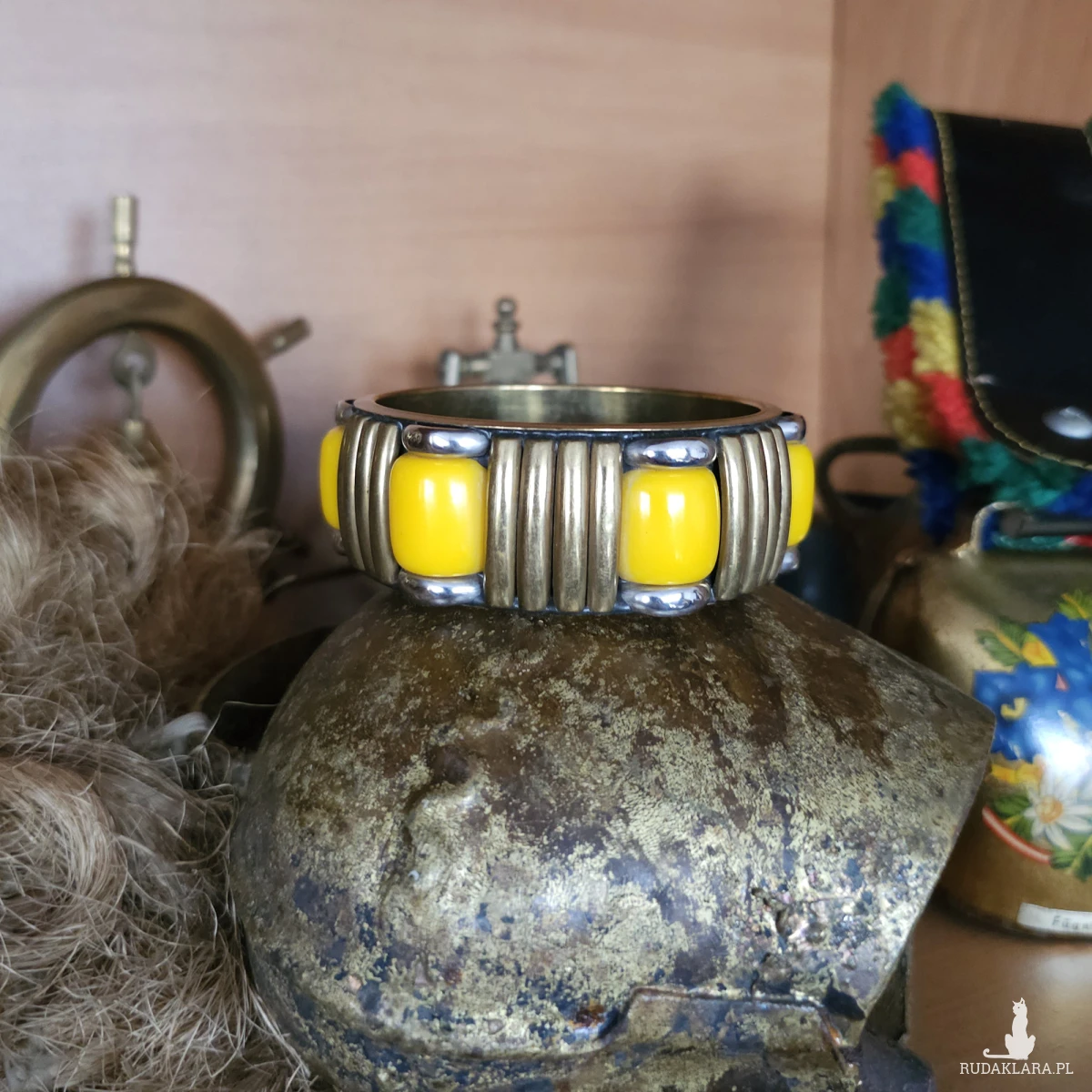 Ta sztywna bransoleta typu bangle, wykonana z mosiądzu, ozdobiona jest dużymi, koralikami z tworzywa sztucznego w intensywnym, słonecznym żółtym kolorze.