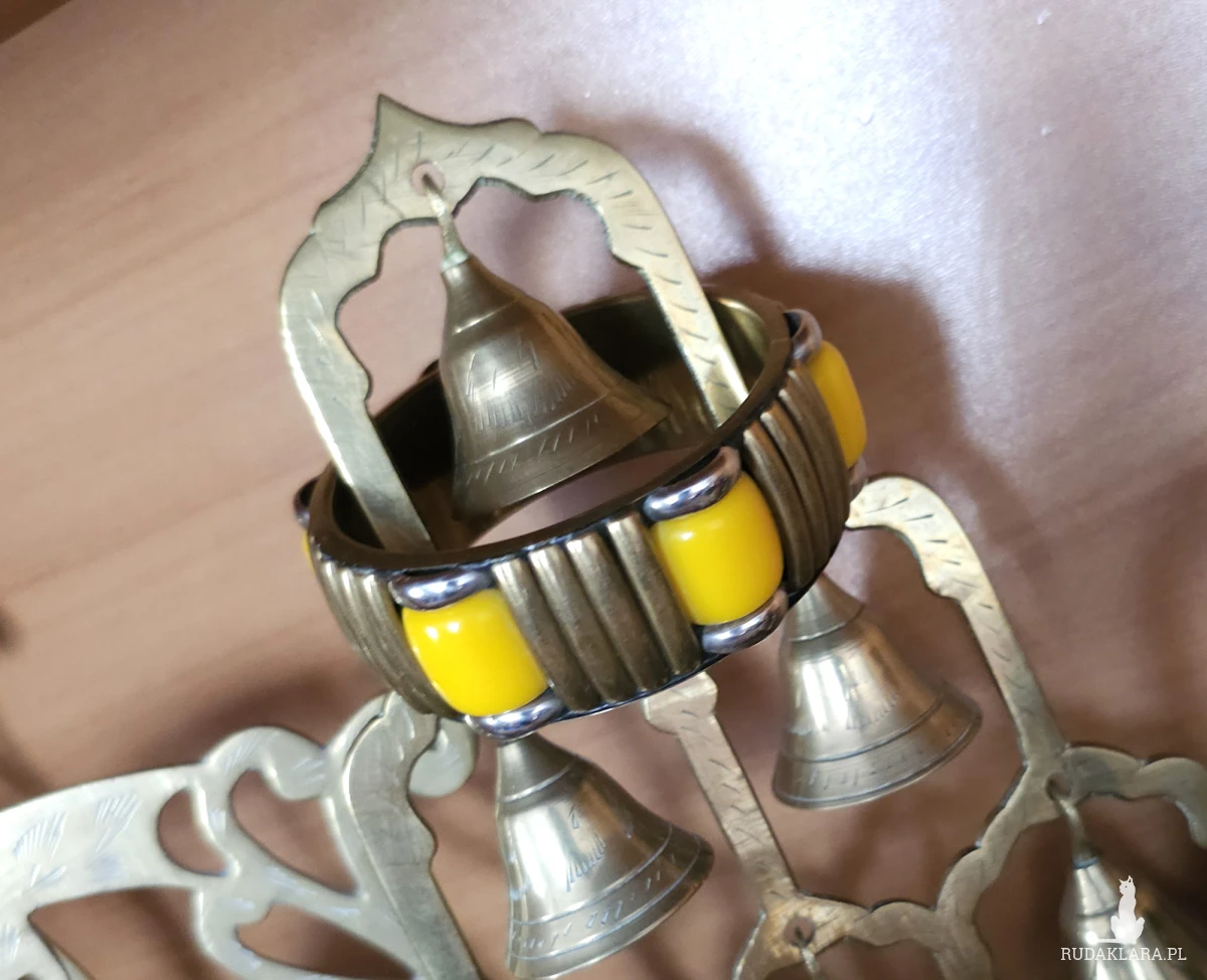 Bransoletka wykonana z mosiądzu i dużych korali z tworzywa sztucznego.