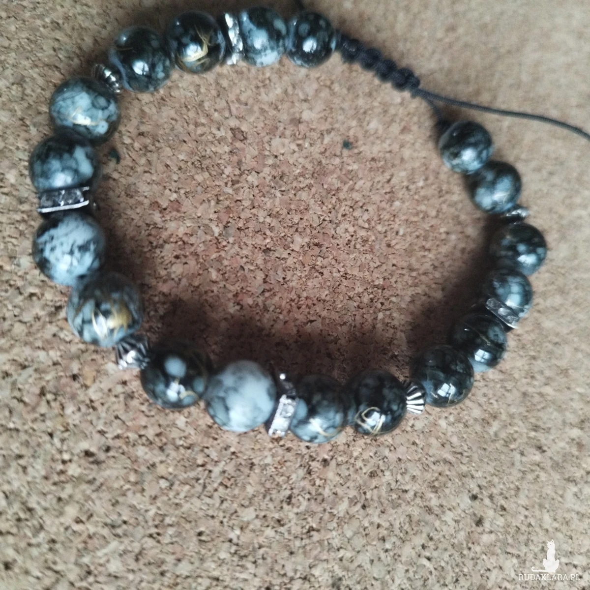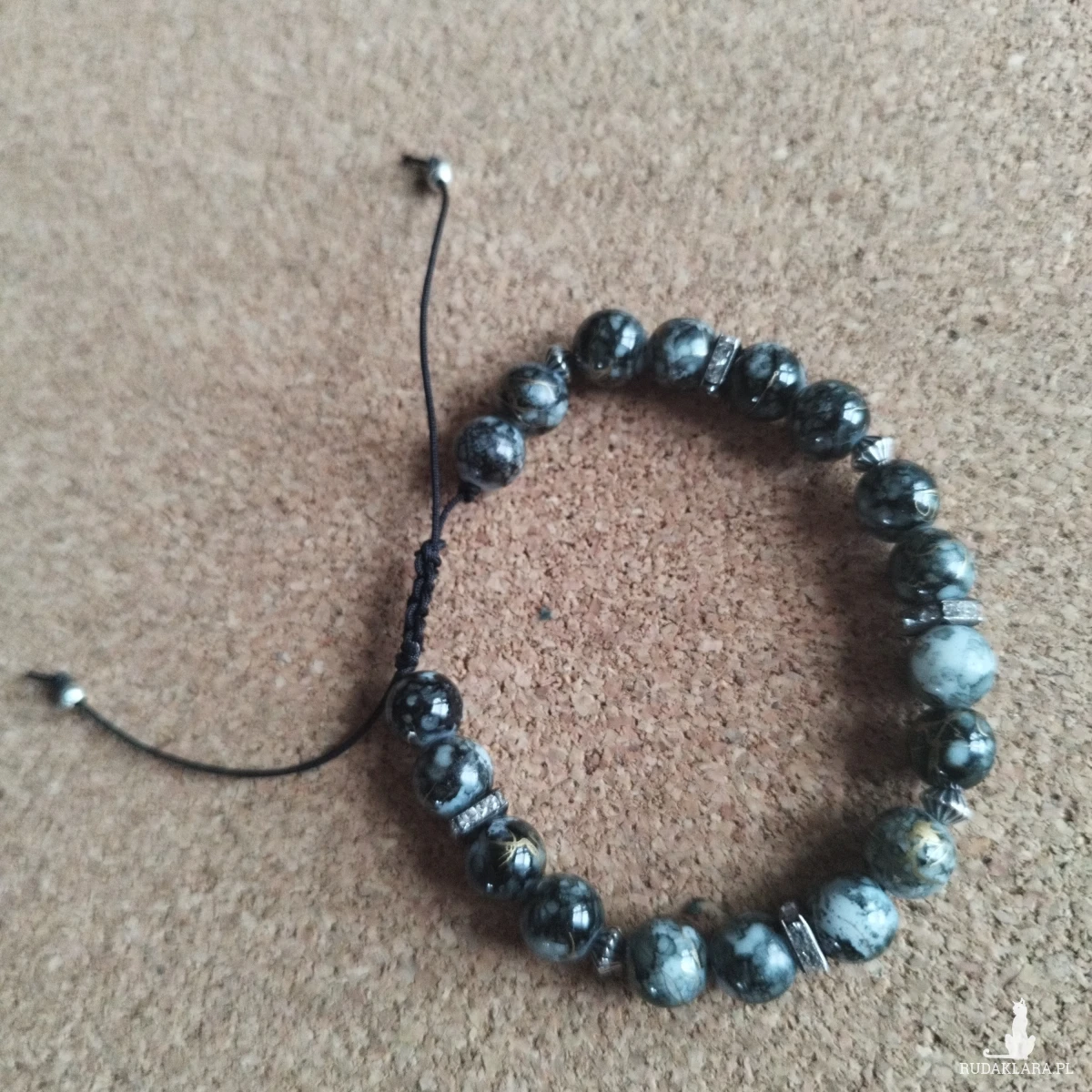 Bransoletka z koralików marmurkowych w kolorze szarym z przekładkami z kryształkami. Regulowana na sznurku