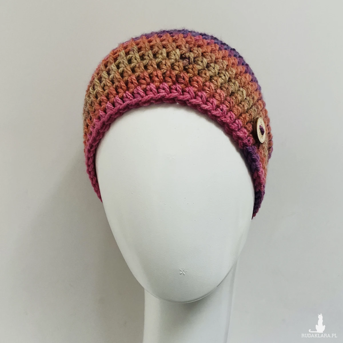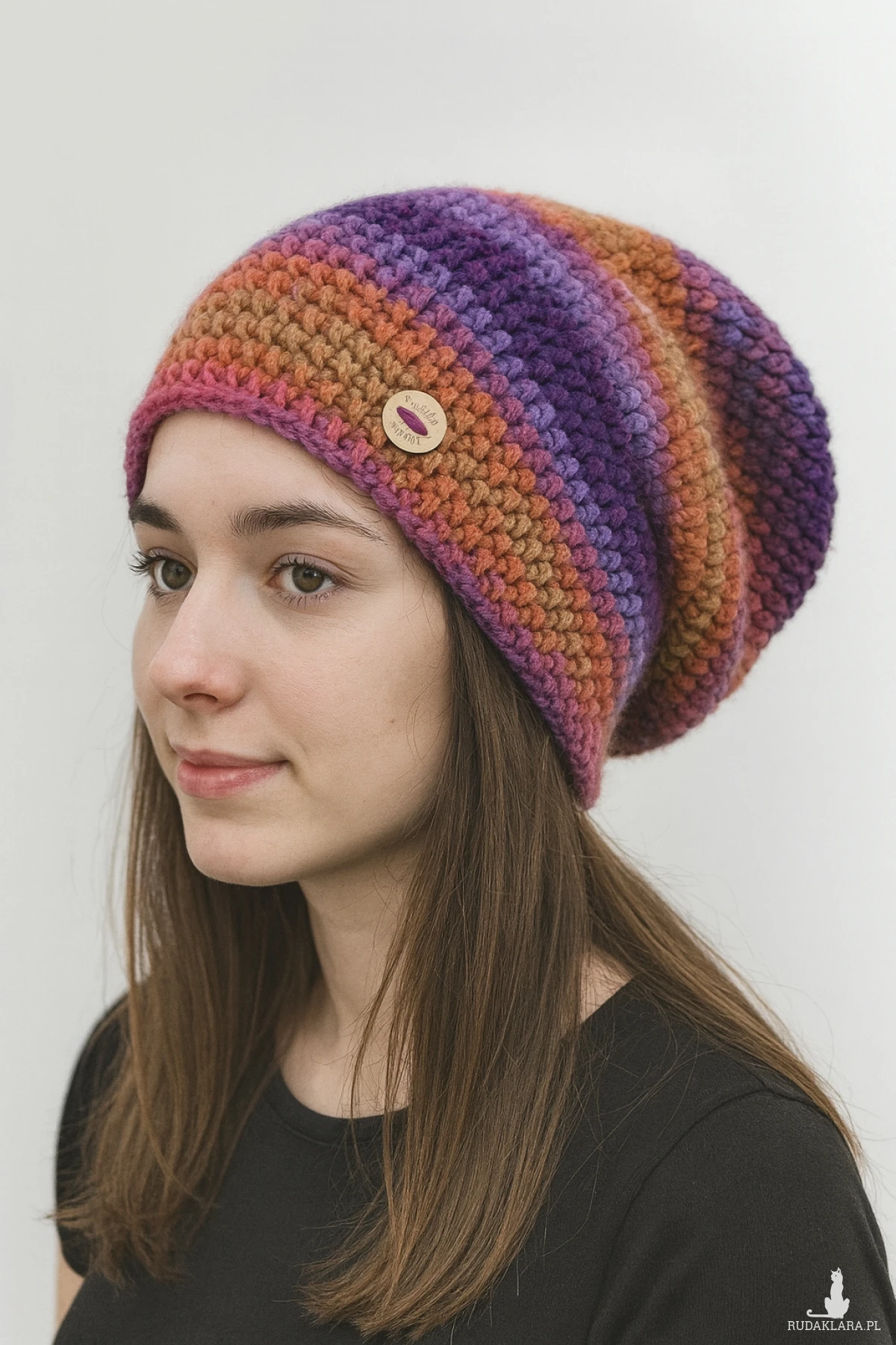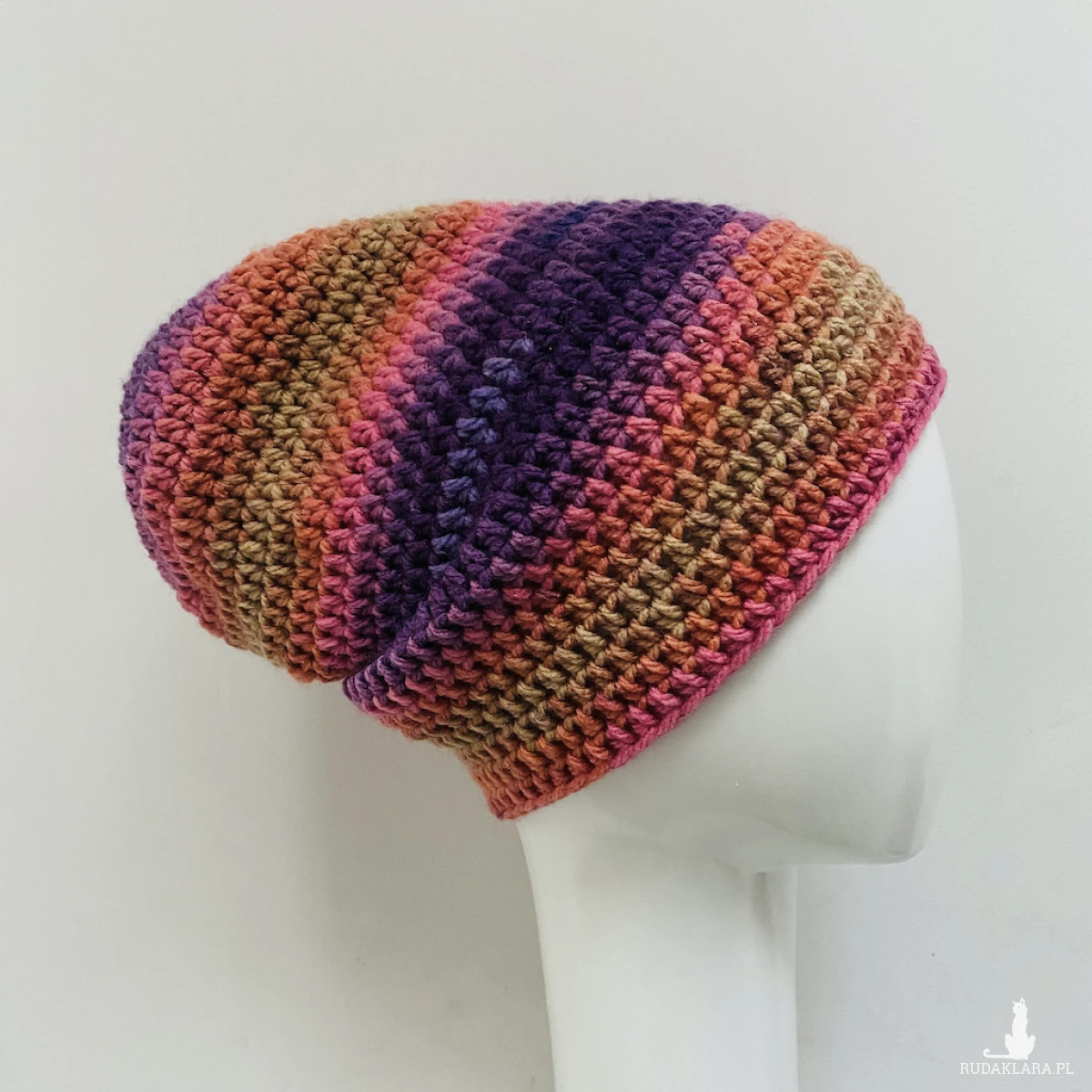 Czapkę wykonałam na szydełku z wysokiej jakości kolorowej włóczki akrylowej, z certyfikatem OEKO-TEX® Standard 100, który potwierdza, że jest bezpieczna dla zdrowia i nie zawiera niebezpiecznych substancji.