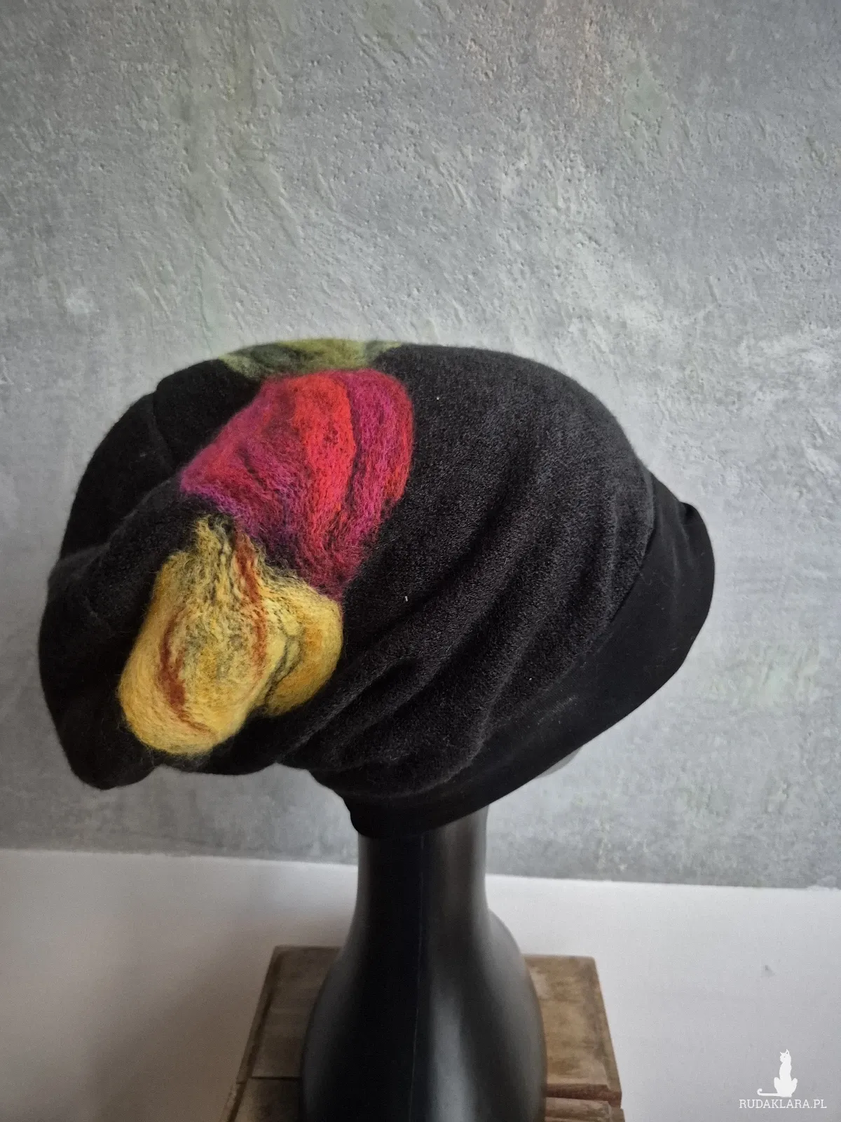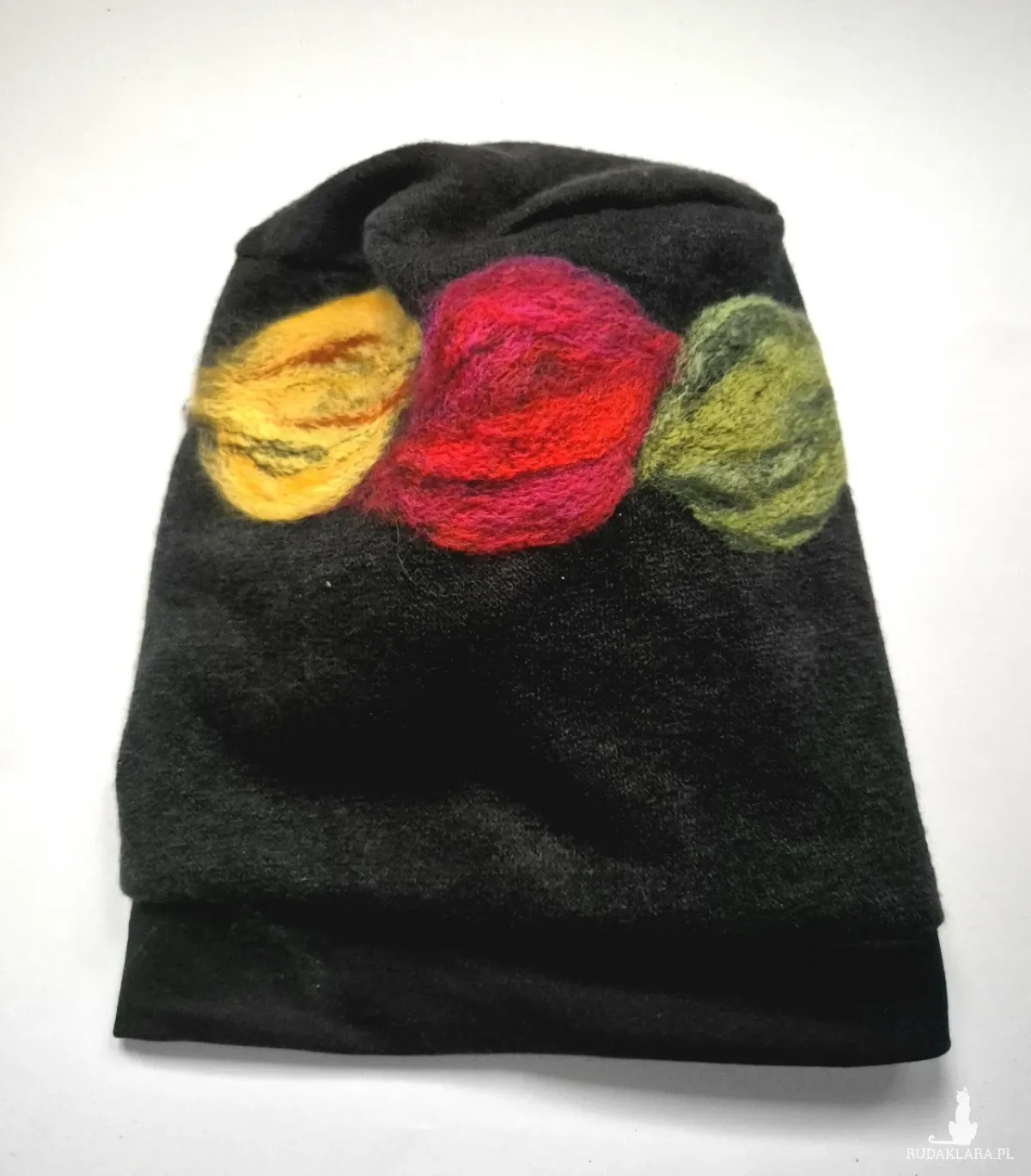czapka wełniana filcowana zimowa czarna Smerfetka wykończona ściągaczem handmade w kwiaty na podszewce-- rozmiar uniwersalny, wełniana, filcowana wełną merynosów, bardzo ciepła, fantastyczna, miła, miękko układa się na głowie, niesamowicie zwraca uwagę, doskonałą na codzienne noszenie jak i na prezent, zawsze możesz ją założyć po basenie i przeżyjesz,box a1