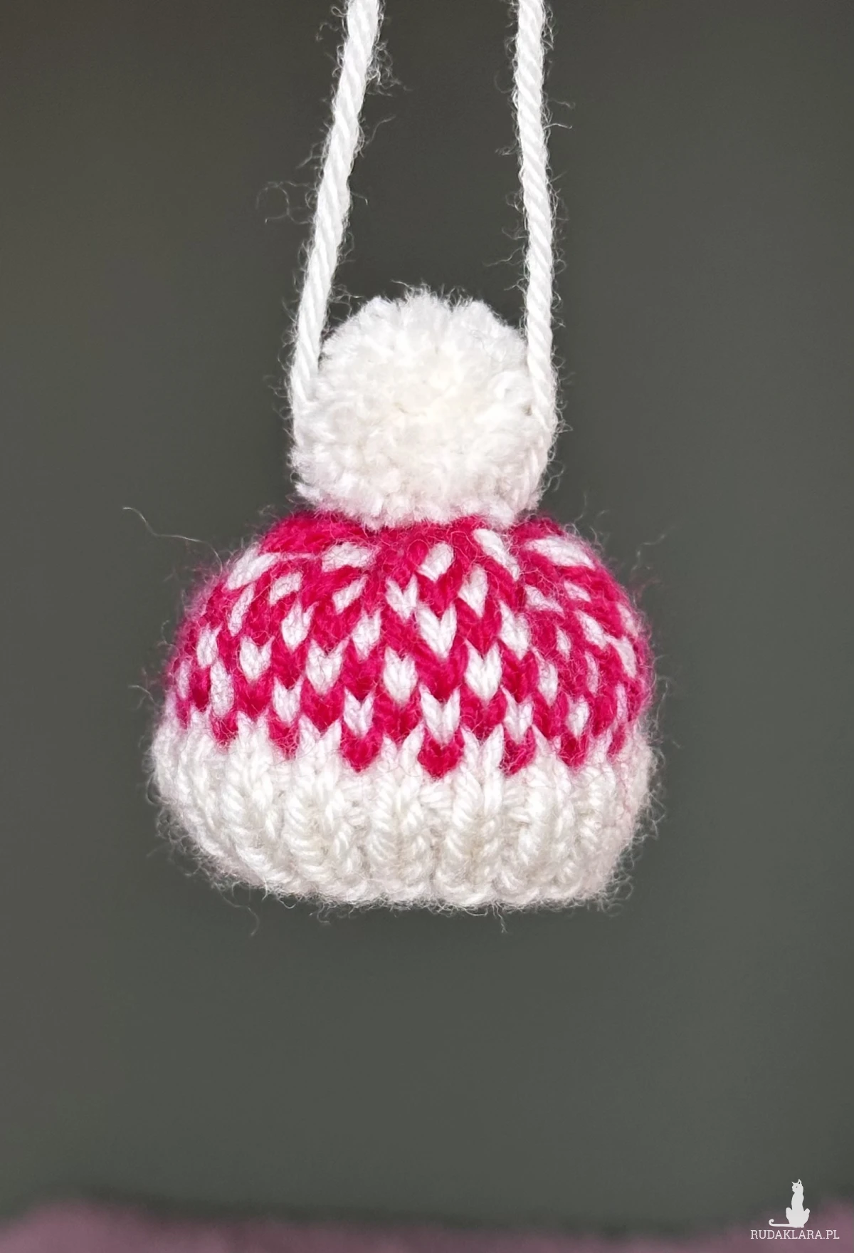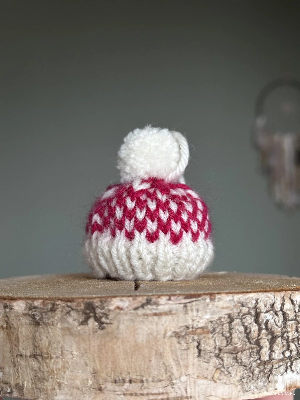 Kolorystyka czapeczki: biały ściągacz i pompon, malinowo-biała baza.