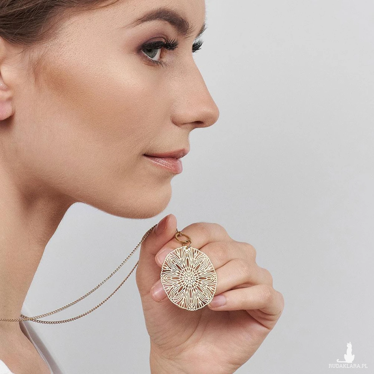 Naszyjnik z okrągłym, ażurowym wisiorkiem, który swoim designem przywodzi na myśl orientalną mandalę. Za sprawą swojego delikatnego, złotego blasku ażurowy naszyjnik doda właścicielce nienachalnej elegancji oraz pewności siebie. Został wykonane z bezpiecznego mosiądzu, który nie zawiera niklu, ołowiu ani kadmu. Będzie trafionym dodatkiem do stylizacji lub sprawią radość bliskiej osobie, która ceni sobie ponadczasową biżuterię.