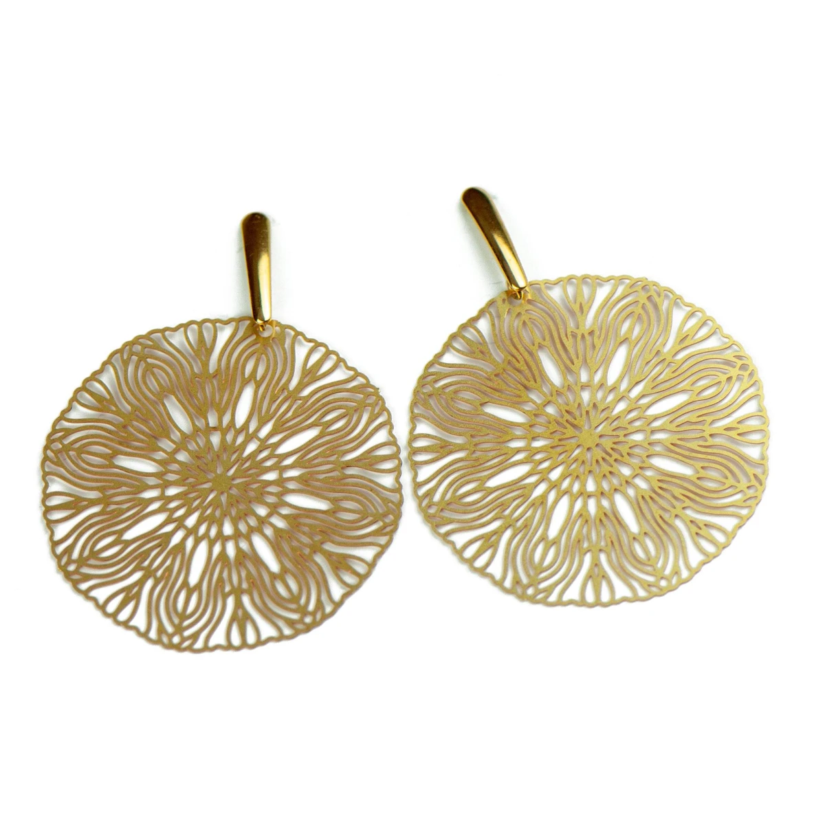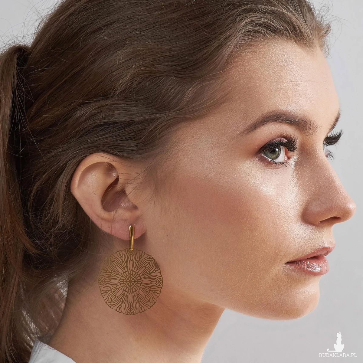 Okrągłe, ażurowe kolczyki, które swoim designem przywodzą na myśl orientalną mandalę. Za sprawą swojego delikatnego, złotego blasku ażurowe kolczyki dodadzą właścicielce nienachalnej elegancji oraz pewności siebie. Zostały wykonane z bezpiecznego mosiądzu, który nie zawiera niklu, ołowiu ani kadmu. Kolczyki są bardzo lekkie, co za tym idzie - charakteryzują się wysokim komfortem noszenia. Będą trafionym dodatkiem do stylizacji lub sprawią radość bliskiej osobie, która ceni sobie ponadczasową biżuterię.