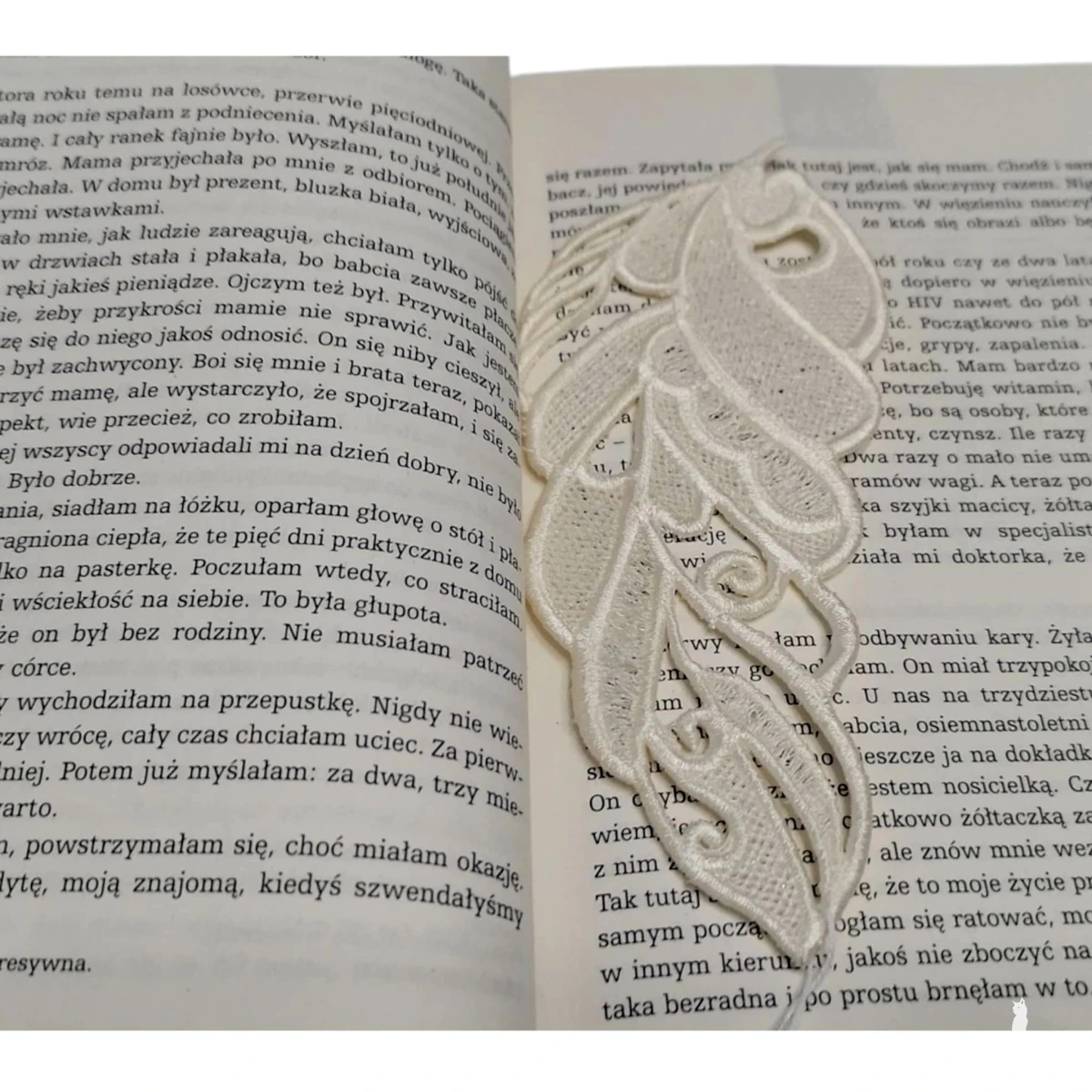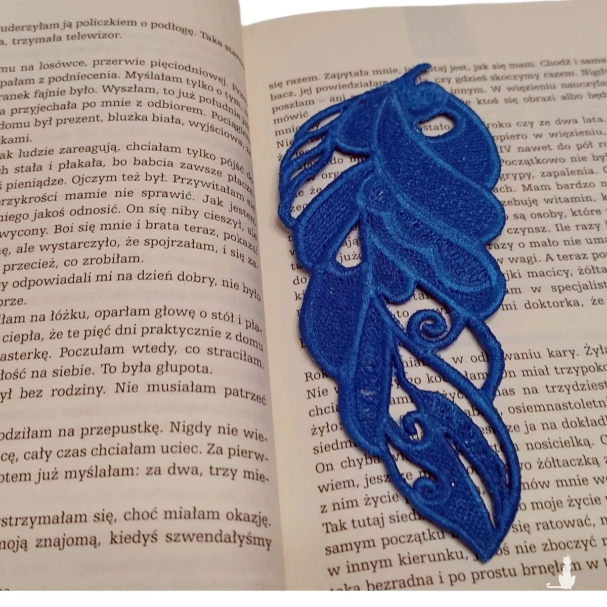 Oryginalna, haftowana zakładka do książek w kształcie pióra. Zakładka jest jedyna w swoim rodzaju. Jest bardzo lekka, doskonale trzyma kształt i jest sztywna.