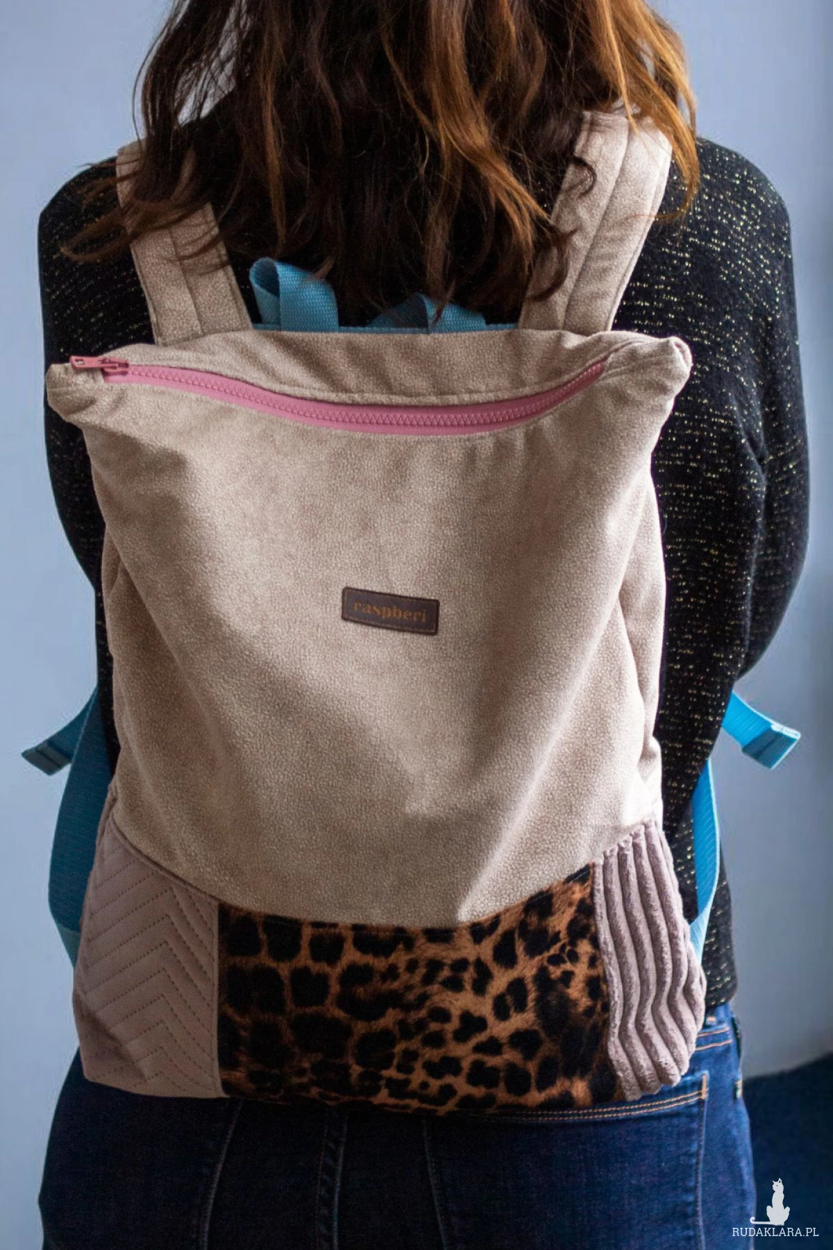 Duży, damski plecak miejski zapinany na suwak z kilku rodzajów kolorowych tkanin w połączeniu z welurem w panterkę.
