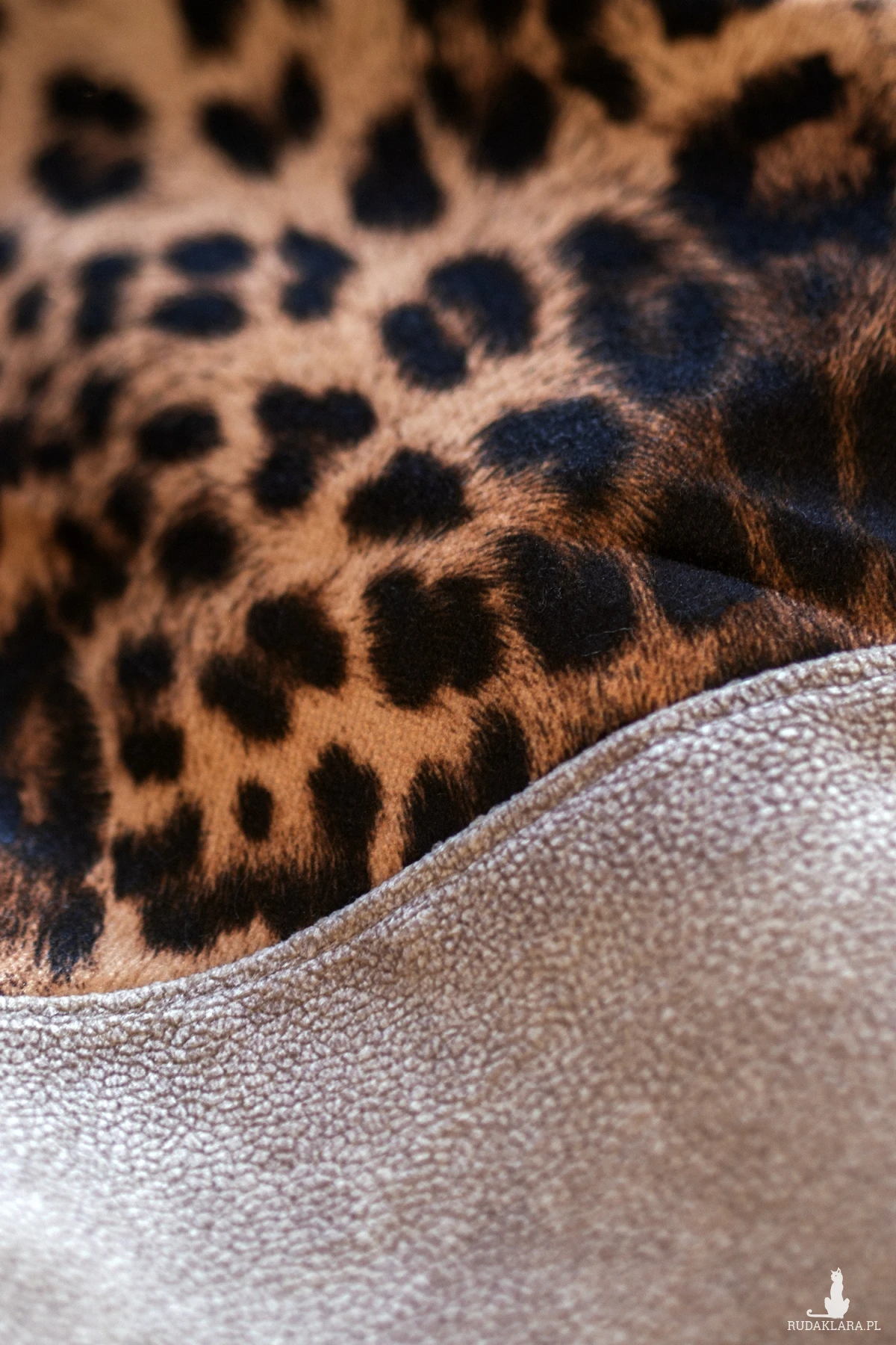 Duży, damski plecak miejski zapinany na suwak wykonany z beżowego weluru i weluru w panterkę.