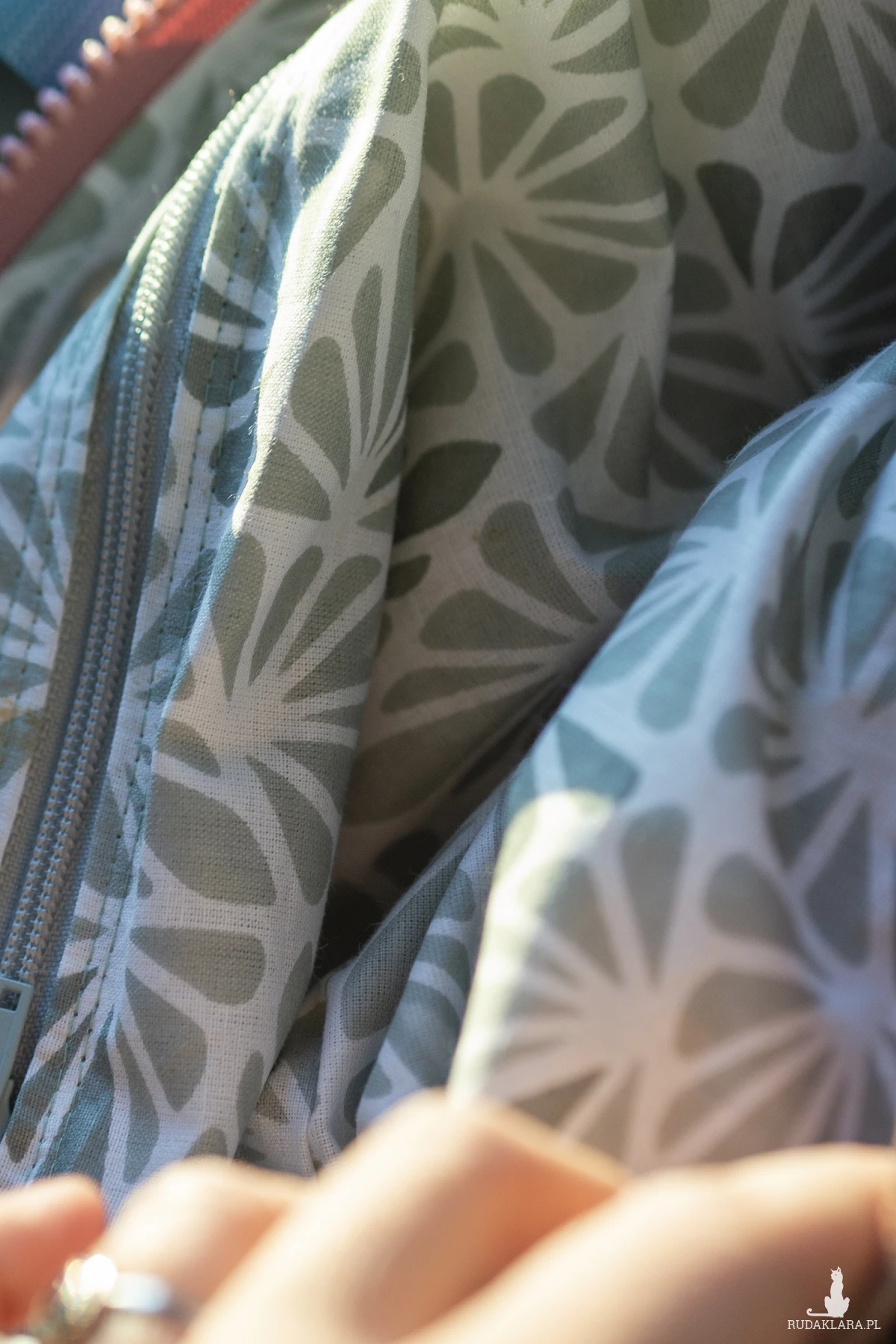 Regulowane paski. W środku wzorzysta, bawełniana podszewka oraz mała kieszonka na suwak.