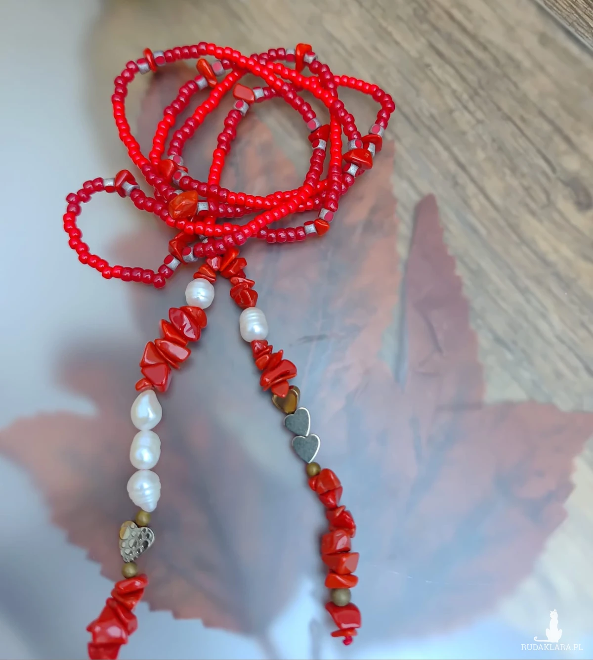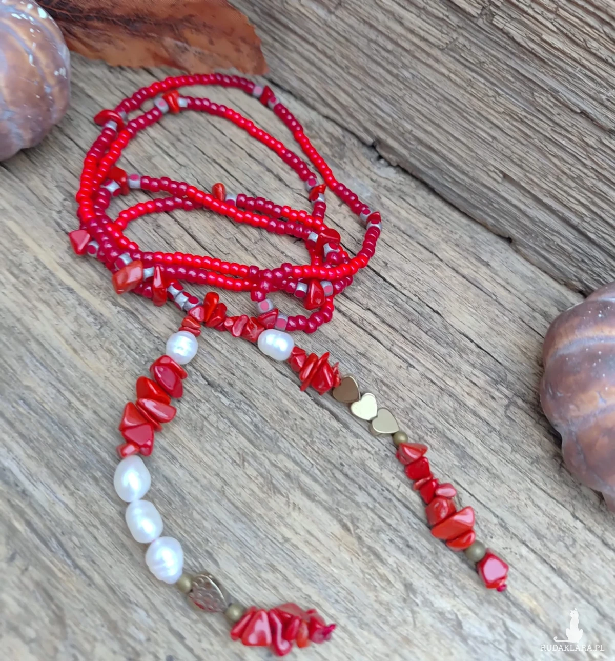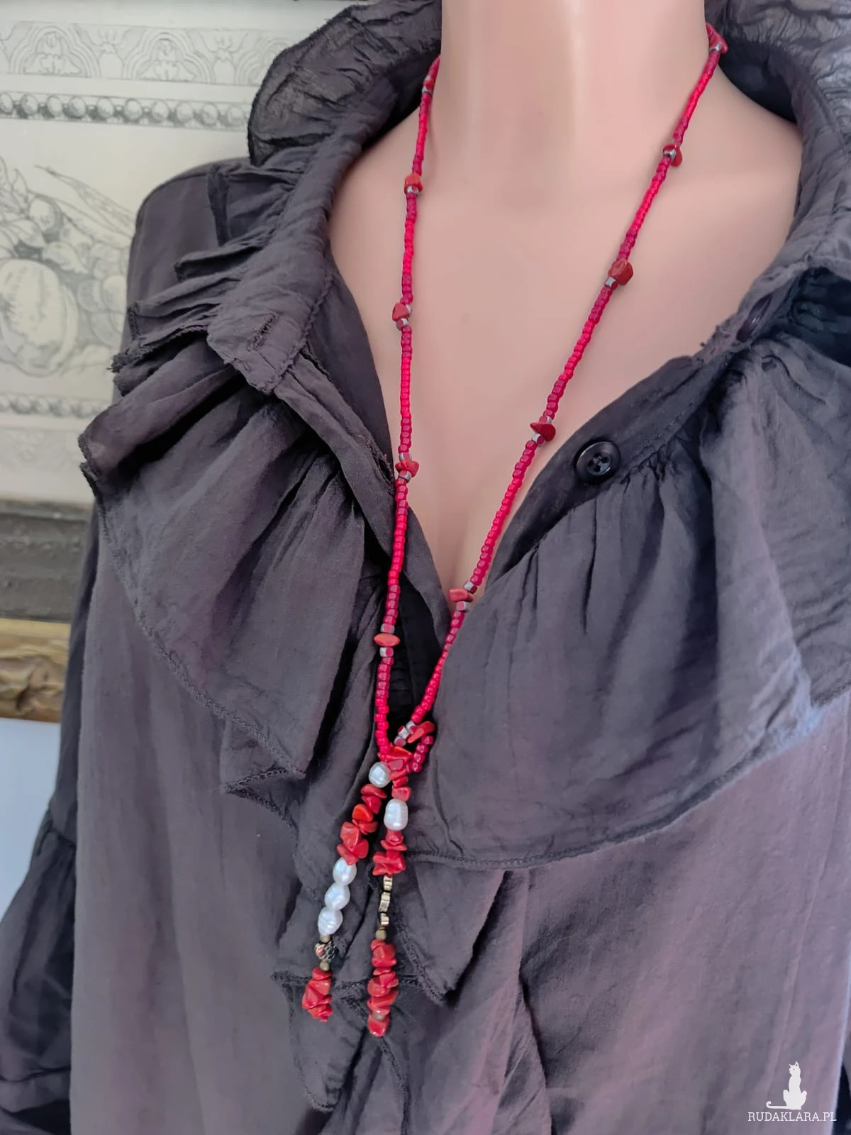 Naszyjnik długi z koralików. Koraliki szklane, czerwone różne i koral