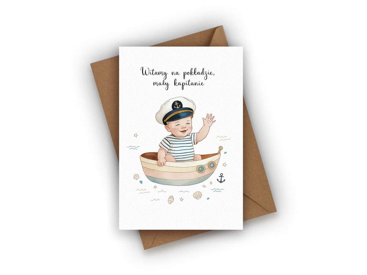 Kartka z okazji narodzin dziecka - Witamy na pokładzie Mały Kapitanie