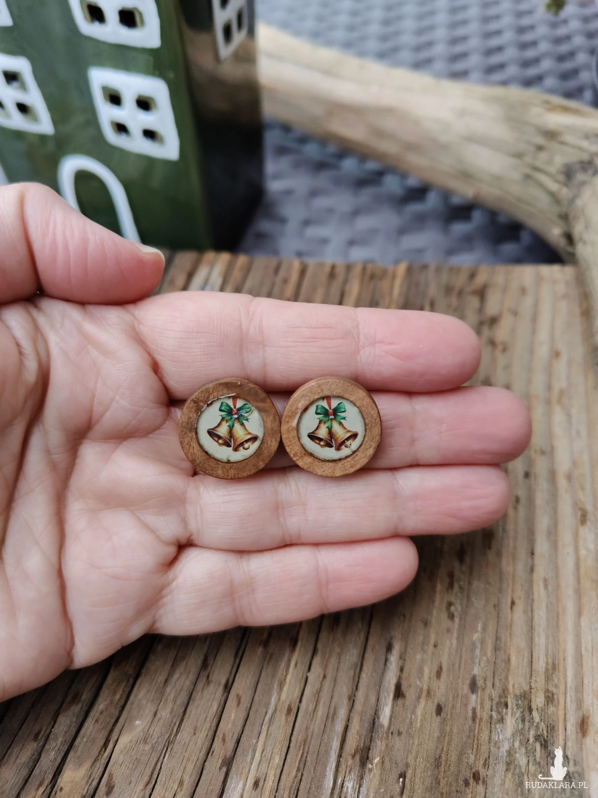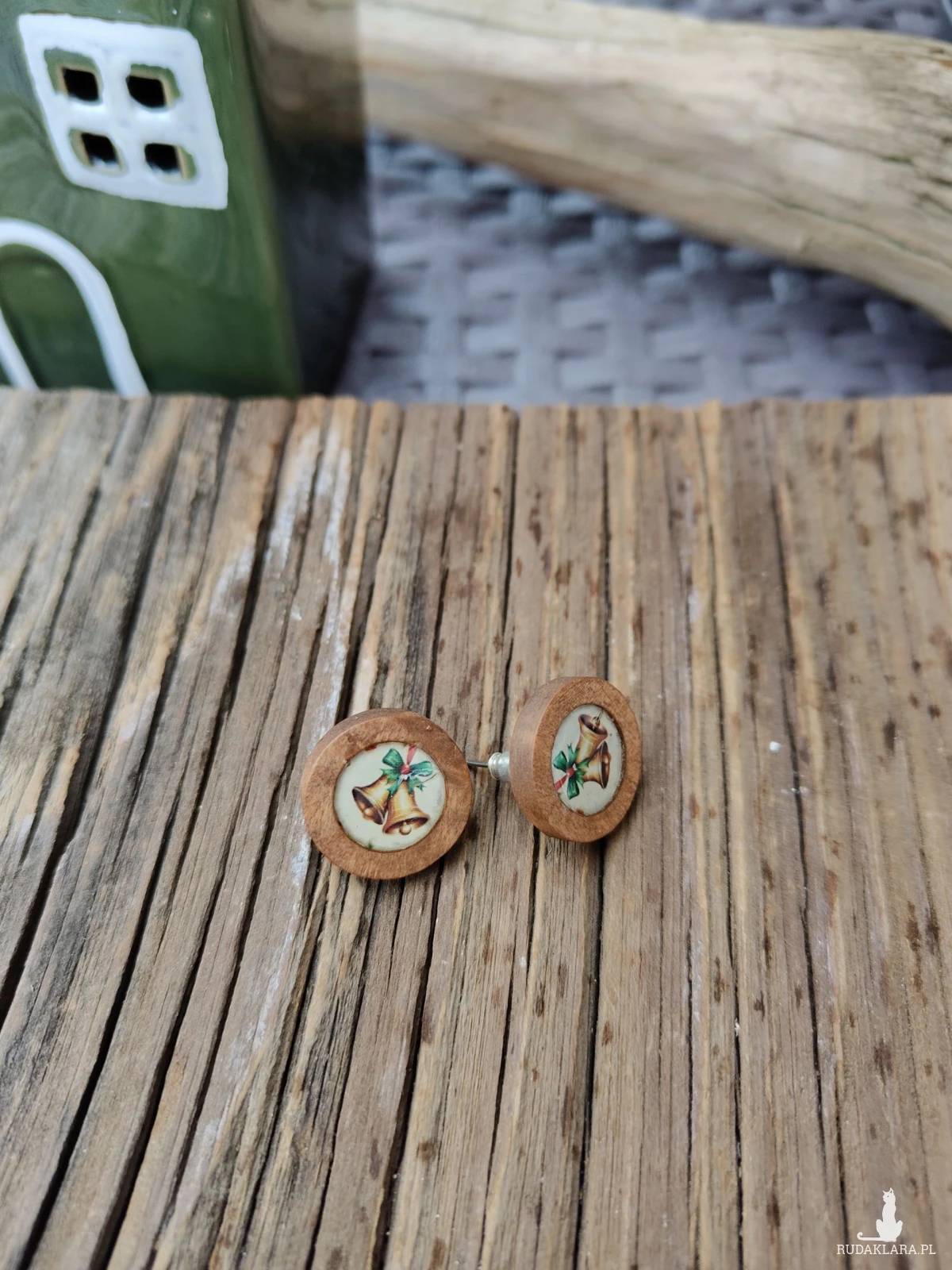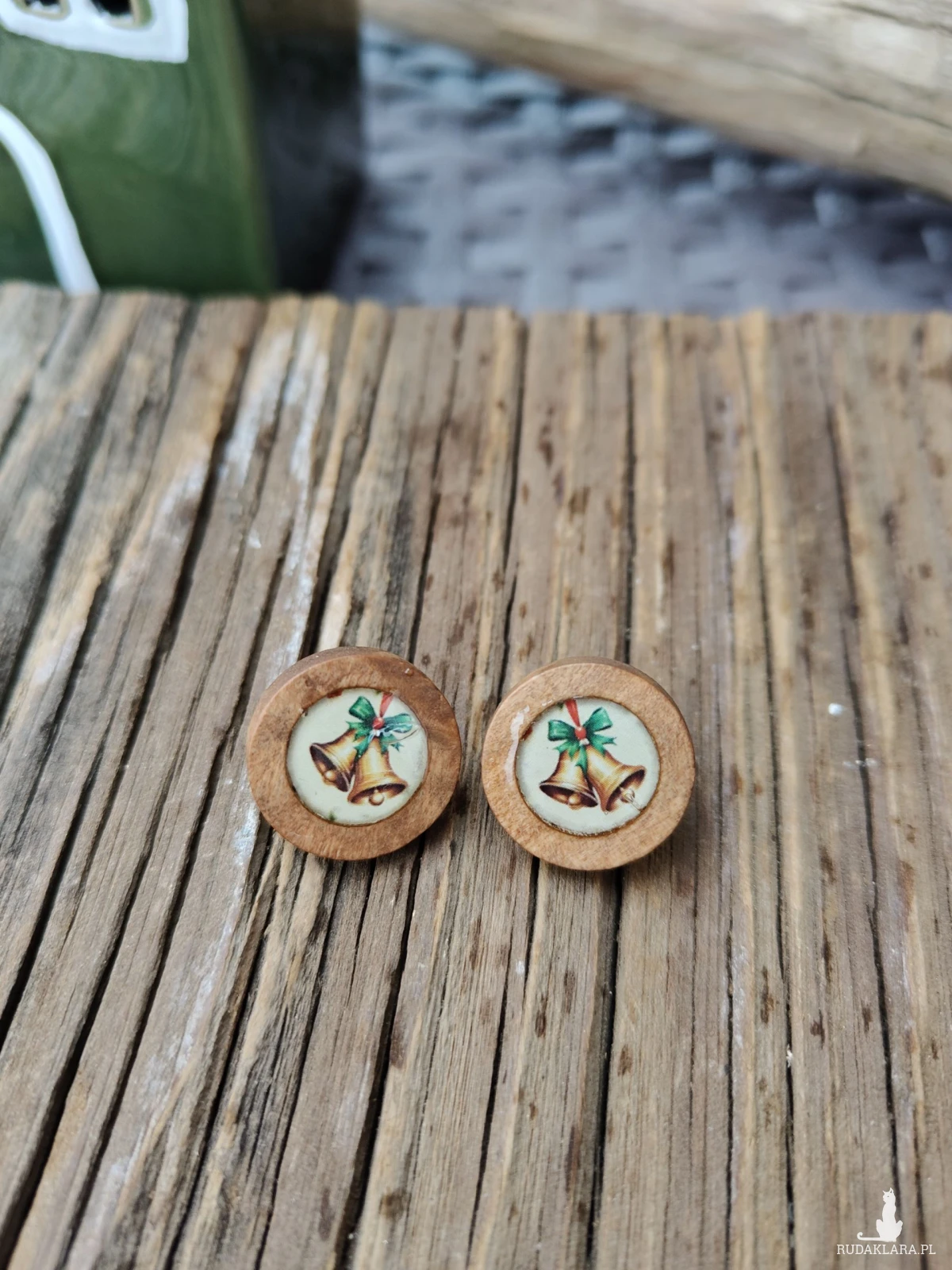 Te urokliwe kolczyki "Złote Dzwonki" to idealny dodatek na świąteczny czas. Wykonane z naturalnego drewna, każda para ma okrągłą ramkę, w której umieszczono piękny, drukowany wzór przedstawiający dwa złote dzwonki związane zieloną wstążką. Ich delikatny, bożonarodzeniowy motyw sprawia, że są doskonałym wyborem na świąteczne przyjęcia lub jako prezent dla bliskiej osoby.