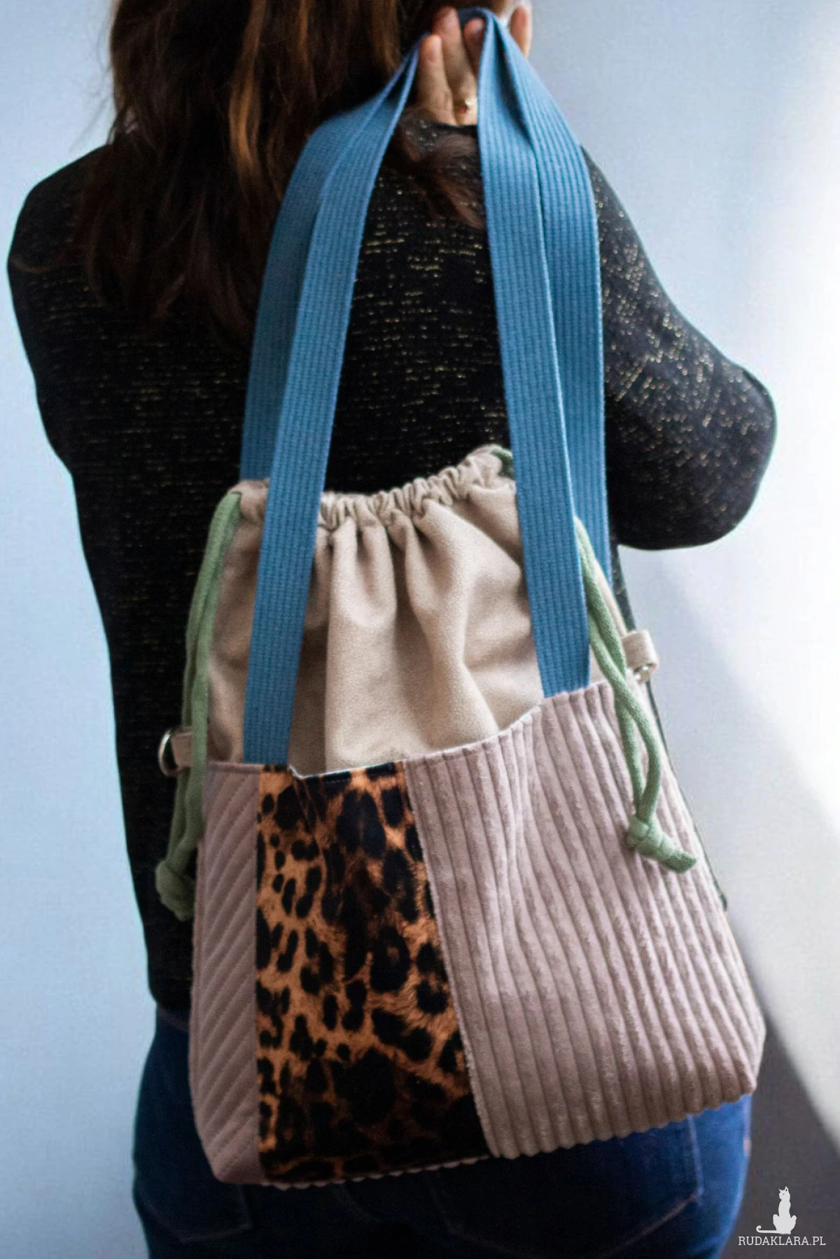 Torba worek wykonana z weluru, weluru w panterkę, pikowanego różowego weluru oraz grubego sztruksu. Stworzona w duchu no waste.