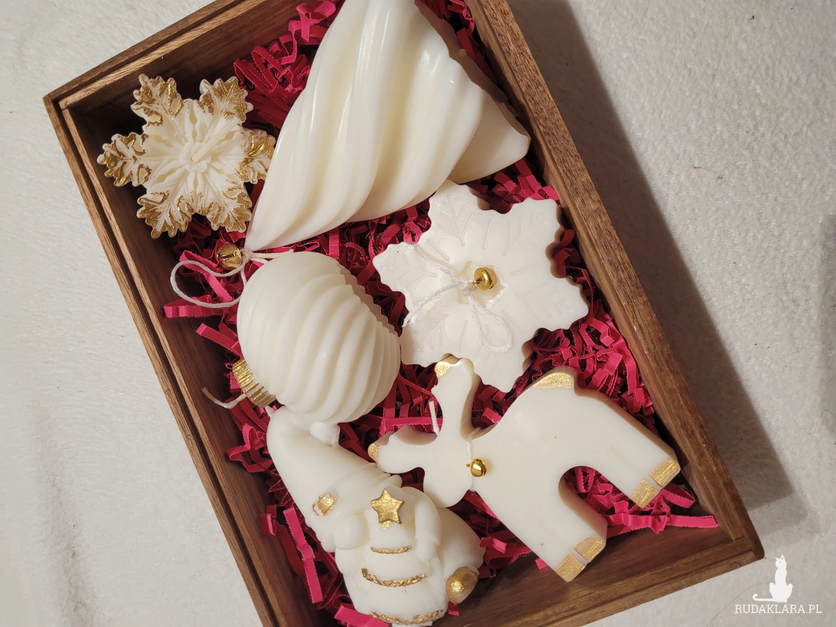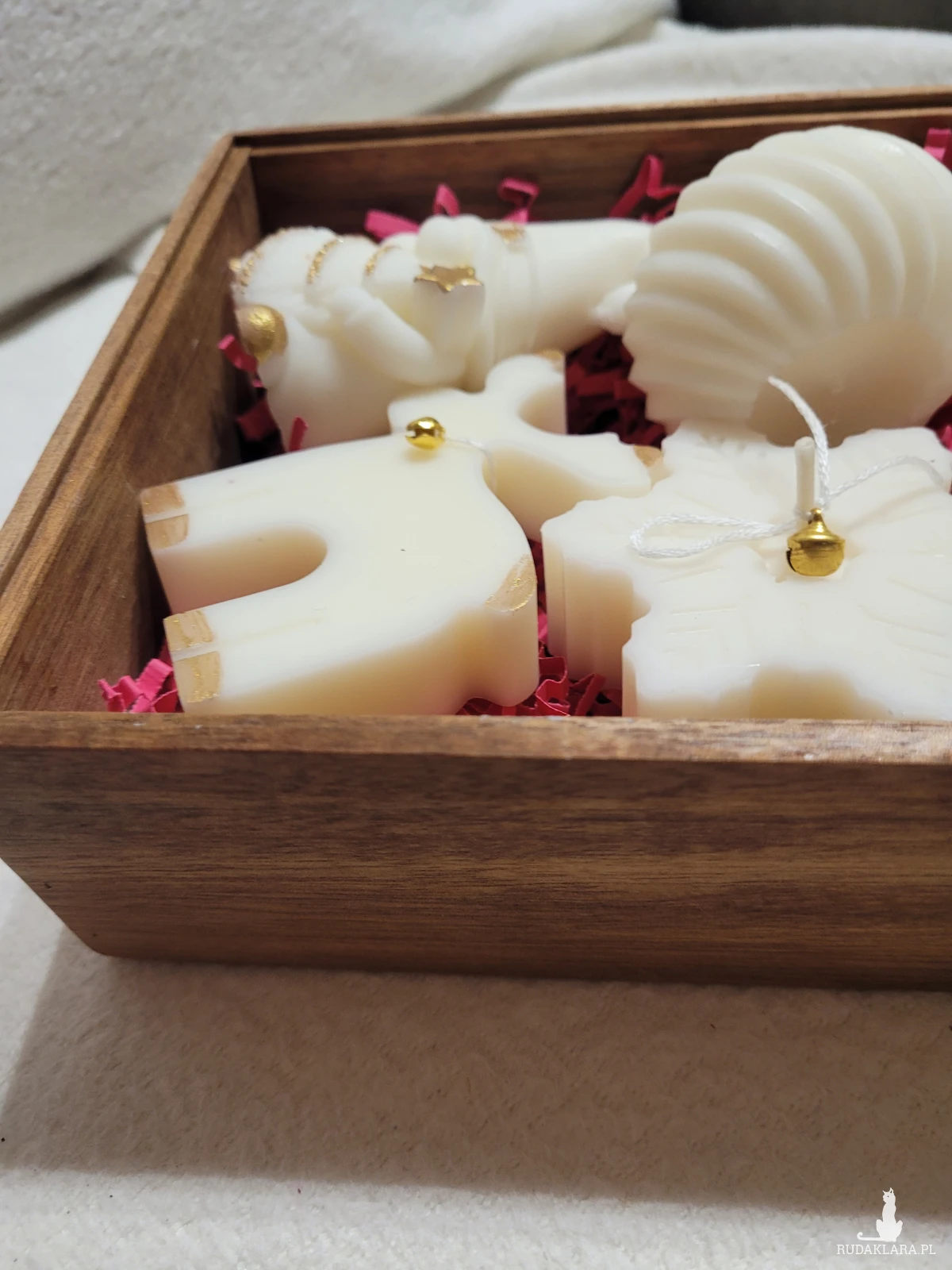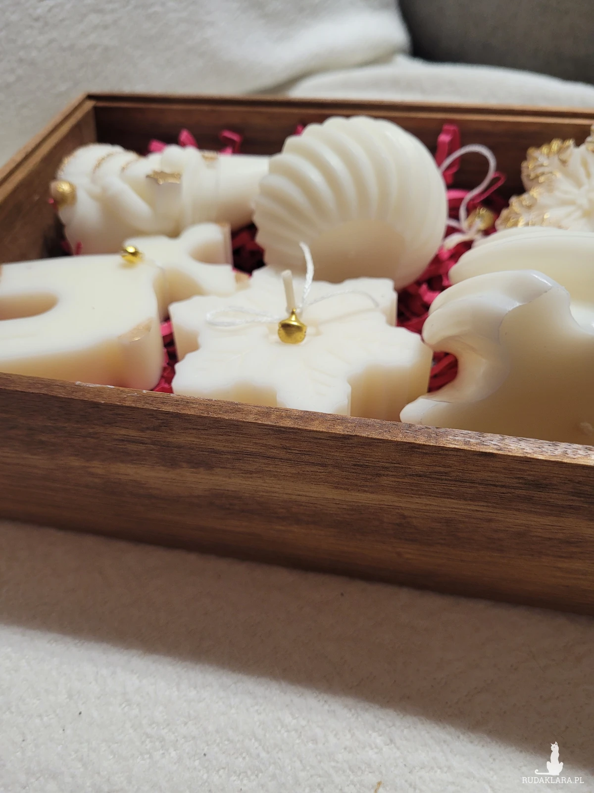 Box upominkowy ze świecami sojowymi w skrzynce z drewna akacjowego.
