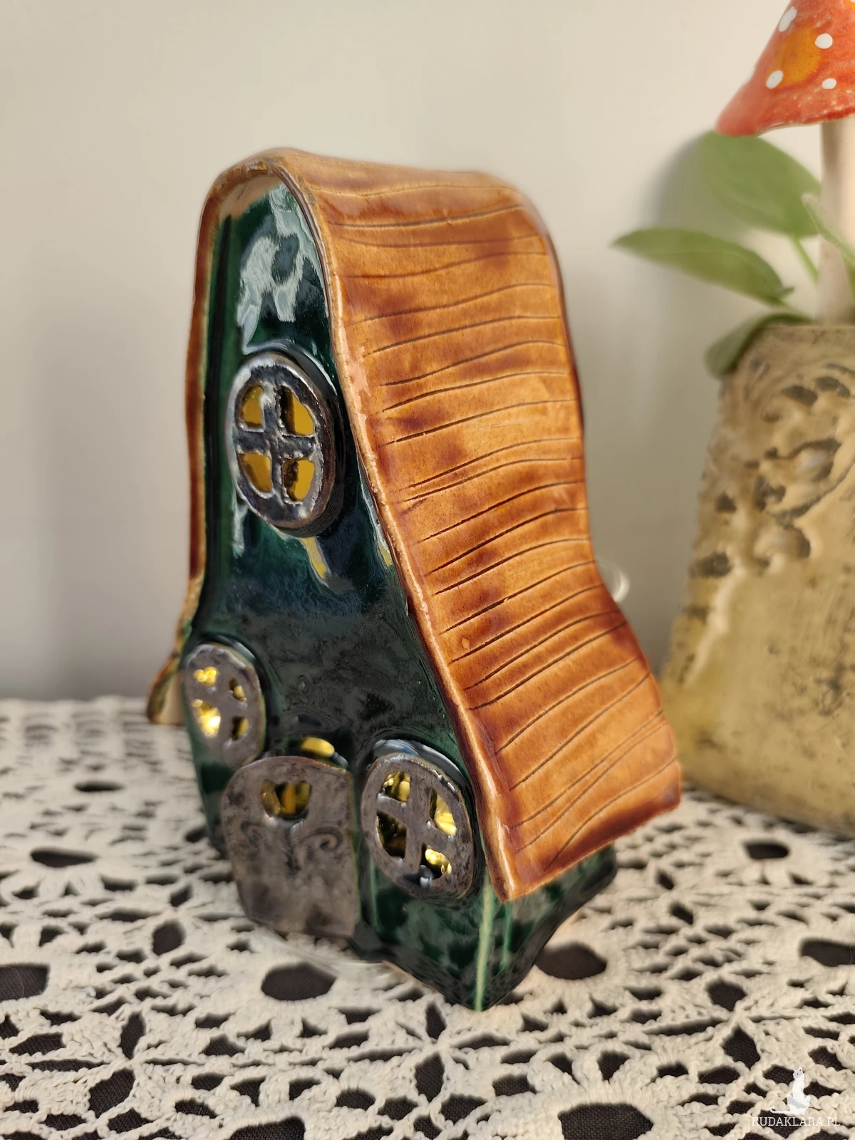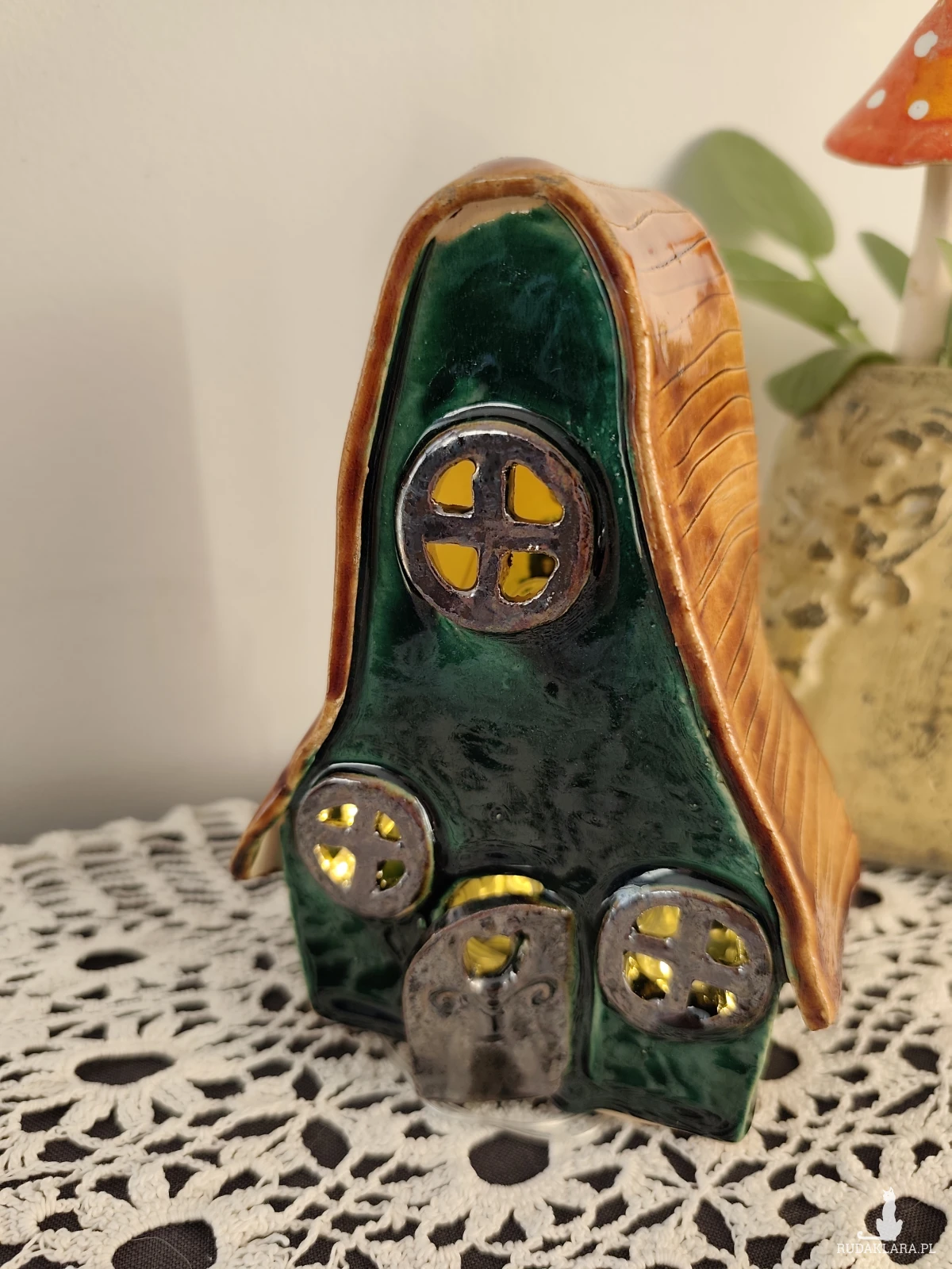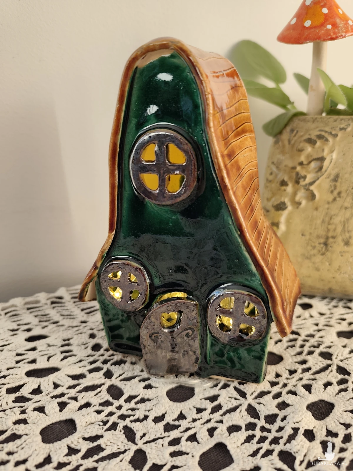 Ręcznie wykonana chatka ceramiczna - lampion, szkliwiona i dwukrotnie wypalana w piecu ceramicznym na wysoką temperaturę. W pięknych jesiennych barwach. Wysokość 17 cm.