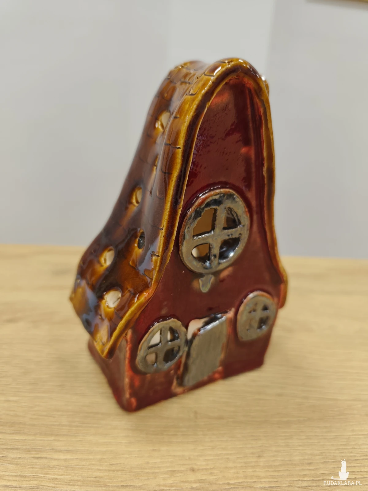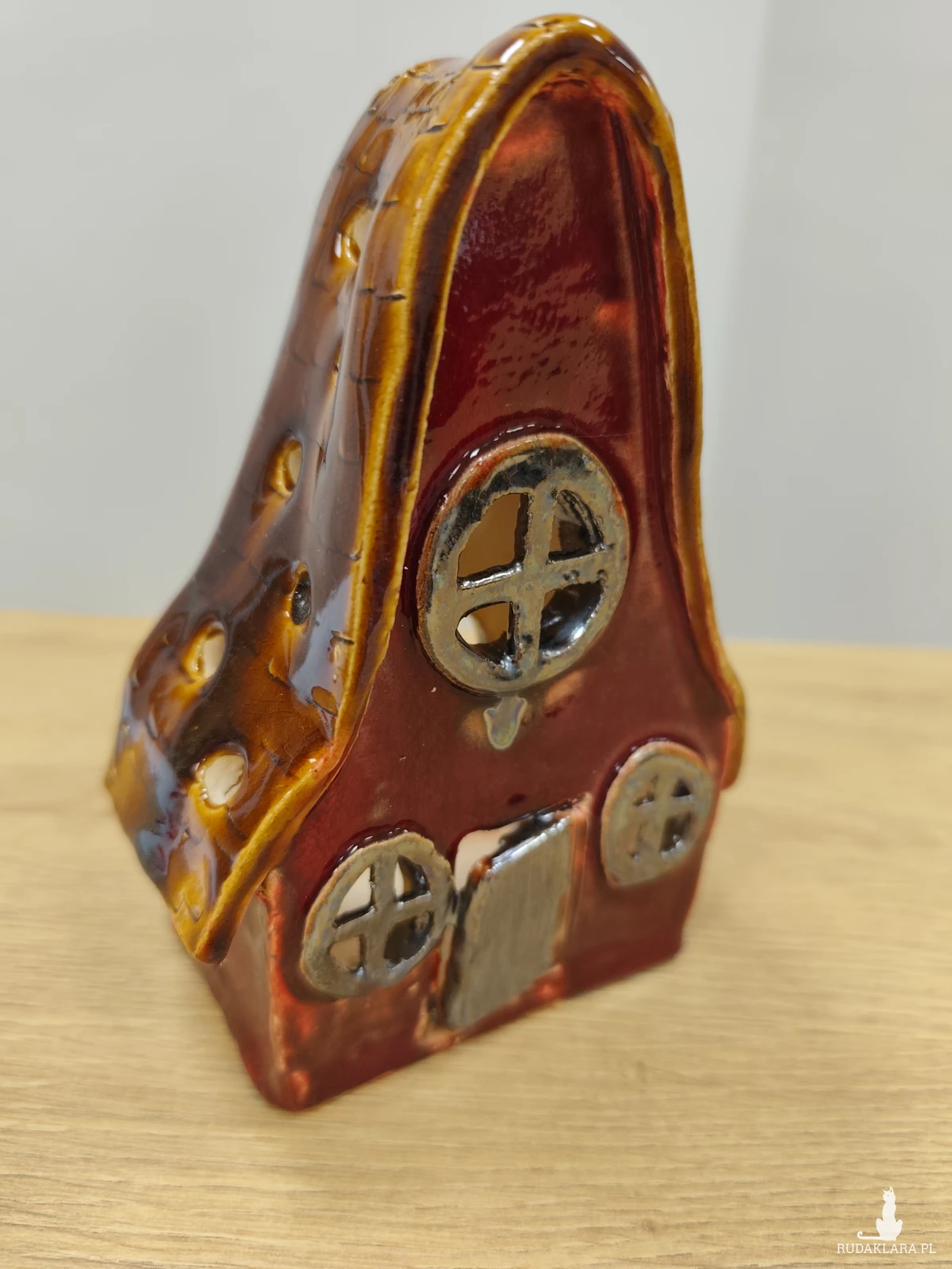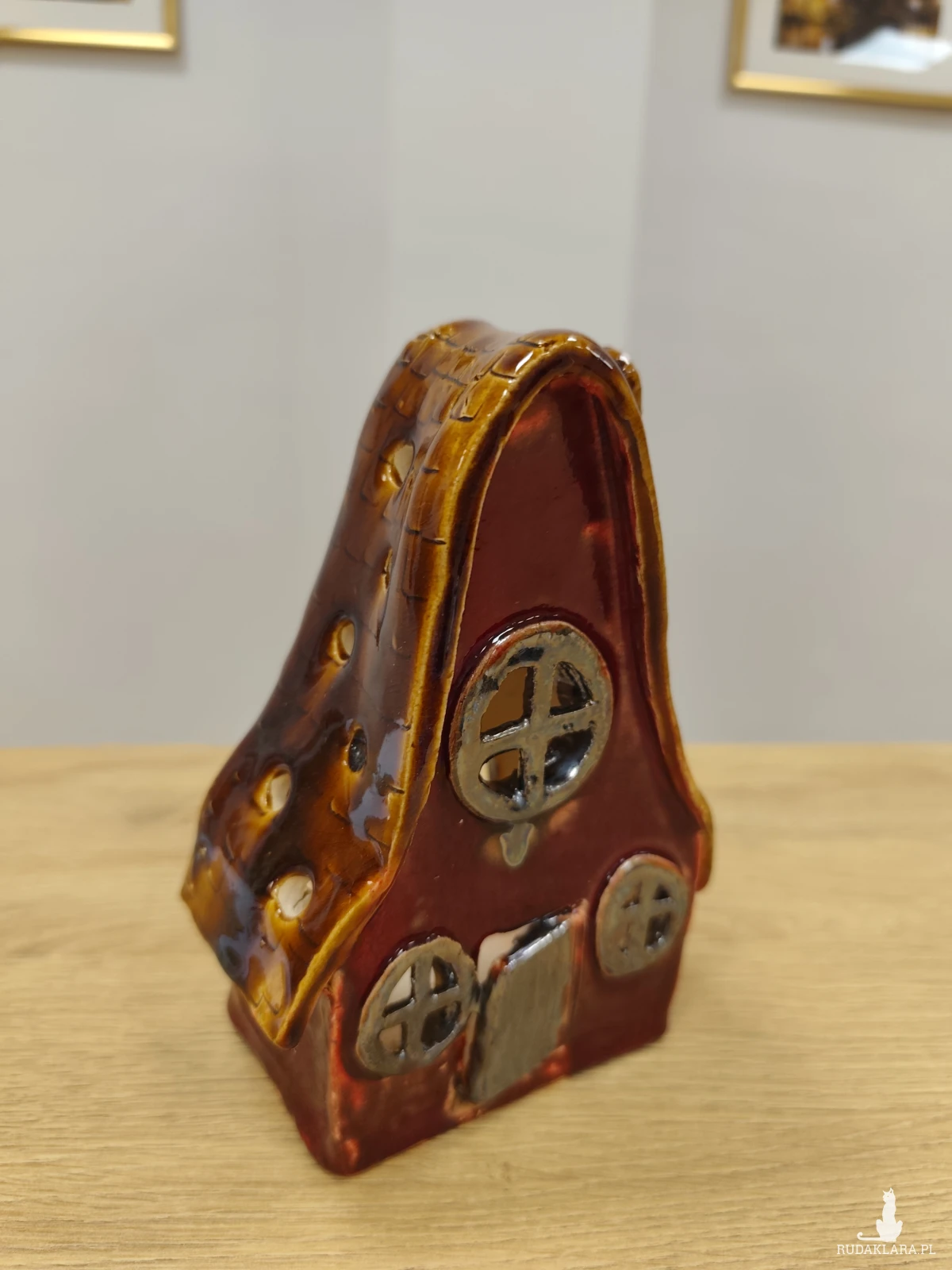 Ręcznie wykonana chatka ceramiczna - lampion, szkliwiona i dwukrotnie wypalana w piecu ceramicznym na wysoką temperaturę. W pięknych jesiennych barwach. Wysokość 17 cm.