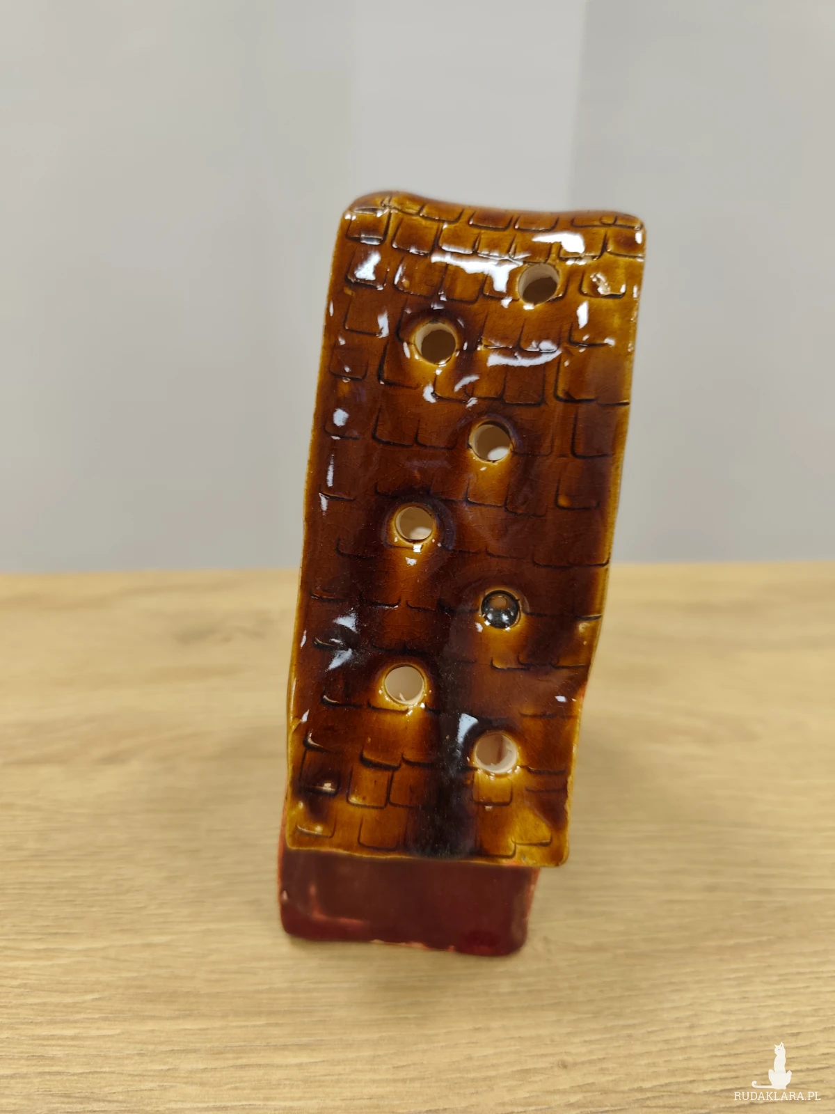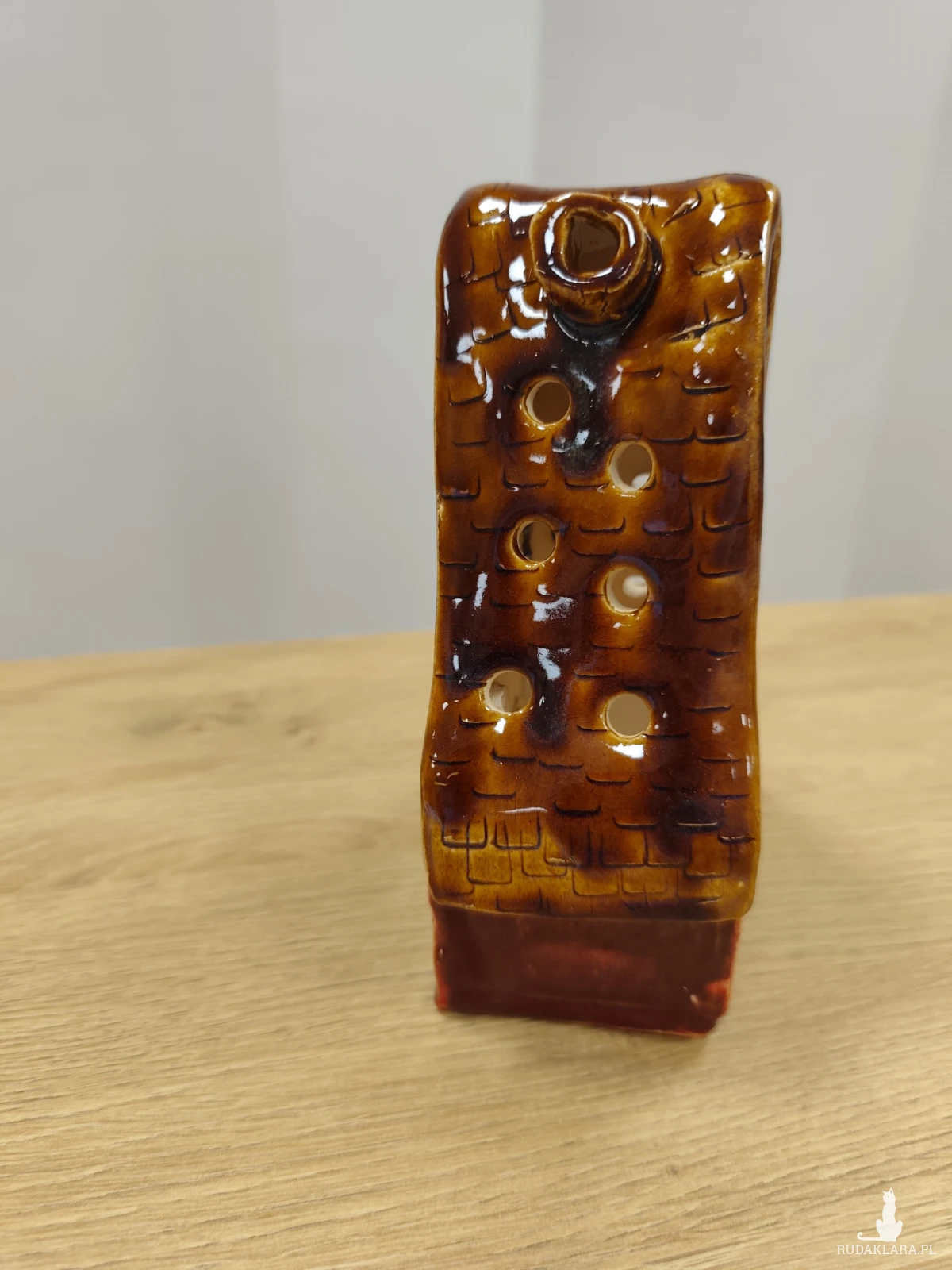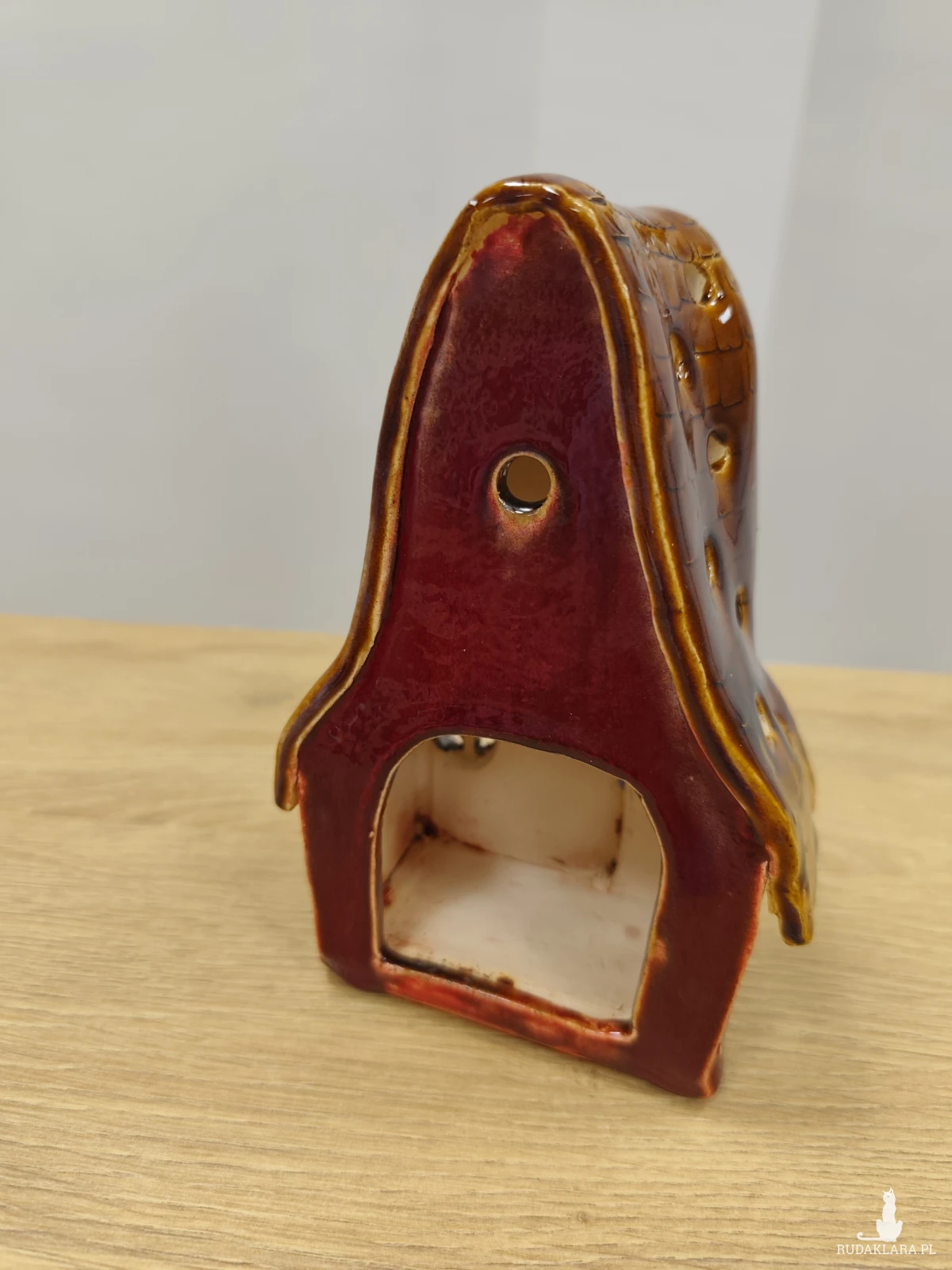 Ręcznie wykonana chatka ceramiczna - lampion, szkliwiona i dwukrotnie wypalana w piecu ceramicznym na wysoką temperaturę. W pięknych jesiennych barwach. Wysokość 17 cm.